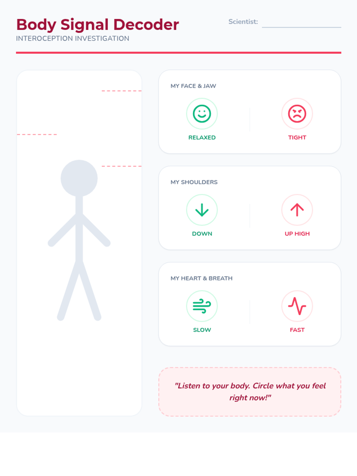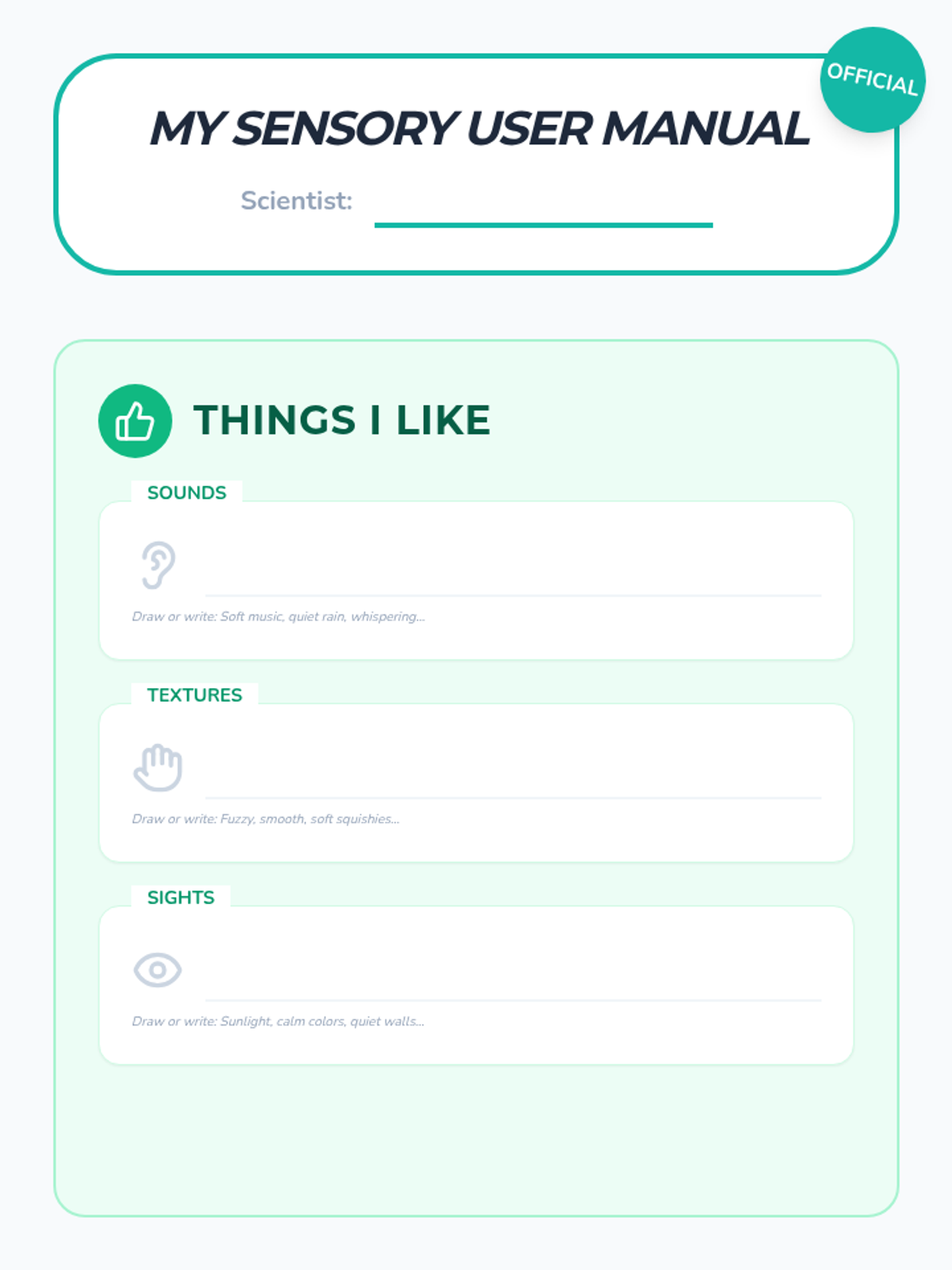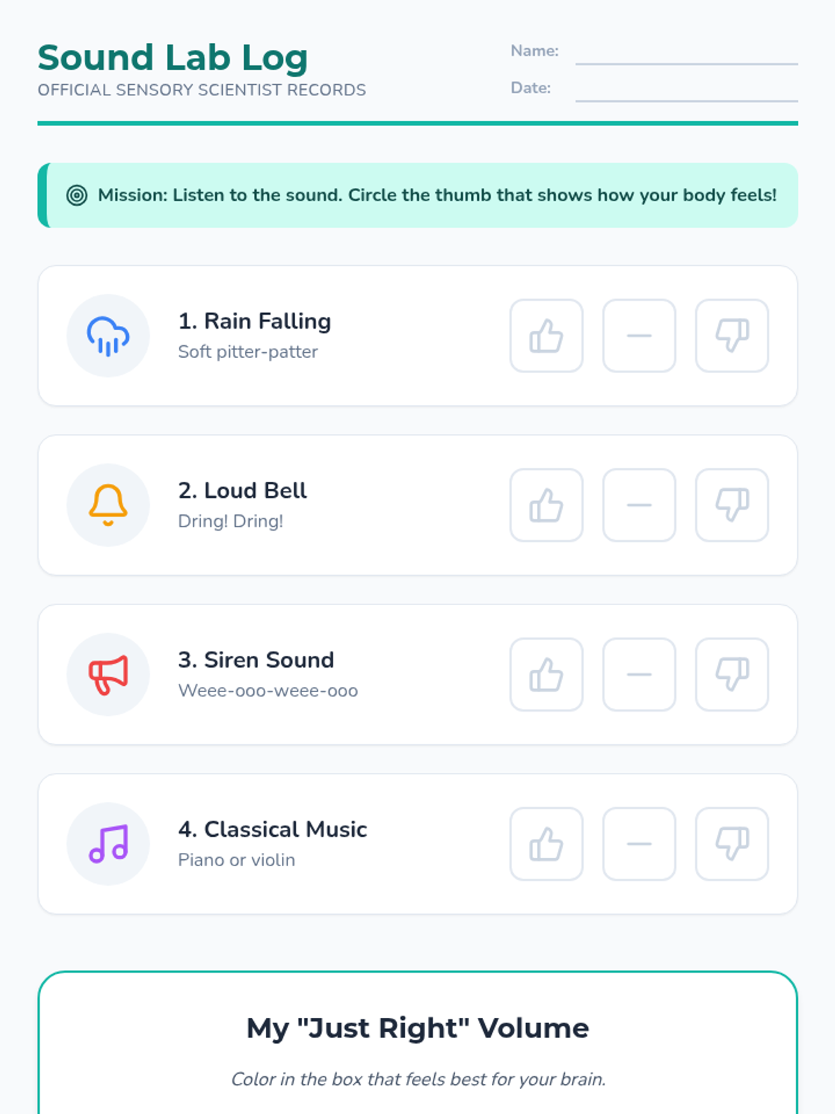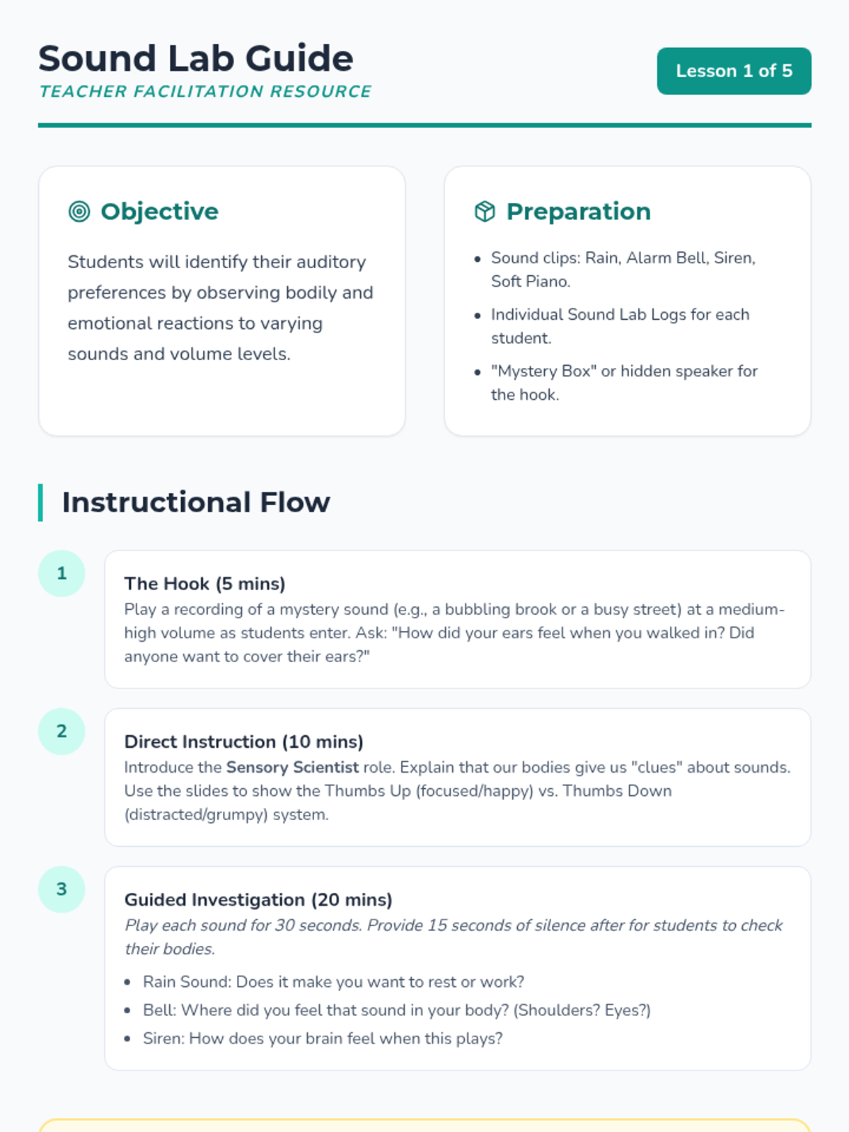 A 5-lesson sequence for 1st-grade students to identify their sensory preferences across auditory, tactile, and visual inputs. Students act as 'Sensory Scientists' to understand how different environments affect their focus and comfort, culminating in a personal 'Sensory User Manual'.
