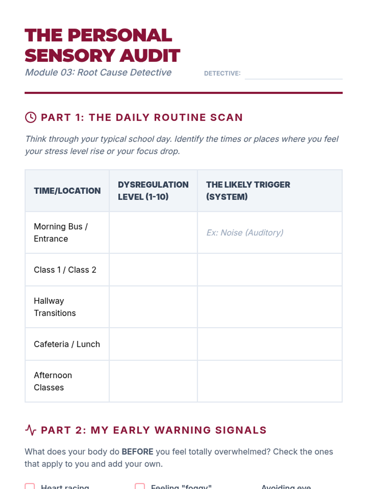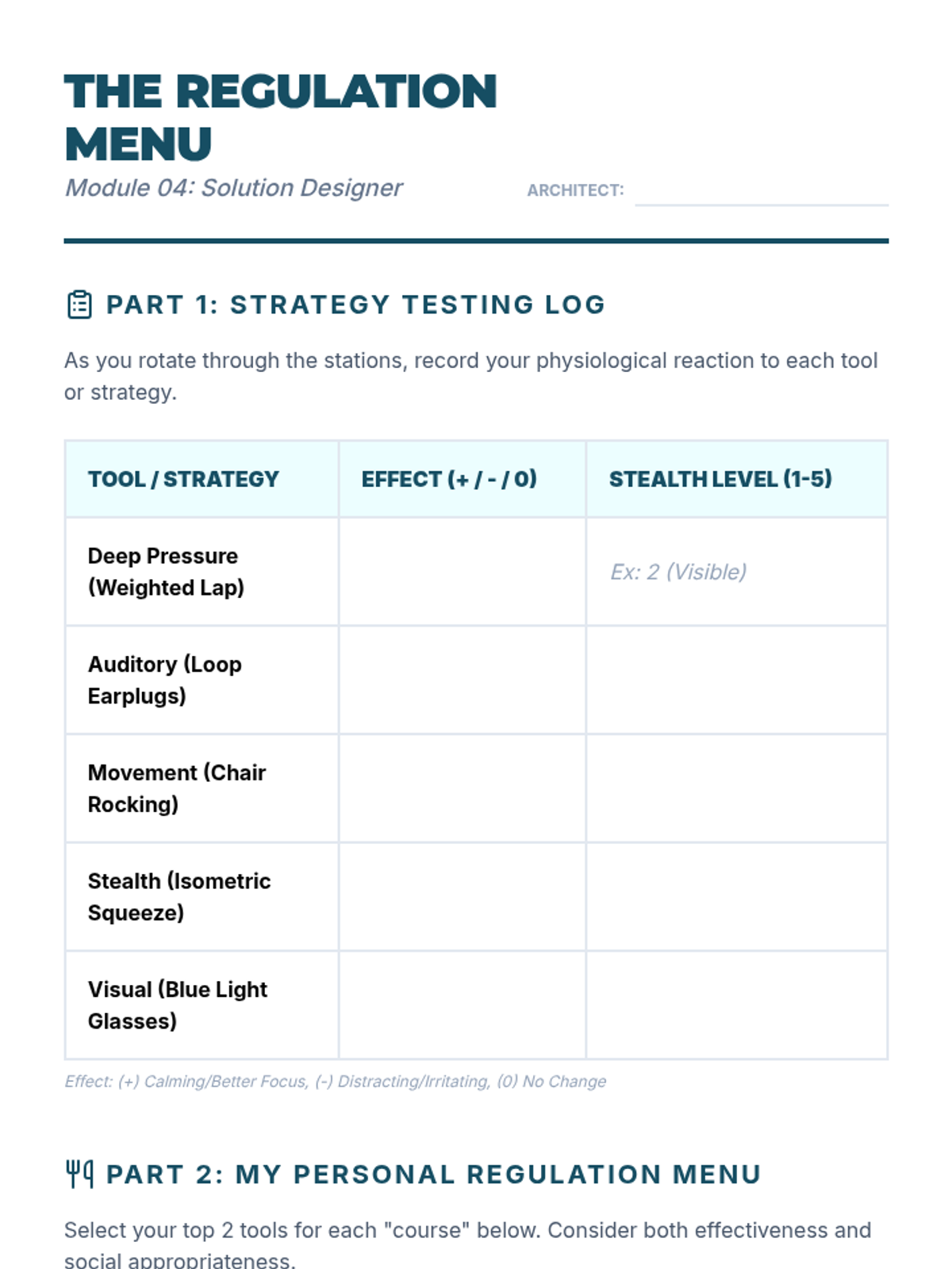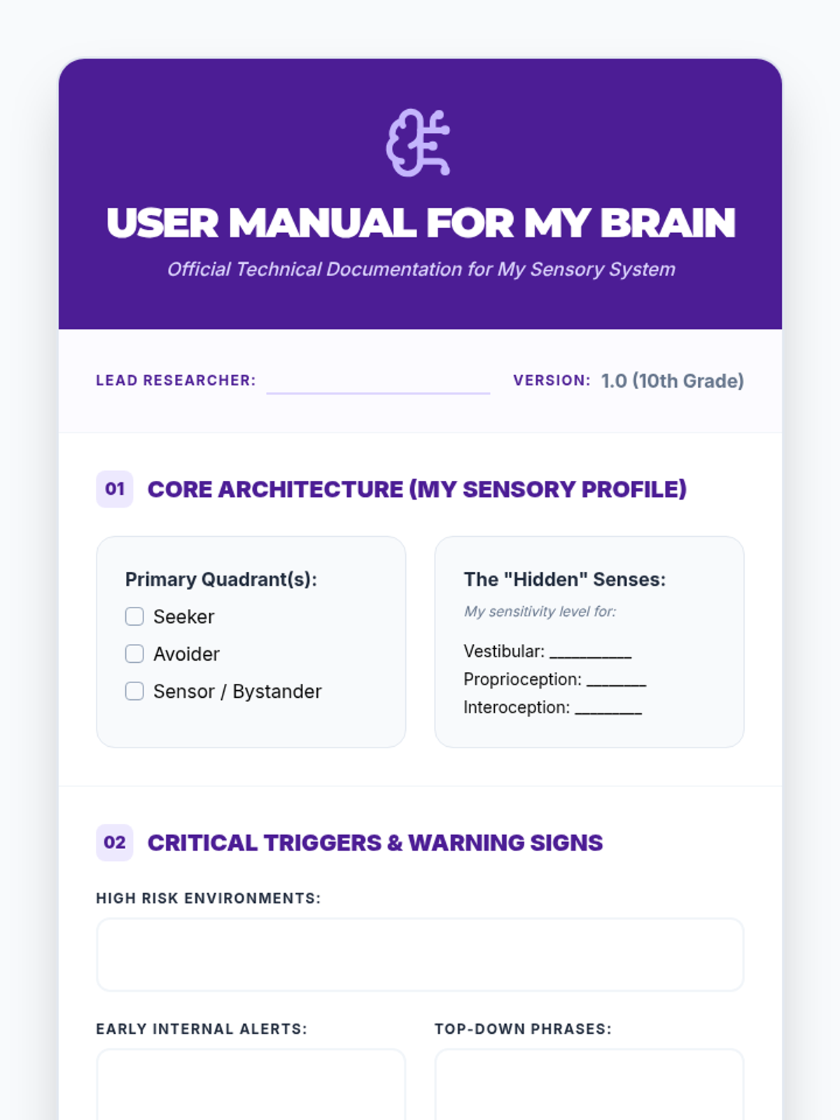 A comprehensive sequence for 10th-grade students to identify their sensory preferences, understand neurological thresholds, and develop a personalized self-regulation and advocacy plan.