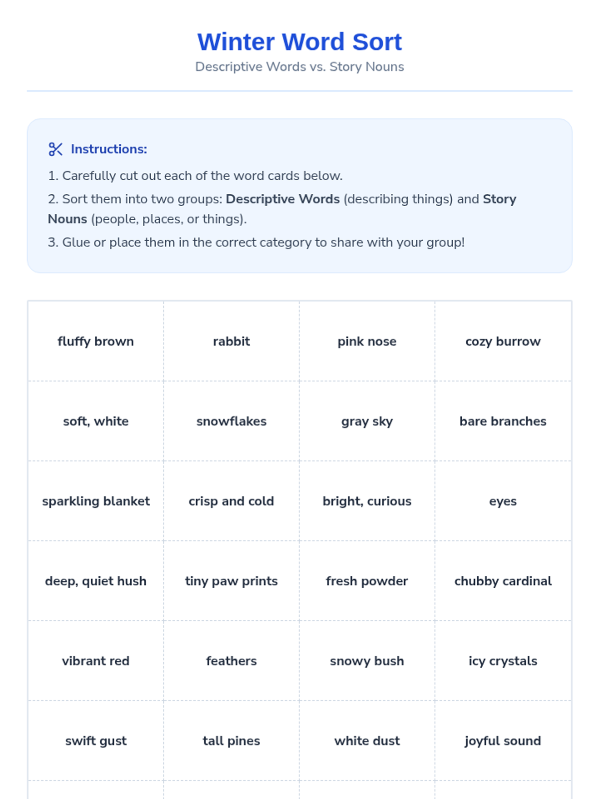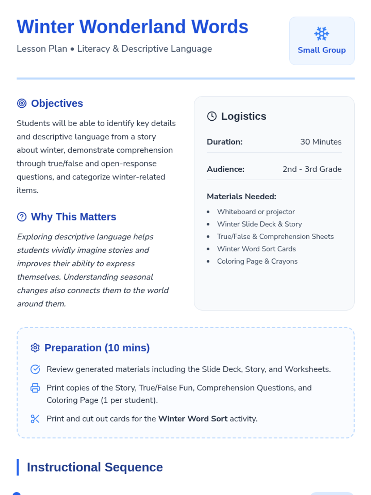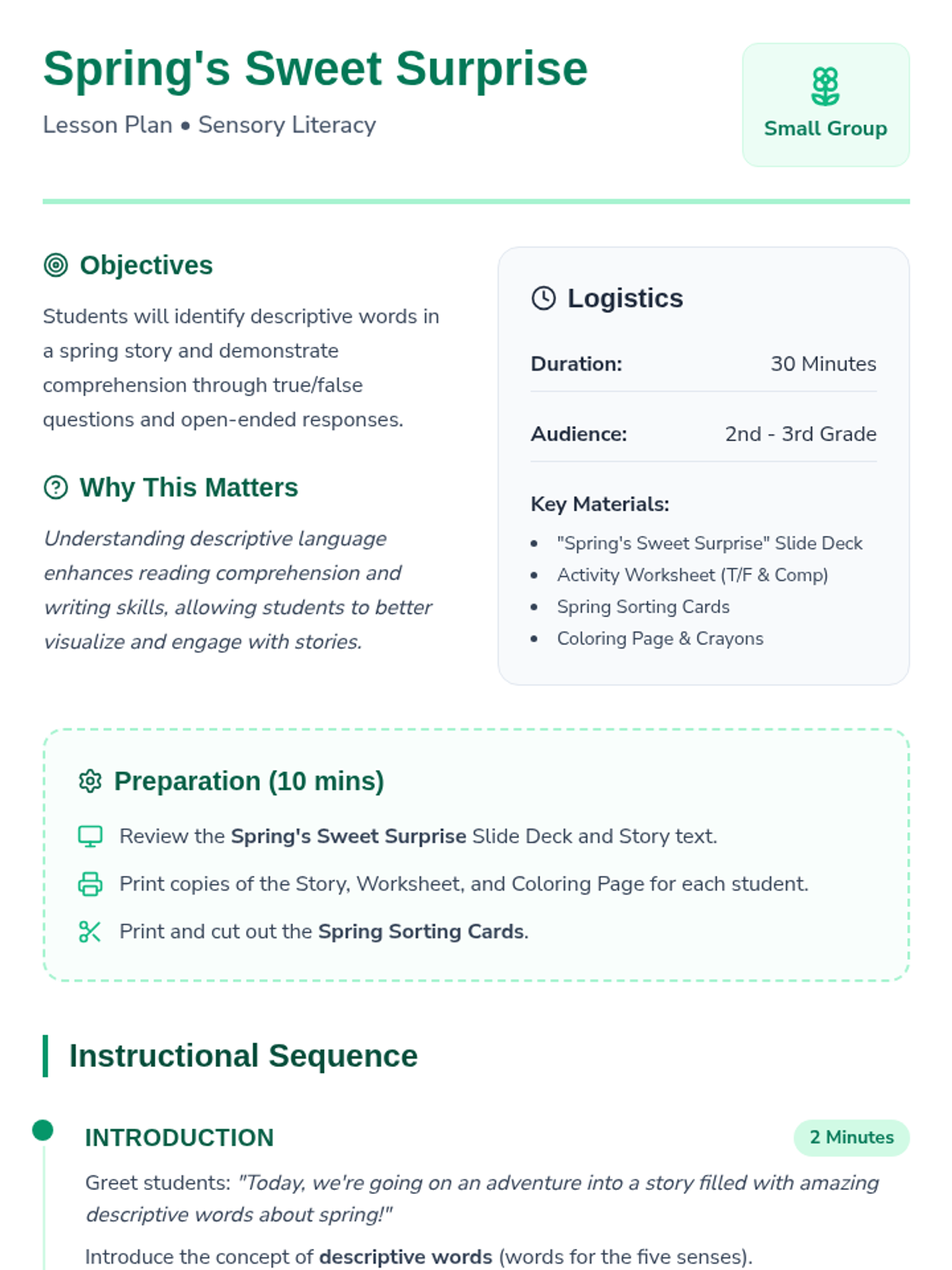 A series of three interactive literacy lessons for 2nd and 3rd graders focused on descriptive language and comprehension through the lens of changing seasons. Each lesson features an engaging story, sensory-rich vocabulary, and hands-on sorting and creative activities.