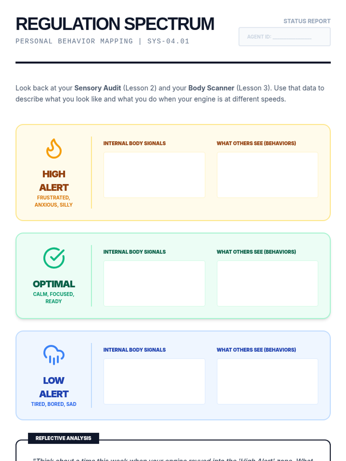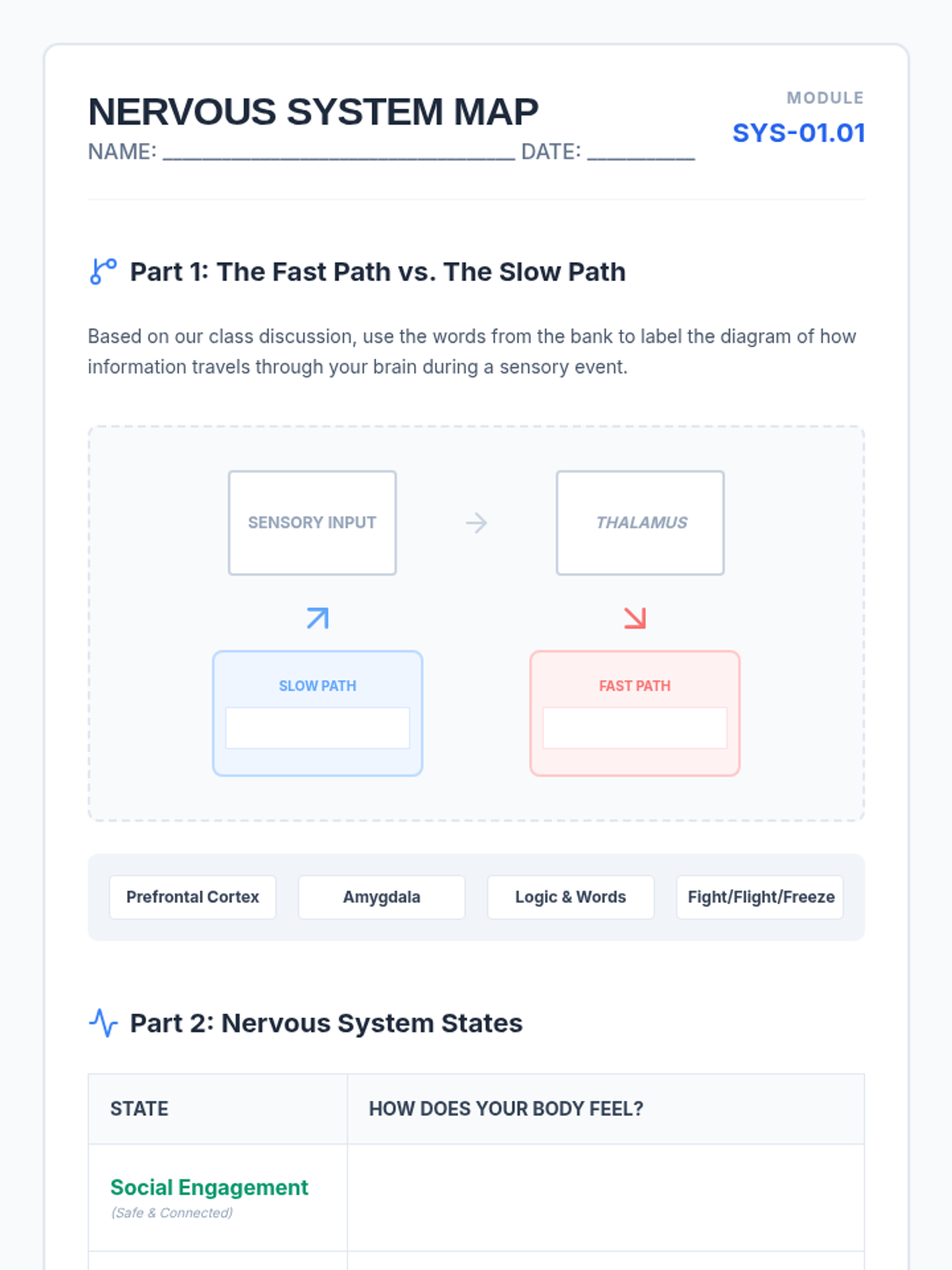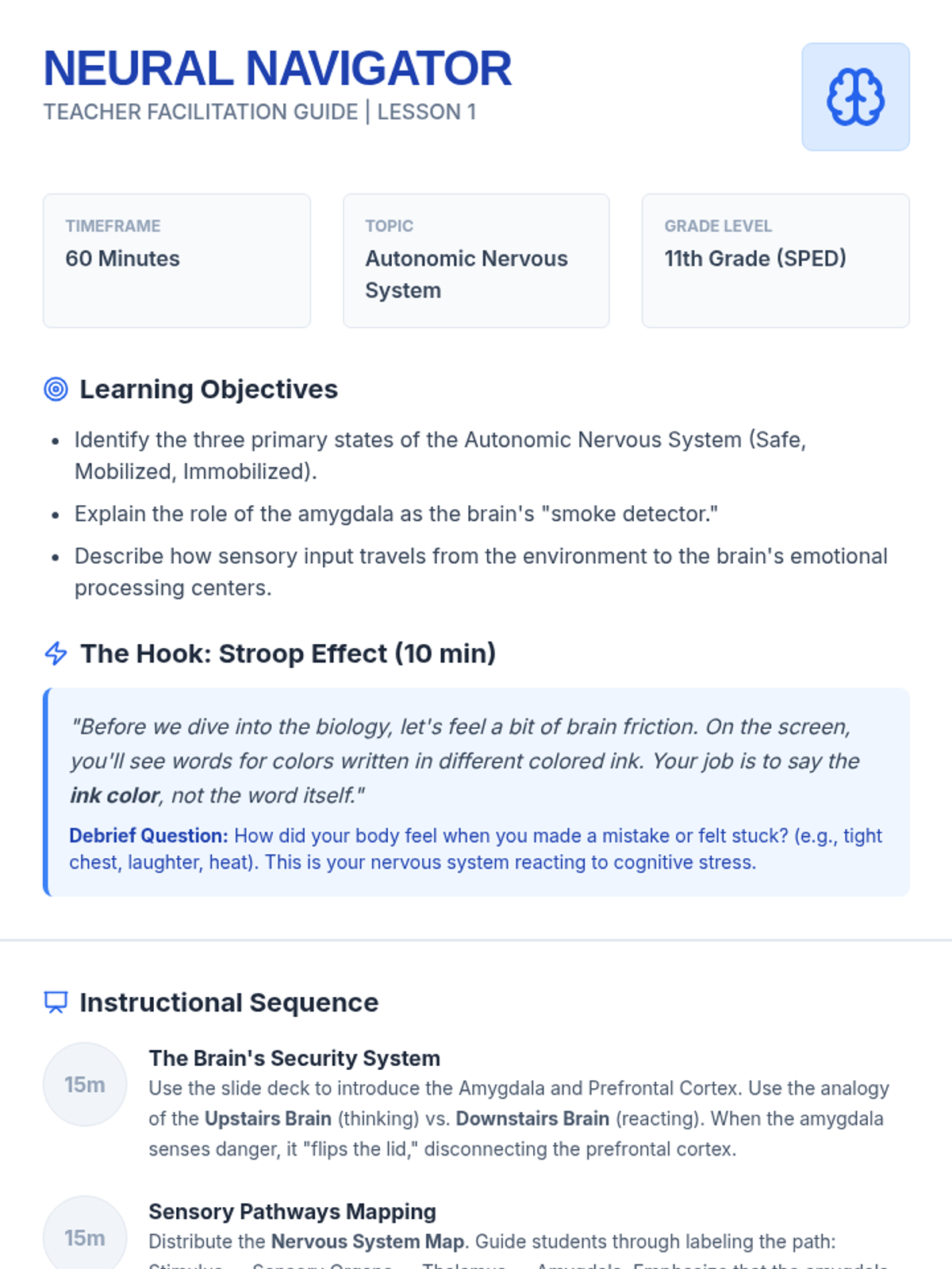 This inquiry-based sequence guides 11th-grade students through a deep analysis of their own neurological and sensory processing patterns. Students move beyond basic identification of feelings to understanding the biological mechanisms of dysregulation, interoception, and environmental triggers, culminating in a personalized 'User Manual' for self-advocacy.
