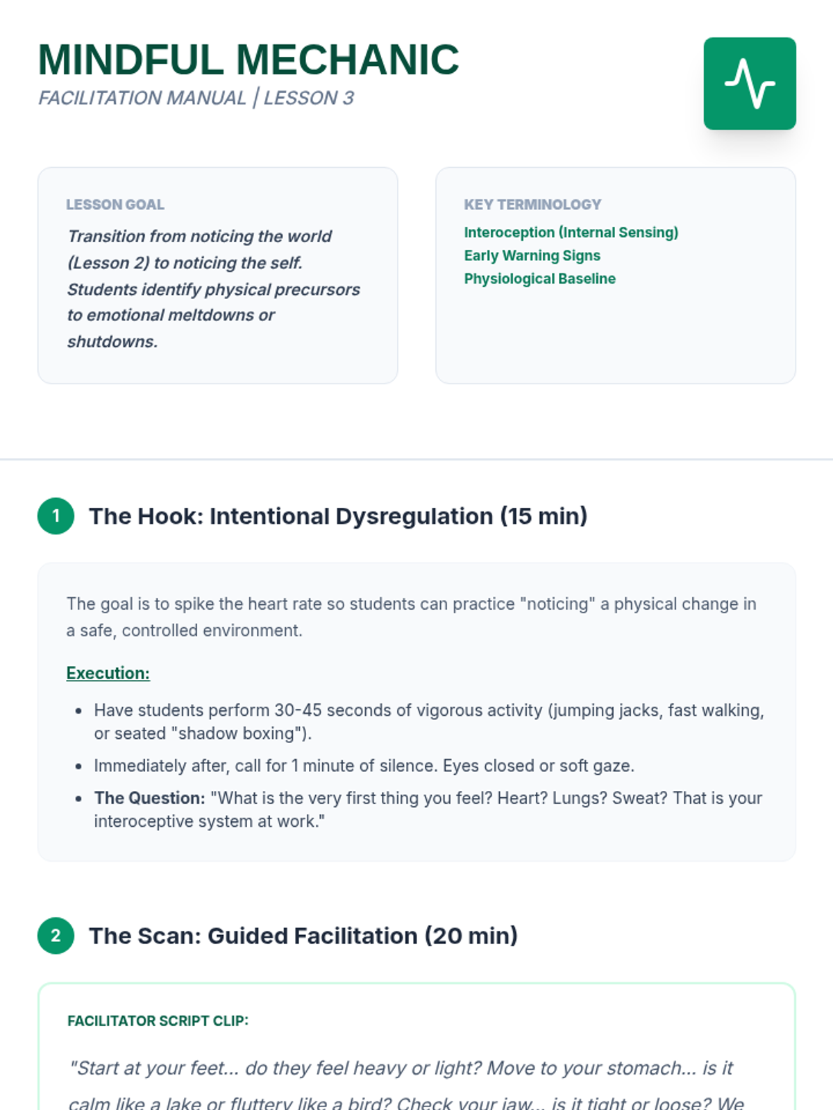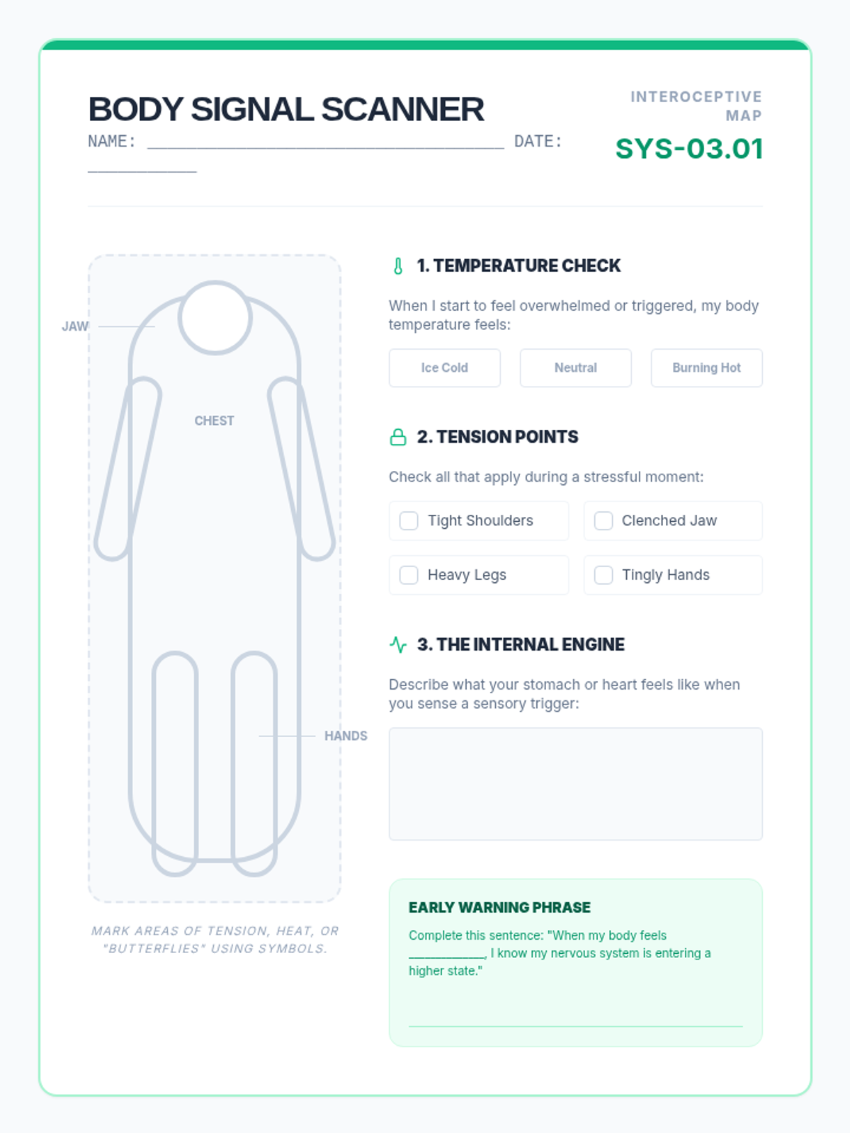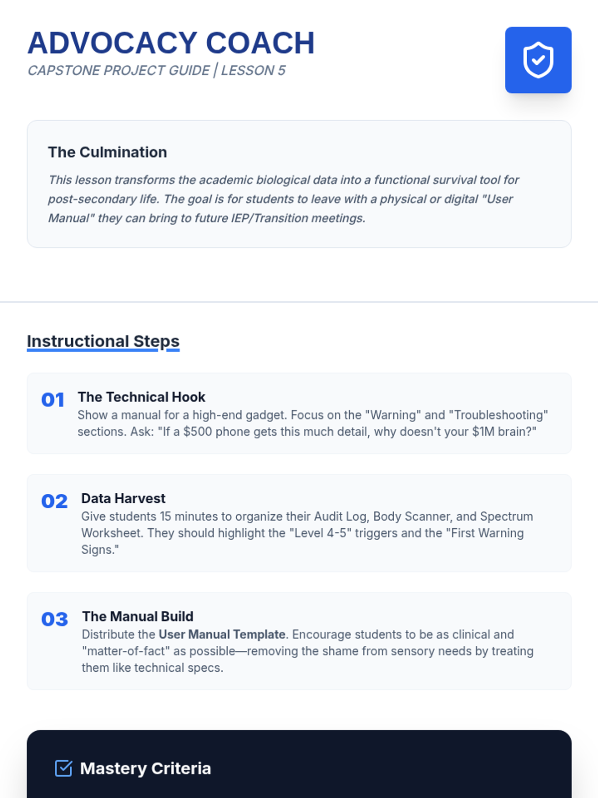 This inquiry-based sequence guides 11th-grade students through a deep analysis of their own neurological and sensory processing patterns. Students move beyond basic identification of feelings to understanding the biological mechanisms of dysregulation, interoception, and environmental triggers, culminating in a personalized 'User Manual' for self-advocacy.