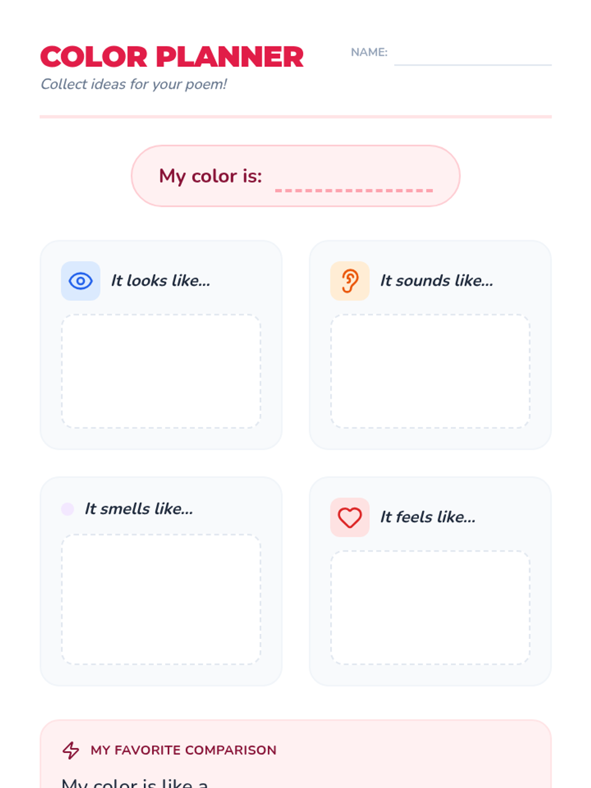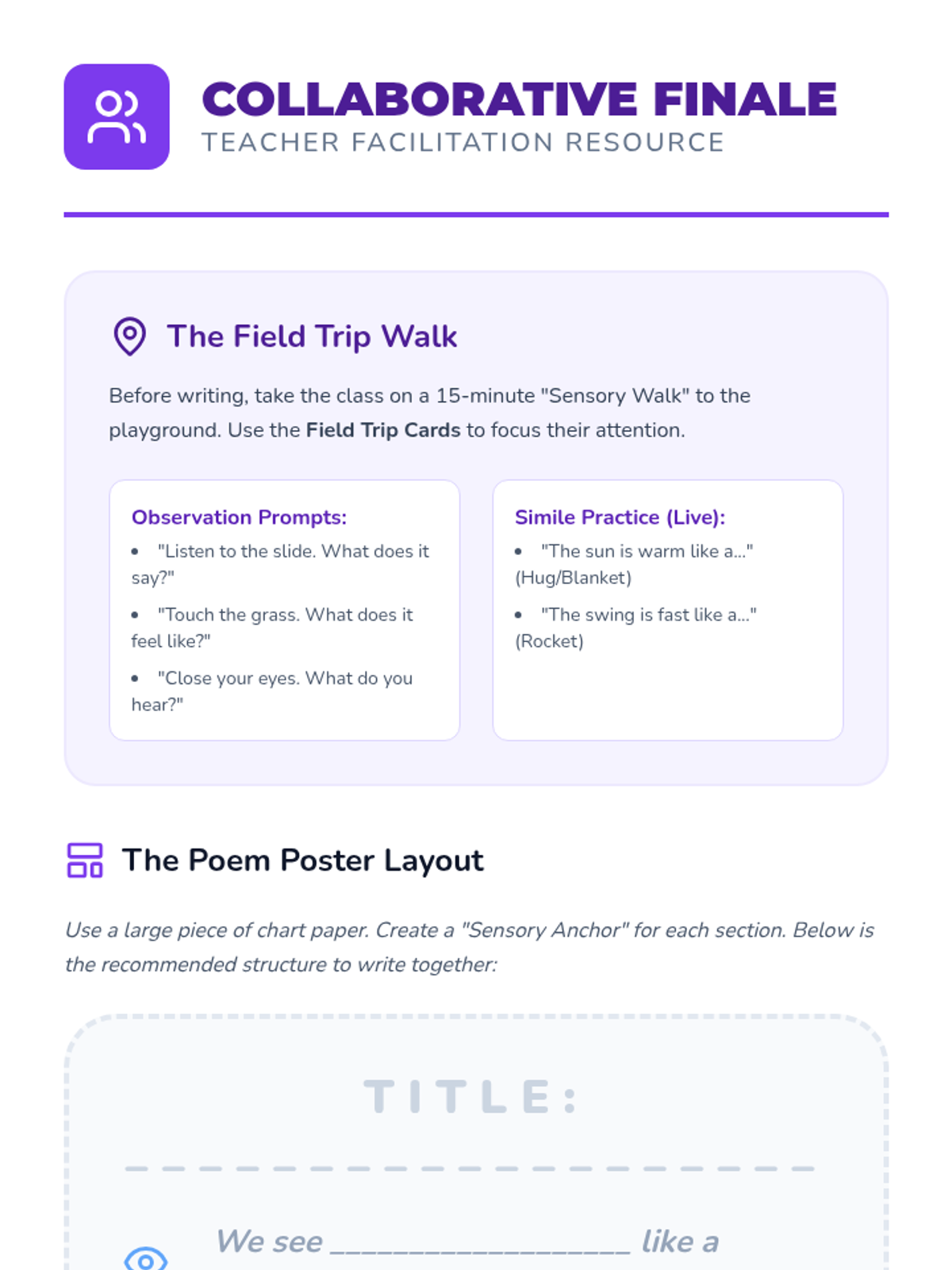 A Kindergarten ELA sequence introducing sensory details and simple similes through poetry. Students learn to use their five senses to describe the world and create comparisons to paint mental pictures.