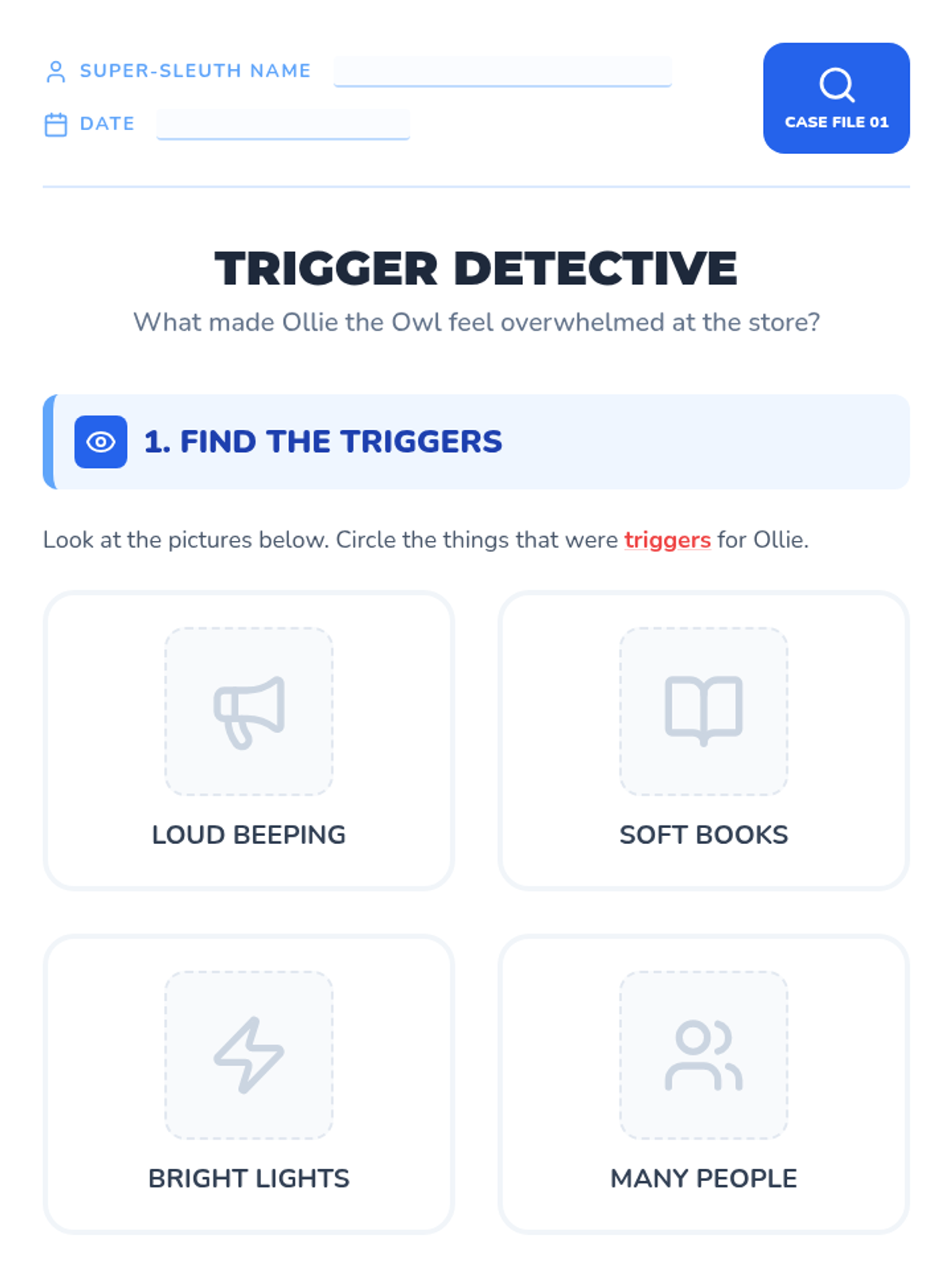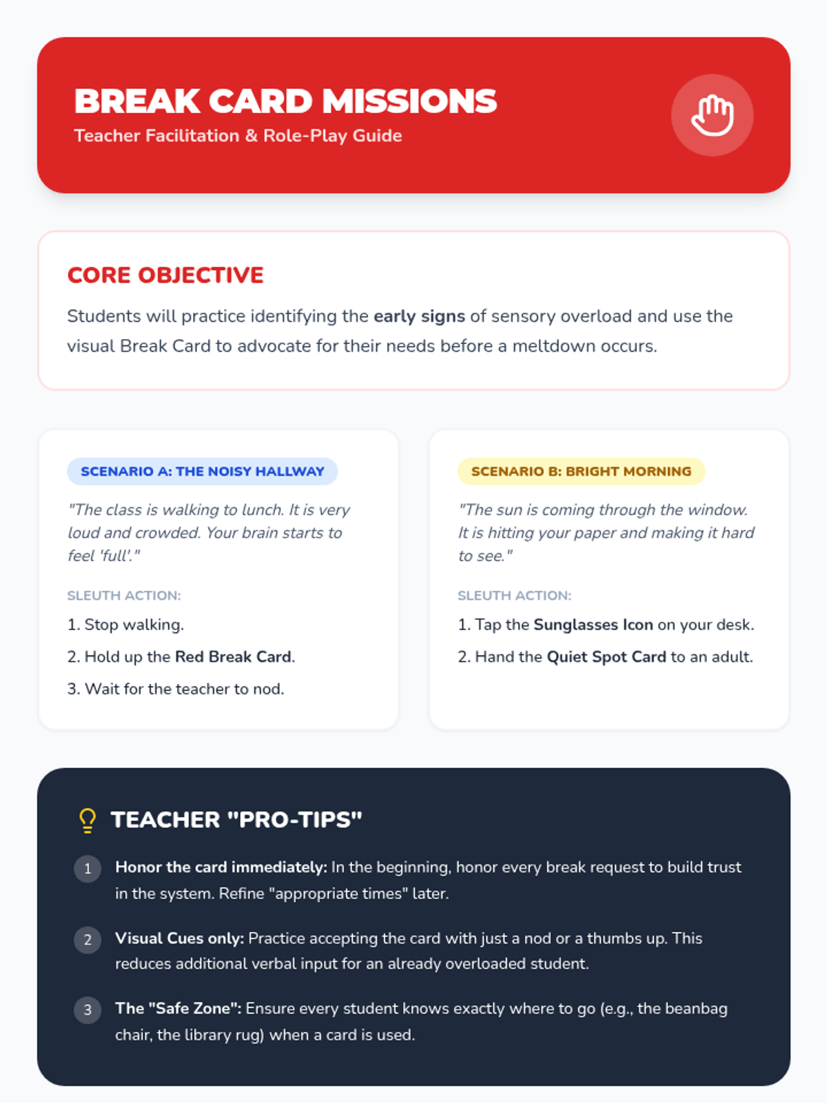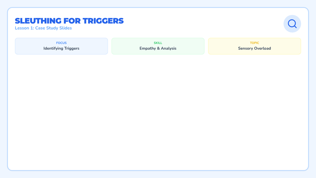 A 5-lesson sequence for Kindergarten students focusing on identifying environmental sensory triggers and developing self-advocacy strategies through a 'Sensory Super-Sleuth' lens. Students move from recognizing triggers in others to mapping their own environment and creating a personalized safety plan.