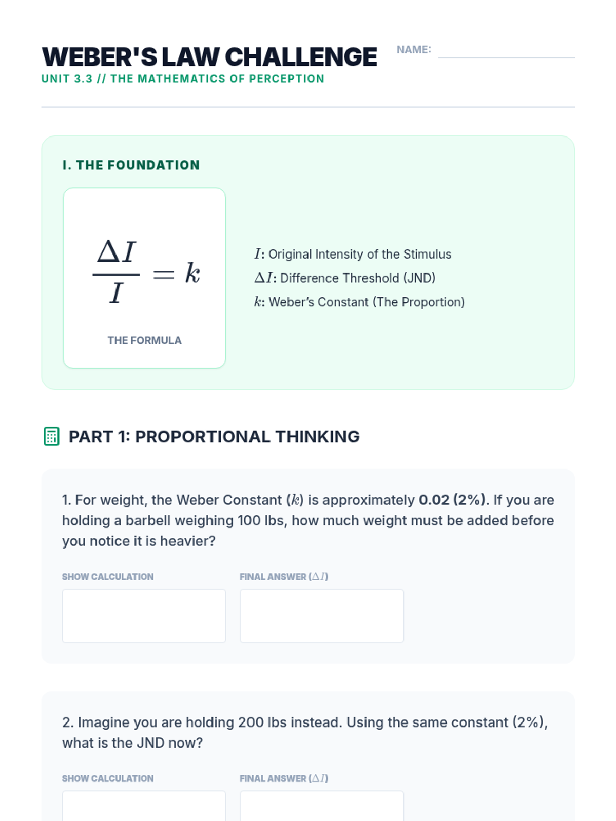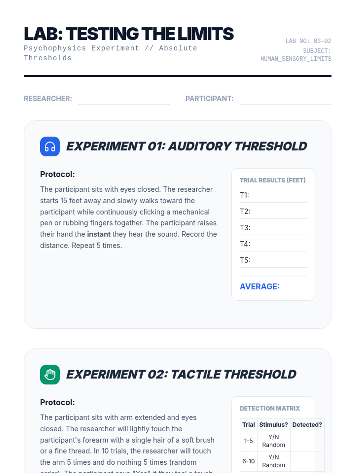 A comprehensive unit exploring the limits of human sensory systems through psychophysics, threshold testing, Weber's Law, Signal Detection Theory, and sensory adaptation. Students engage in lab-style experiments and simulations to understand how physical stimuli are transformed into psychological experiences.