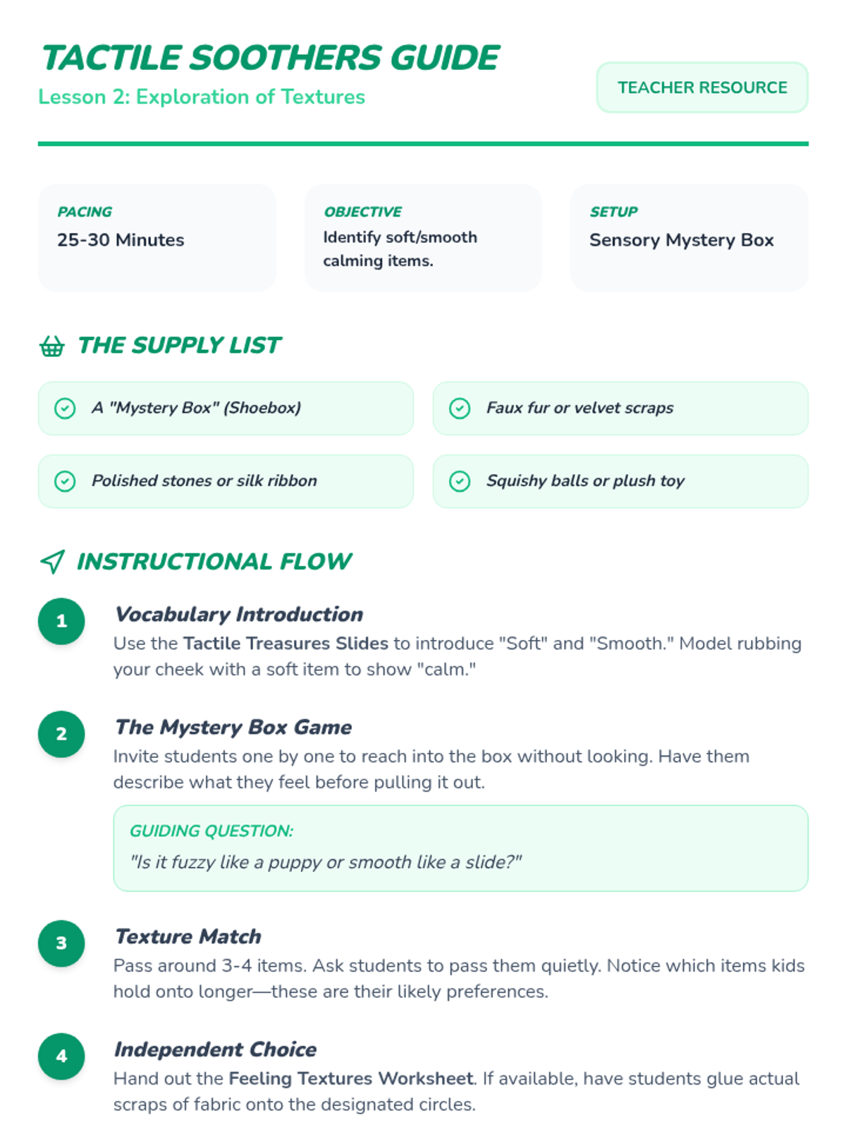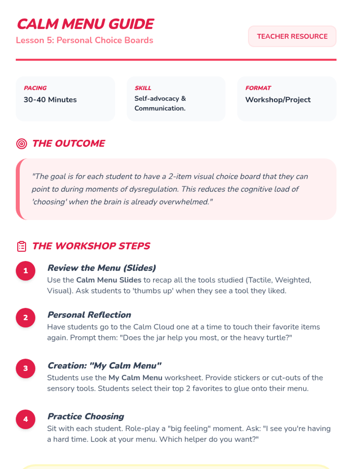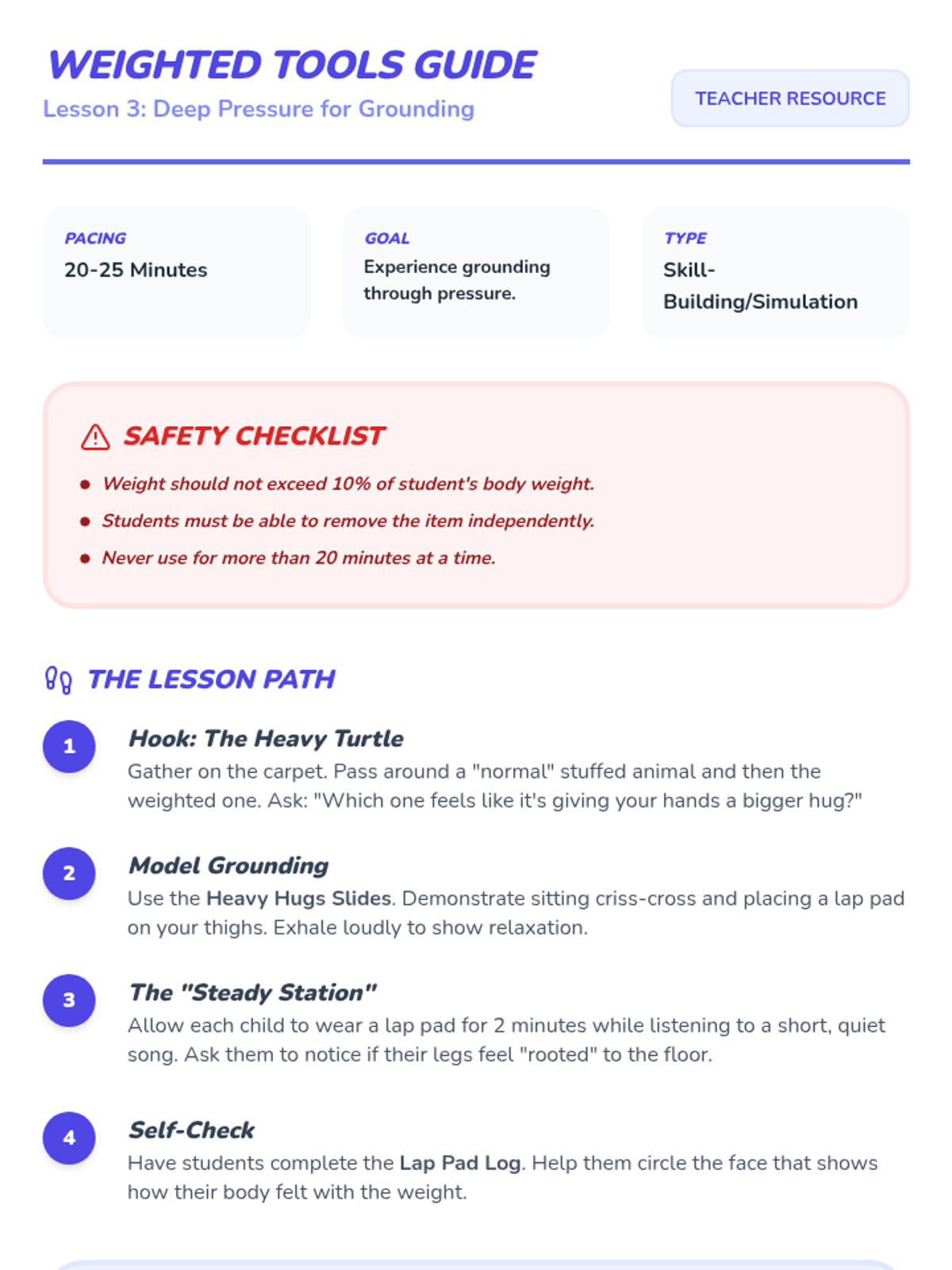 A sequence focused on environmental modifications and sensory tools to support Pre-K students in recovering from emotional dysregulation. Students explore calm-down areas and various sensory inputs to build a personal repertoire of self-regulation strategies.