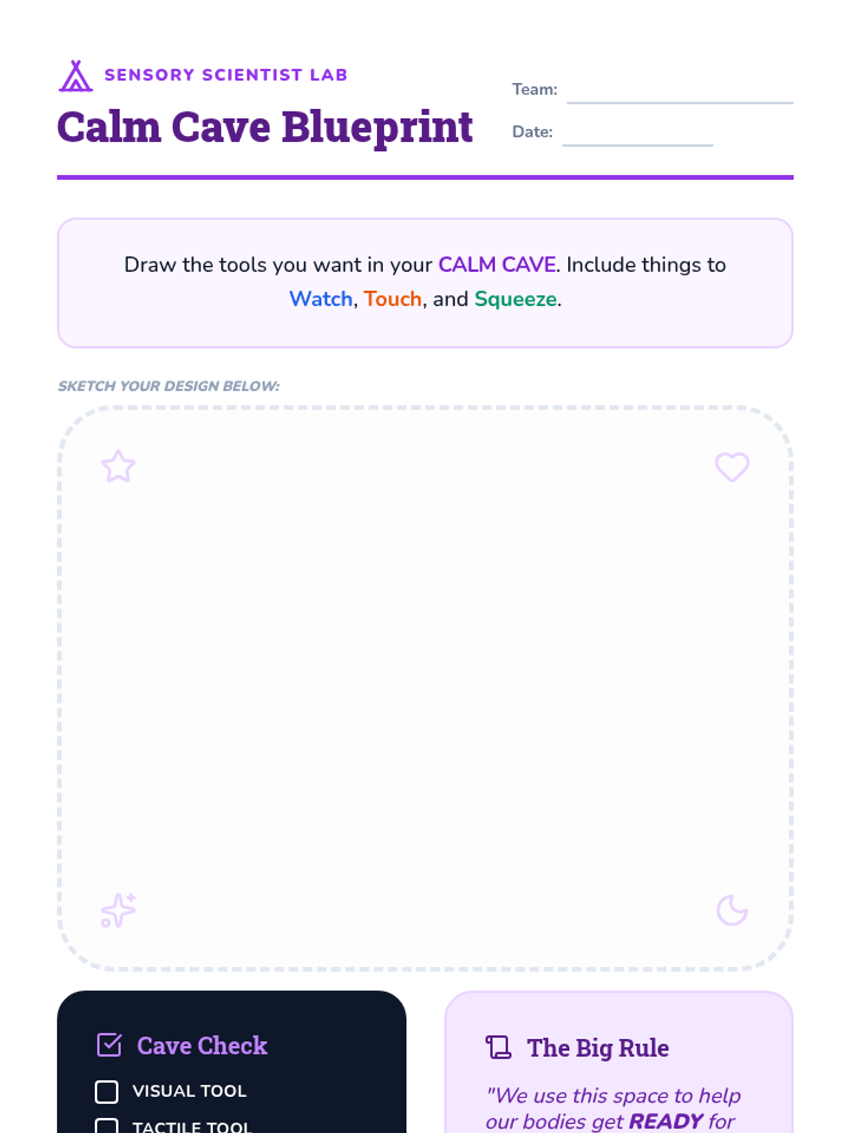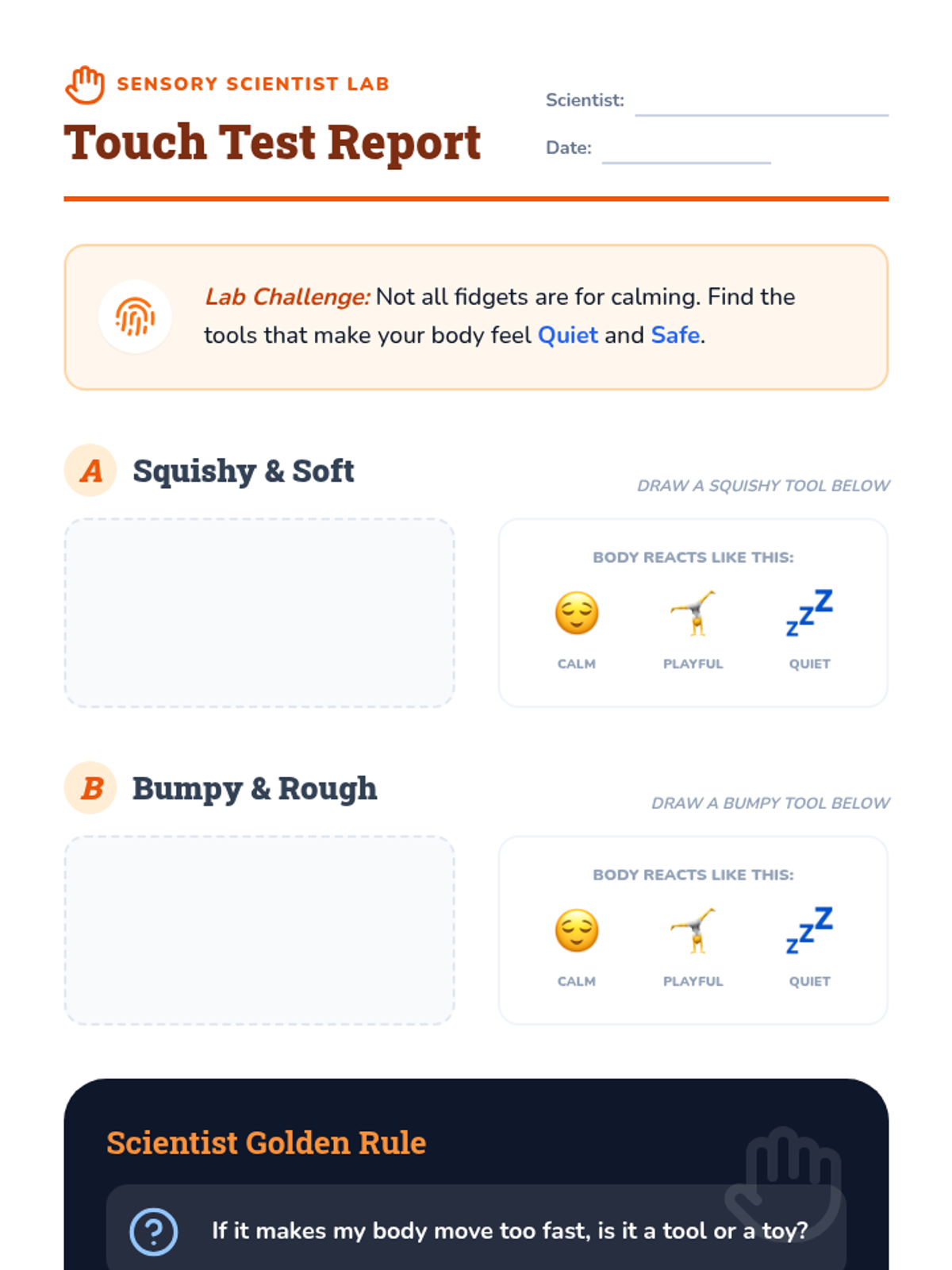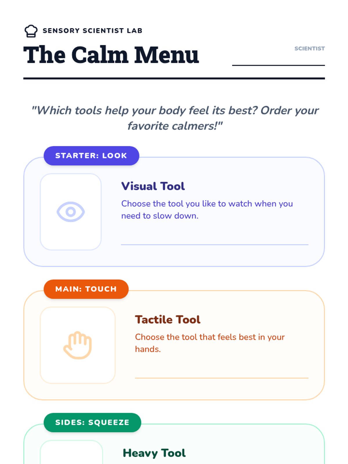 A 1st-grade sequence focused on empowering students to discover and use sensory tools for emotional stabilization. Students act as 'Sensory Scientists' exploring visual, proprioceptive, and tactile inputs to build a personalized recovery toolkit.