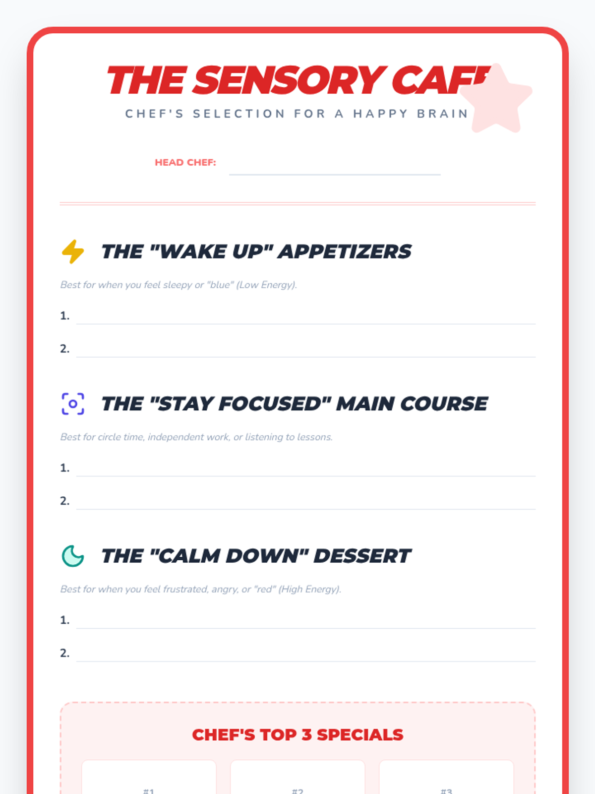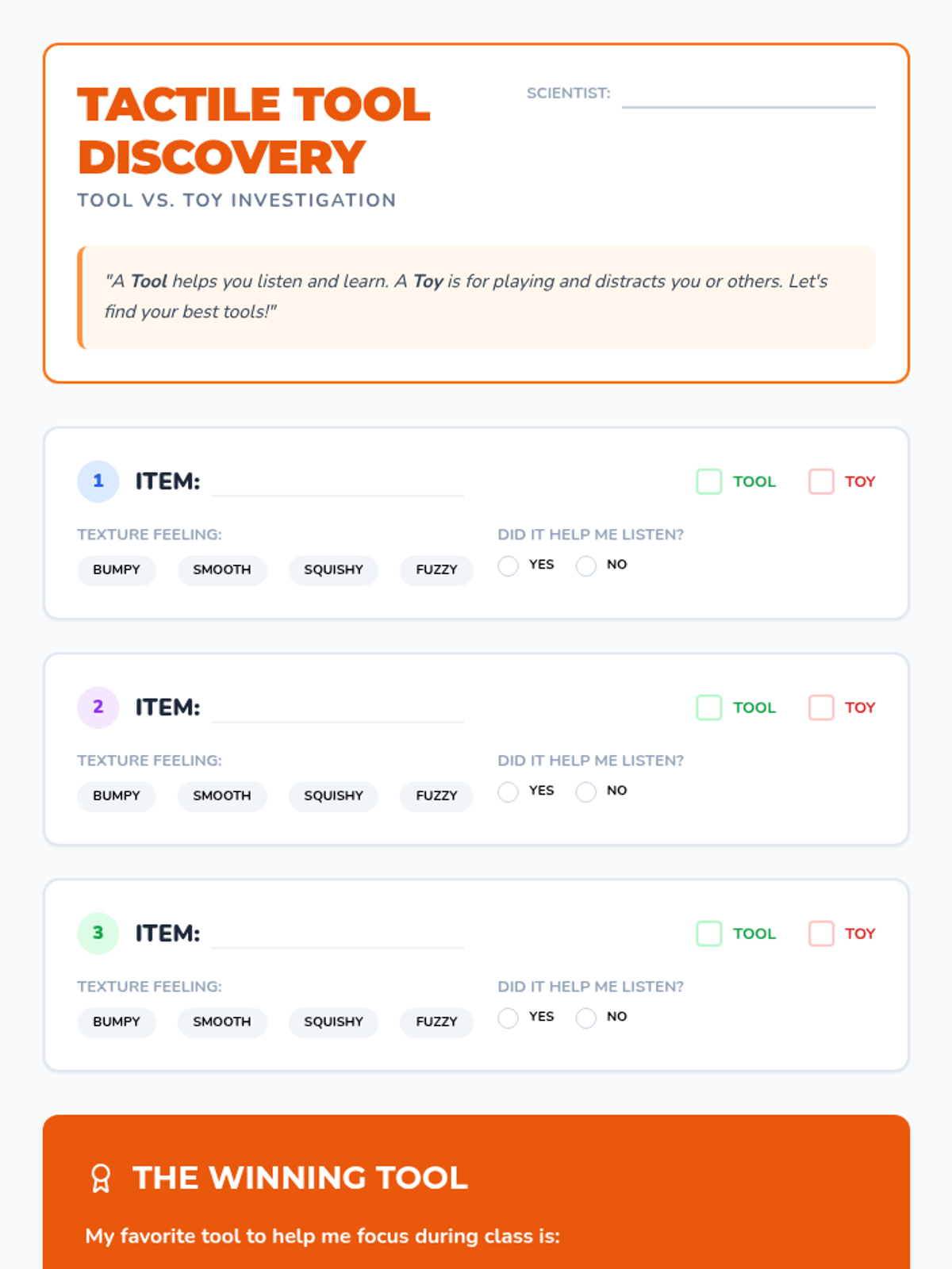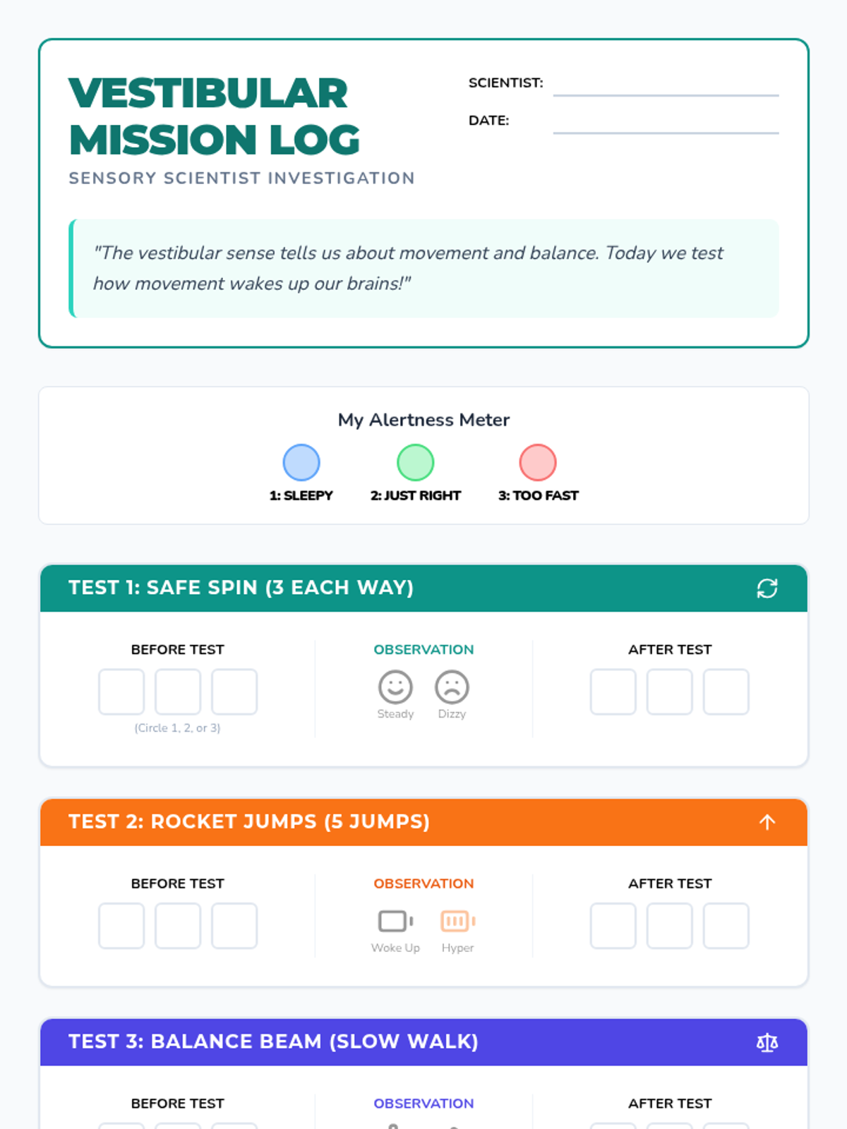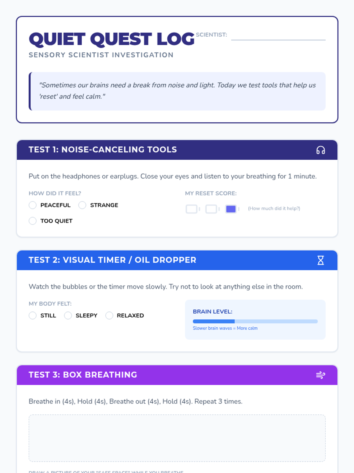 A 5-lesson sequence for 3rd Grade students to explore proprioceptive, vestibular, tactile, and calming sensory strategies. Students act as 'Sensory Scientists' to test tools and activities, eventually creating a personalized 'Sensory Menu' for self-regulation.