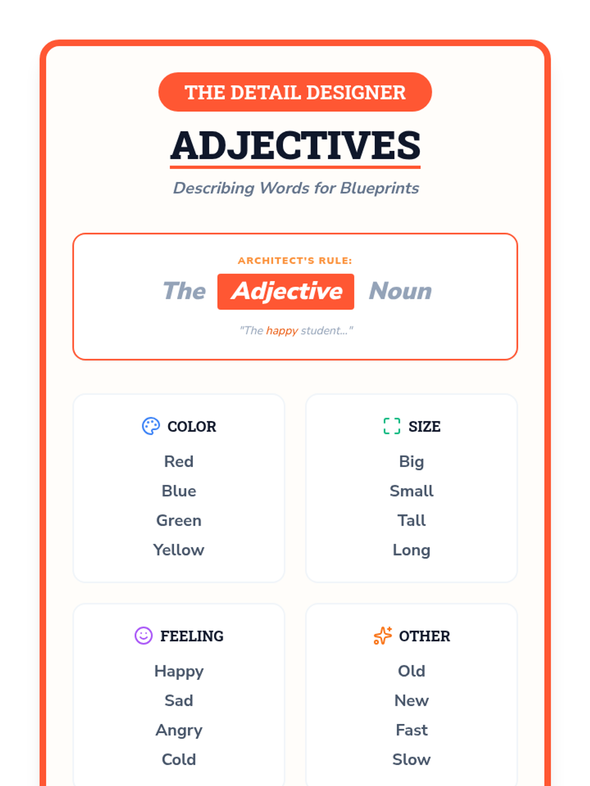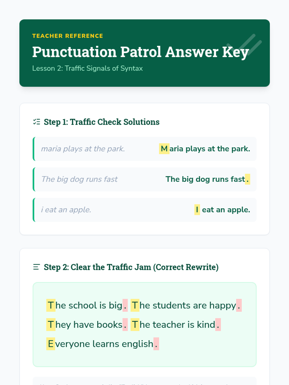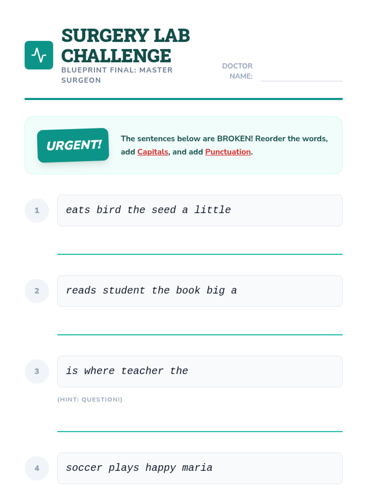 A comprehensive sequence for 7th Grade Beginner English learners focusing on sentence architecture through a construction-themed metaphor. Students progress from identifying Subject-Verb-Object patterns to mastering punctuation, adjectives, and question formation.