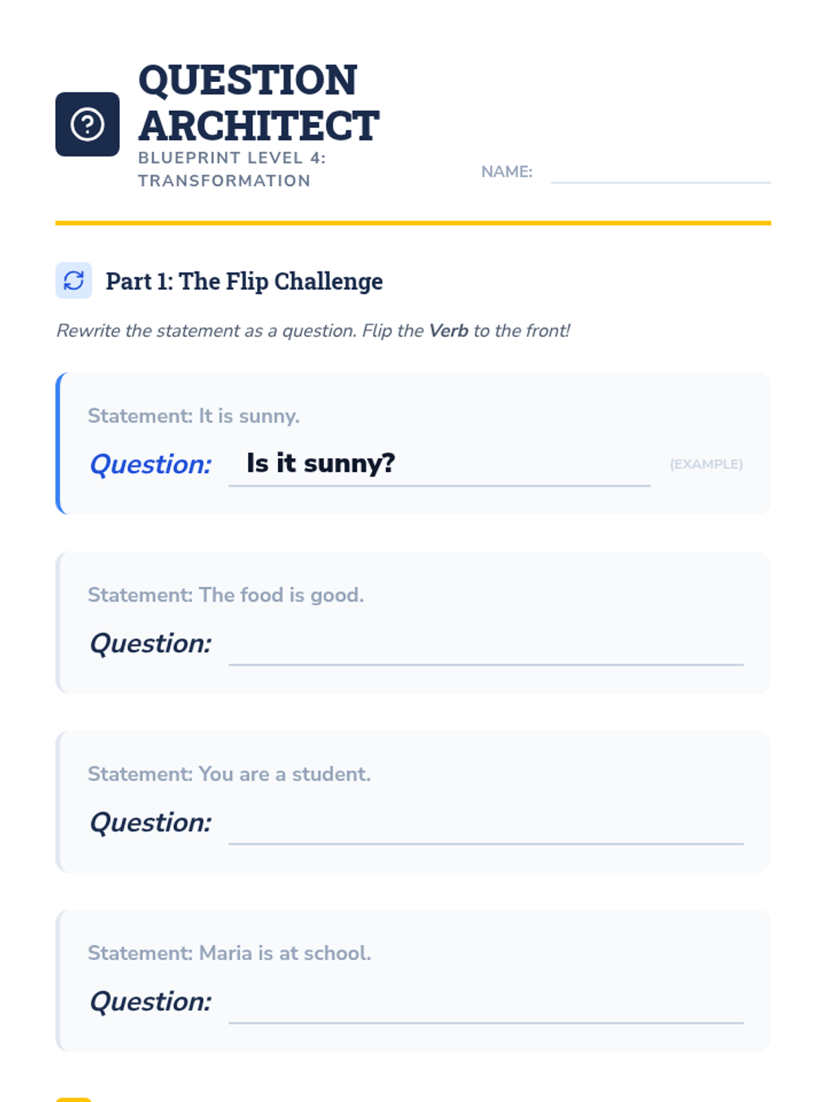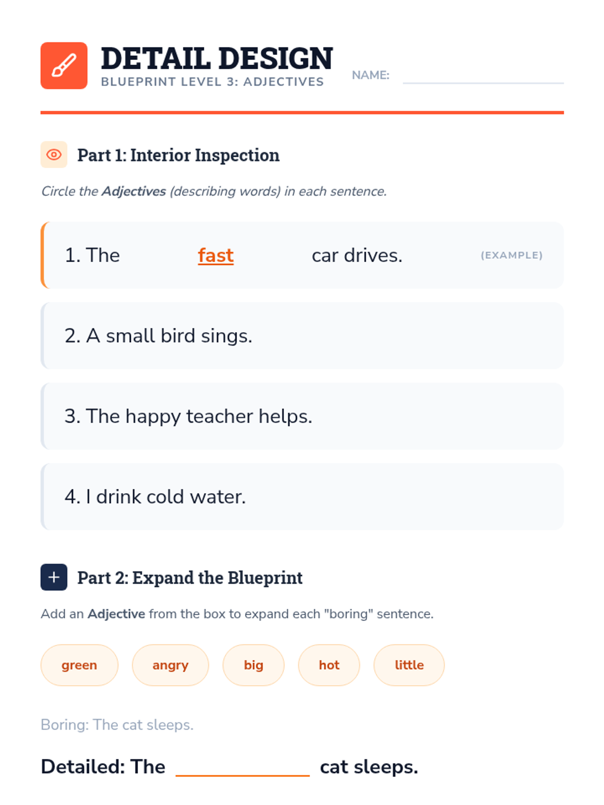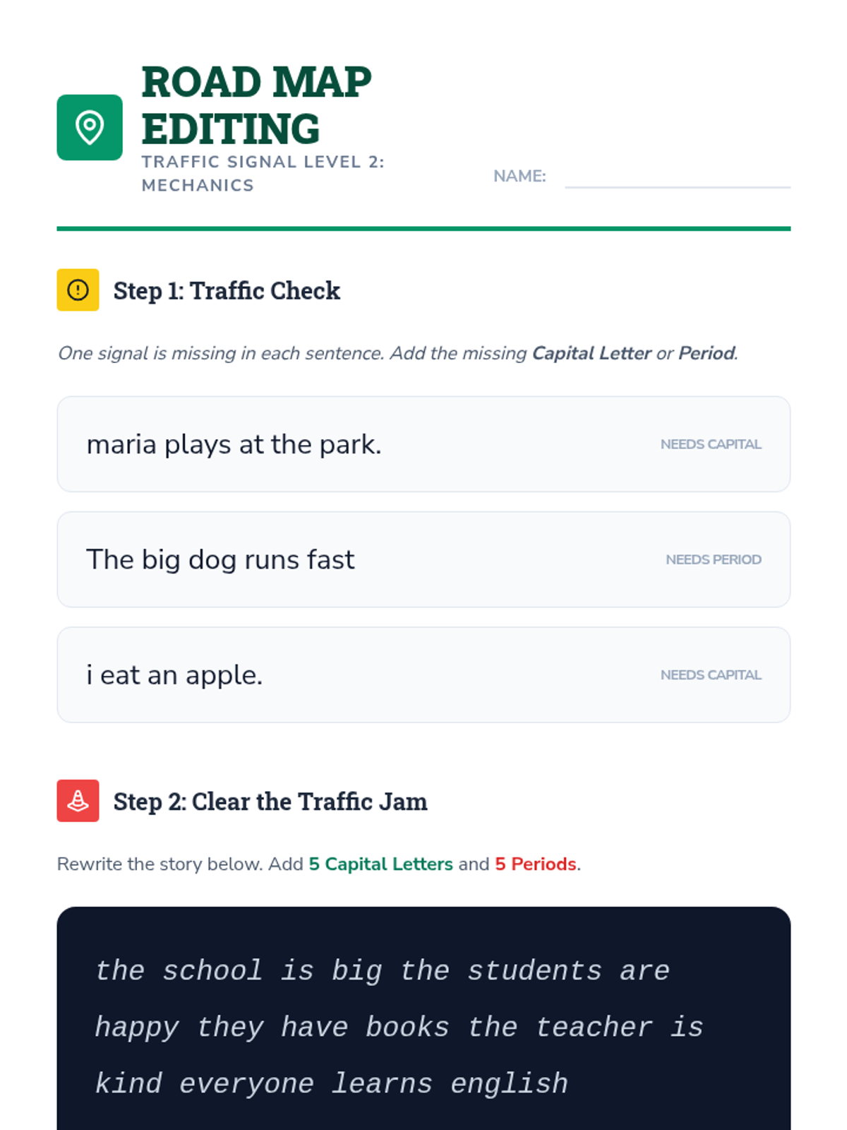 A comprehensive sequence for 7th Grade Beginner English learners focusing on sentence architecture through a construction-themed metaphor. Students progress from identifying Subject-Verb-Object patterns to mastering punctuation, adjectives, and question formation.
