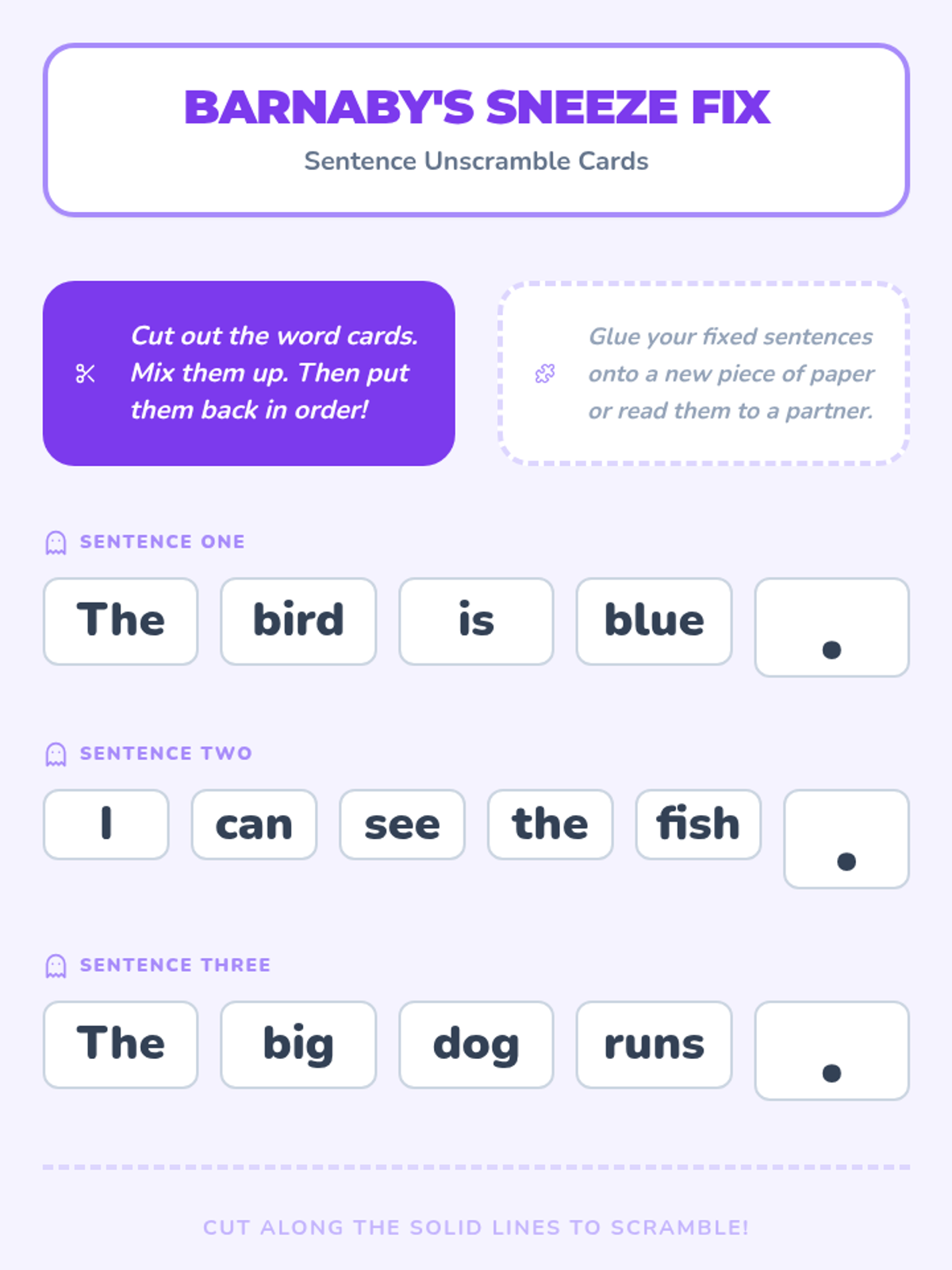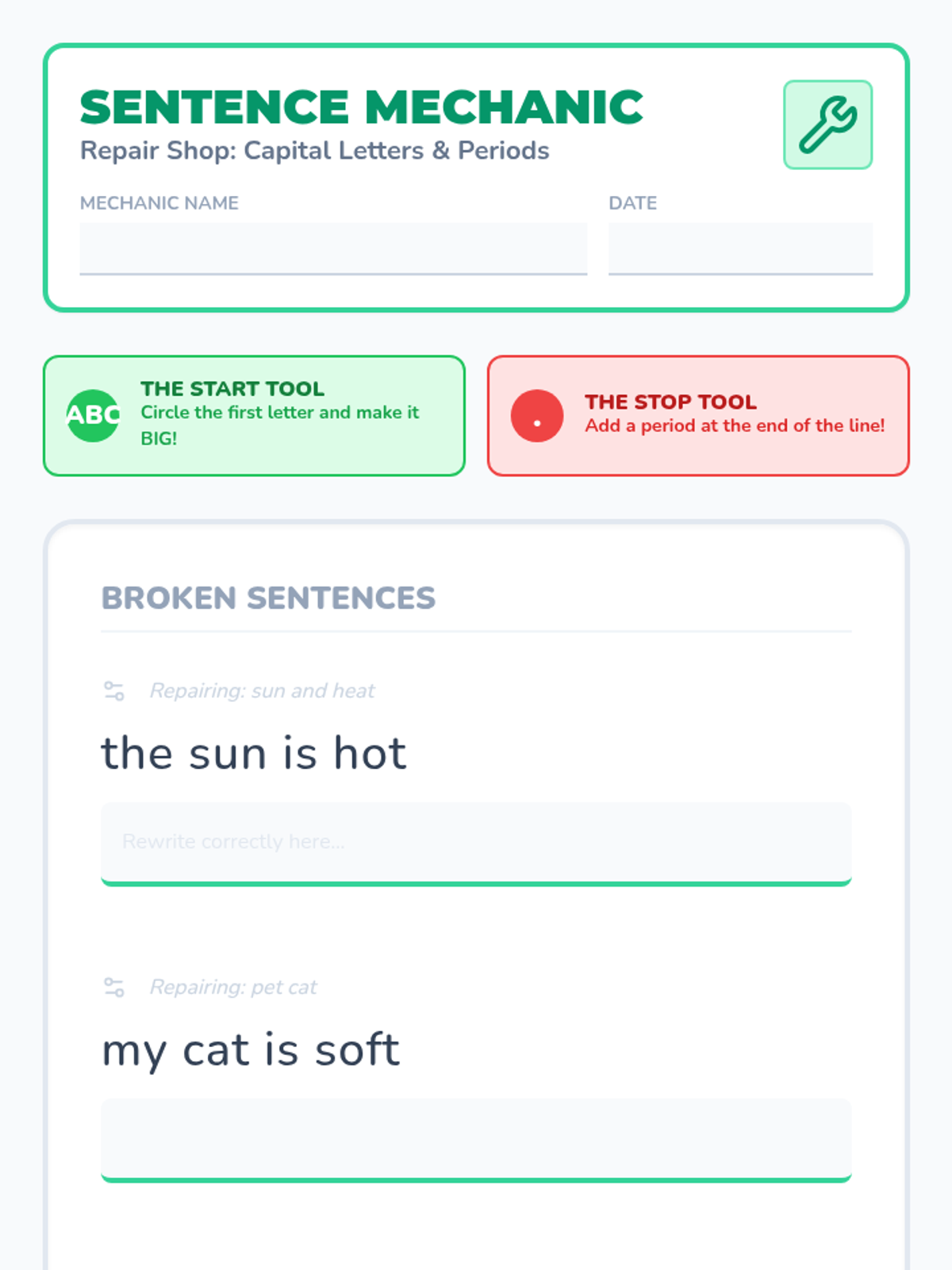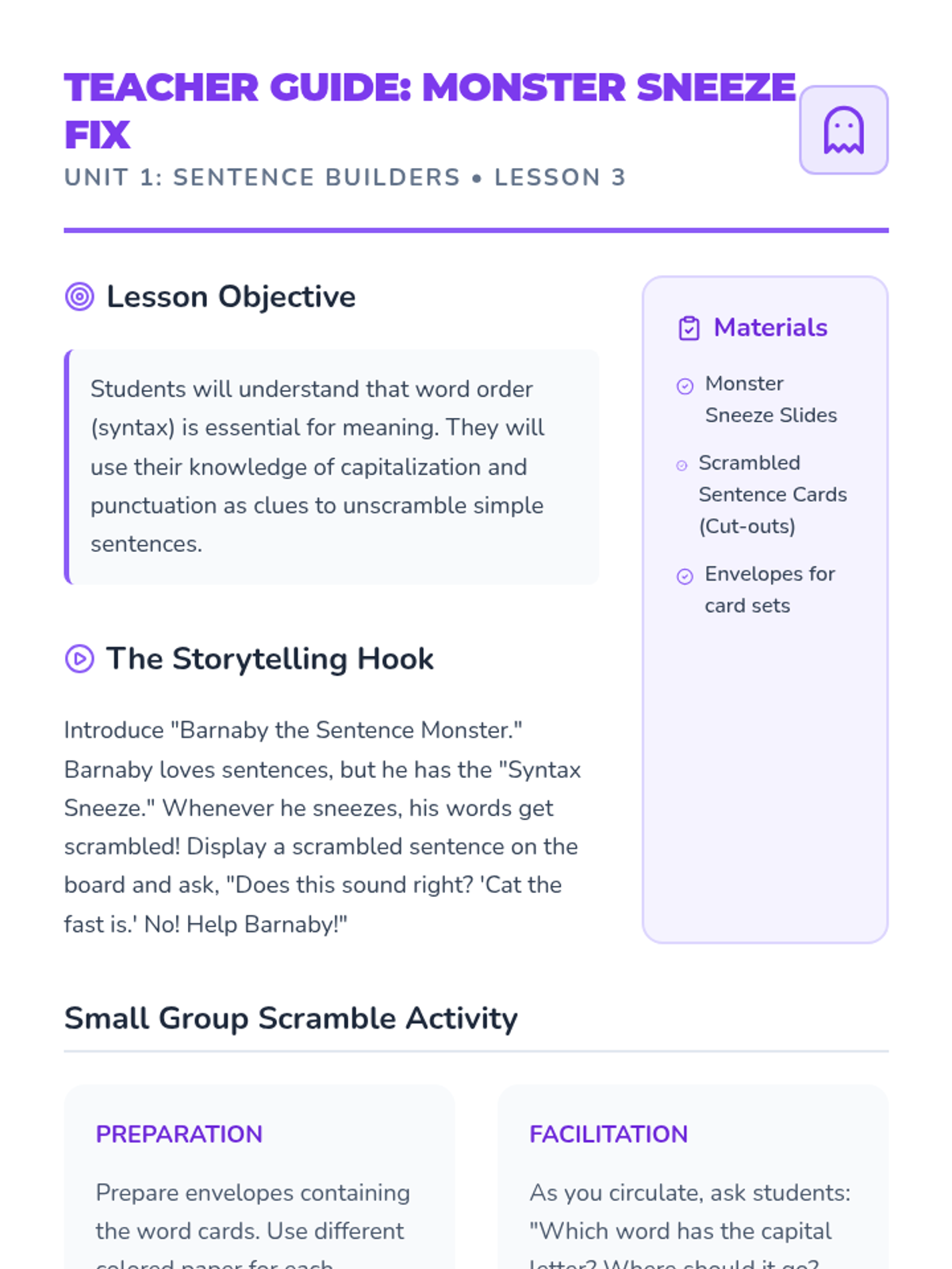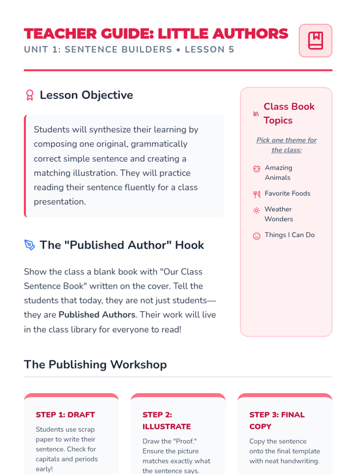 A 1st Grade sequence exploring English sentence architecture. Students learn to distinguish letters, words, and sentences, master capitalization and punctuation, and eventually write and illustrate their own sentences for a class book.