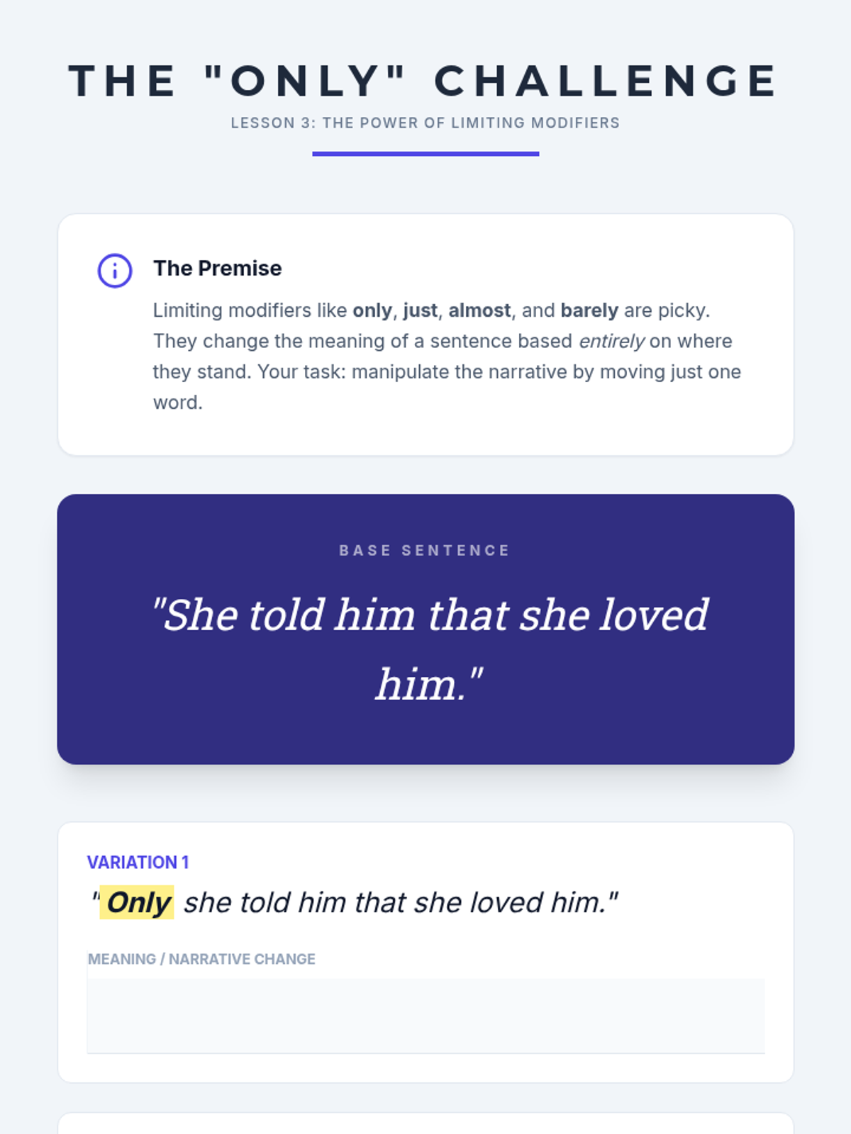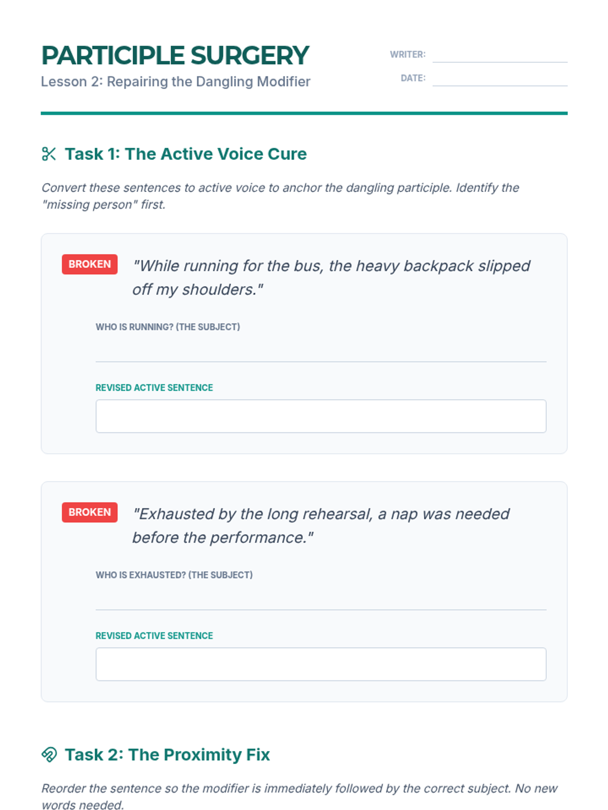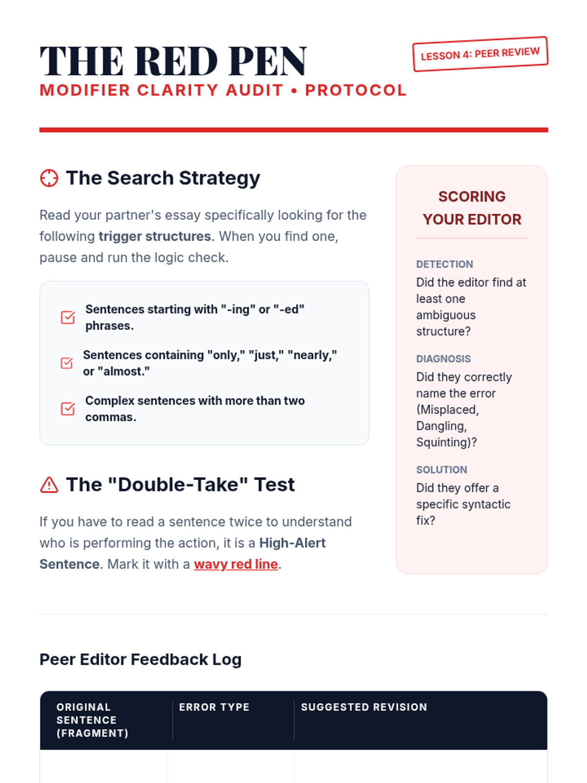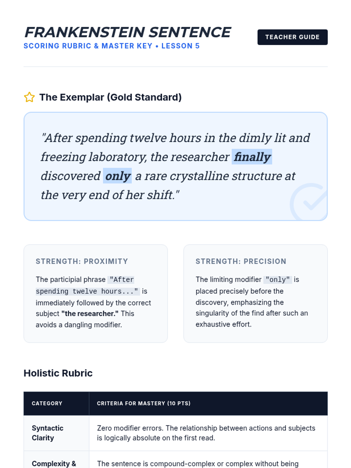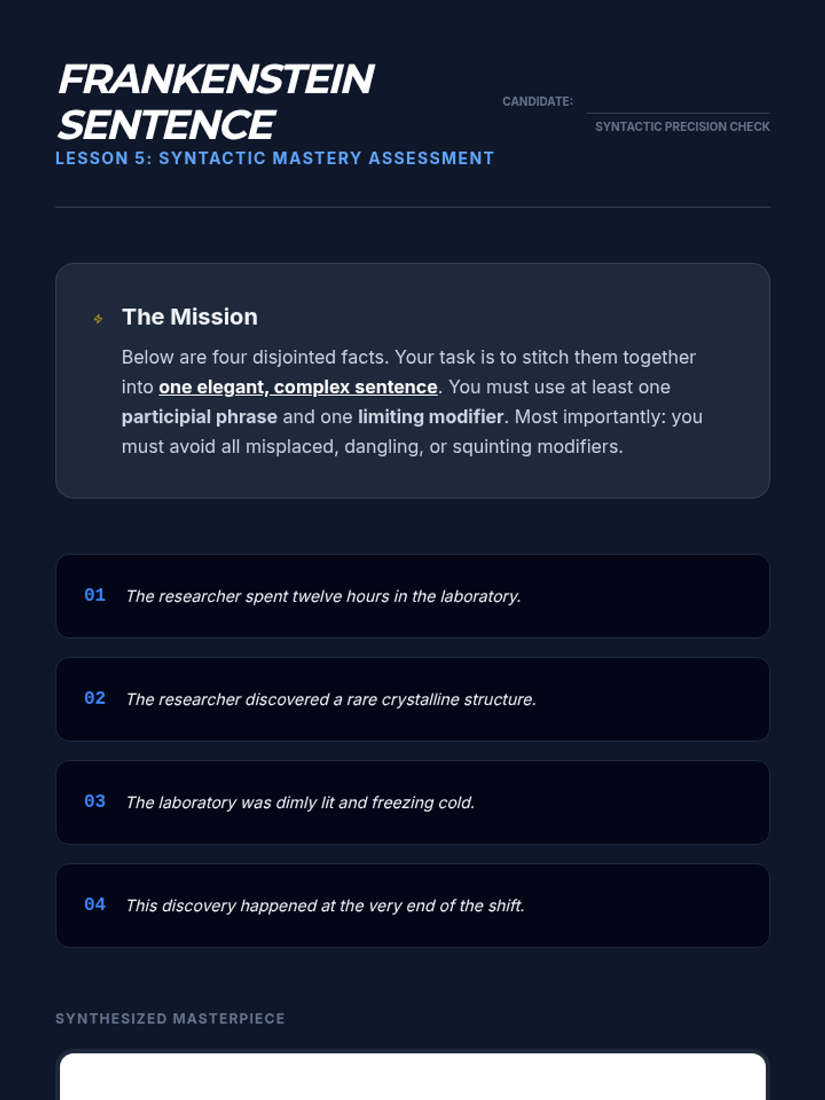 An intensive 11th-grade writing workshop focused on the mechanics of sentence structure, targeting misplaced, dangling, and squinting modifiers to enhance academic writing clarity and writerly ethos.