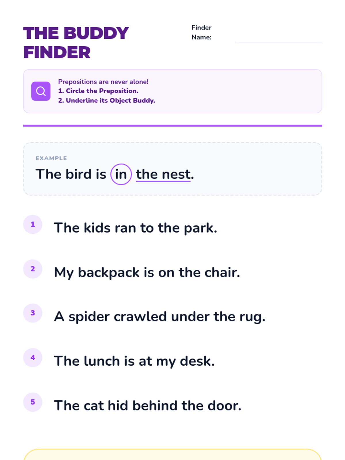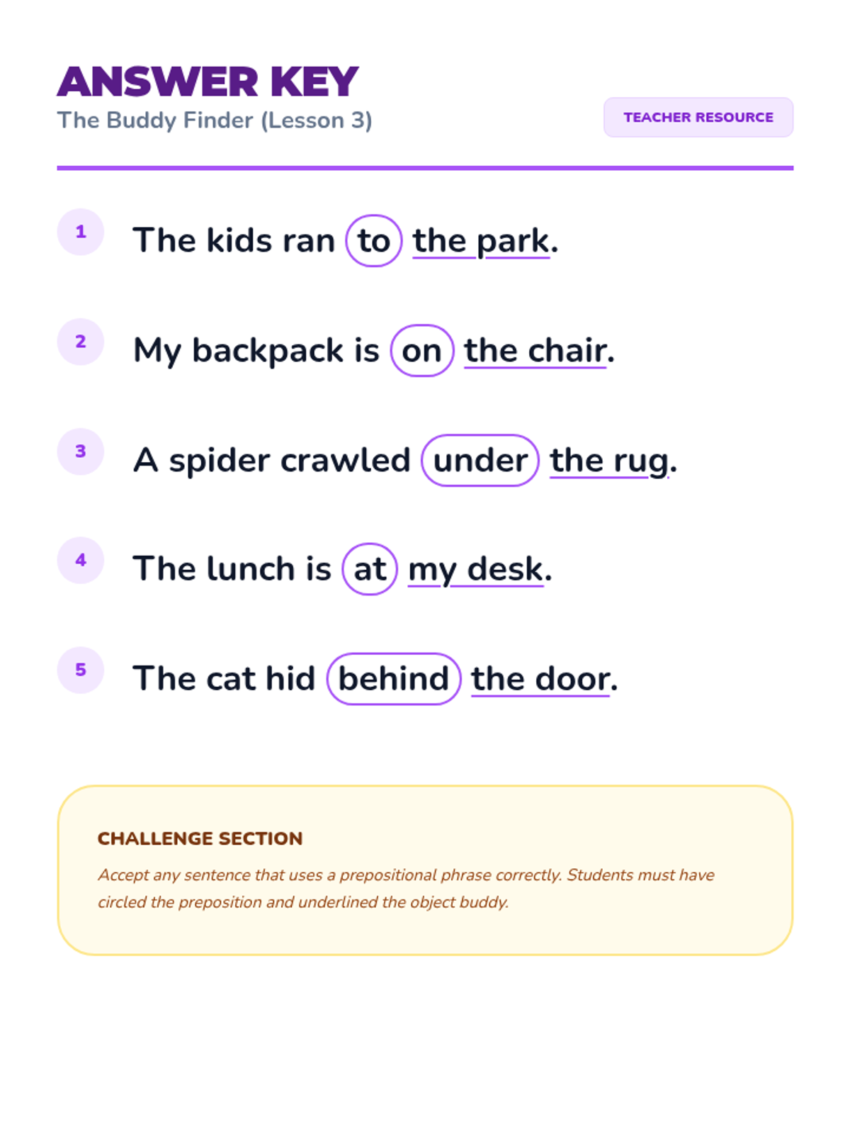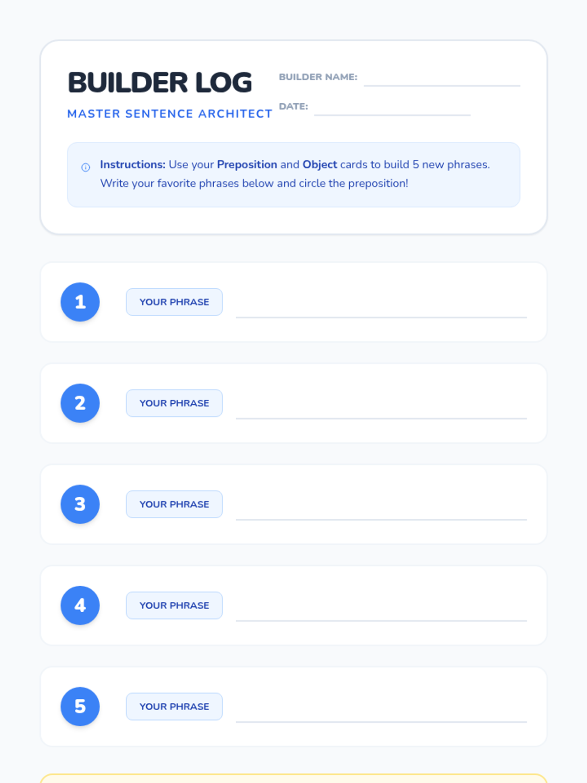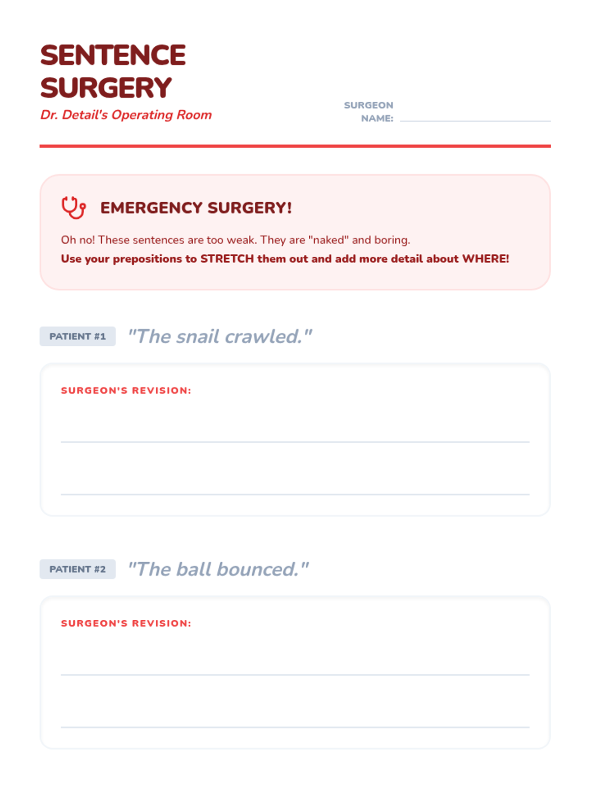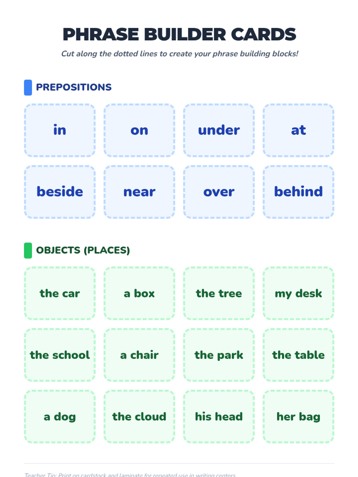 A 1st-grade writing sequence that teaches students how to use prepositional phrases to expand simple sentences, focusing on 'where' and 'when' details.
