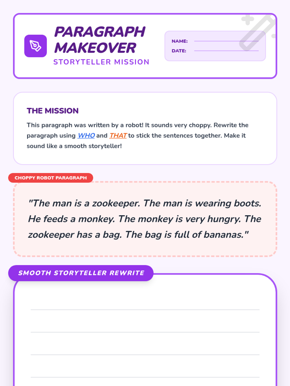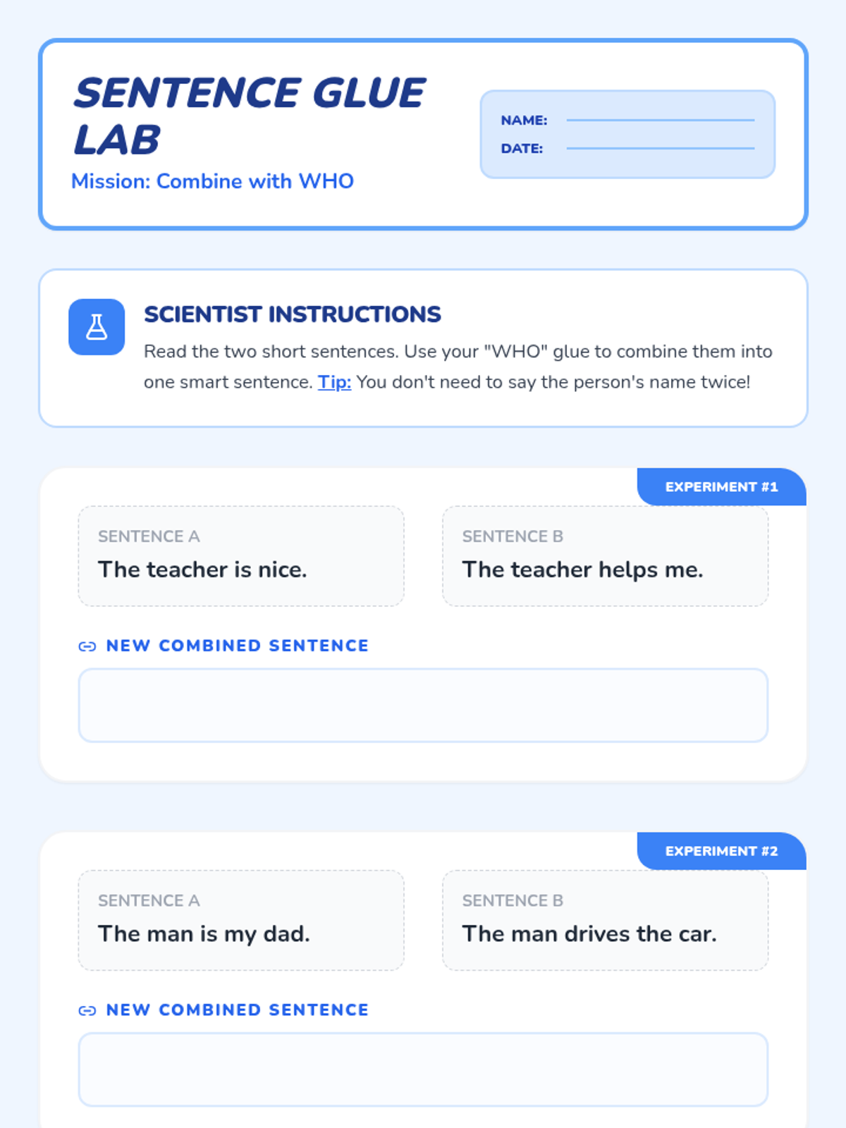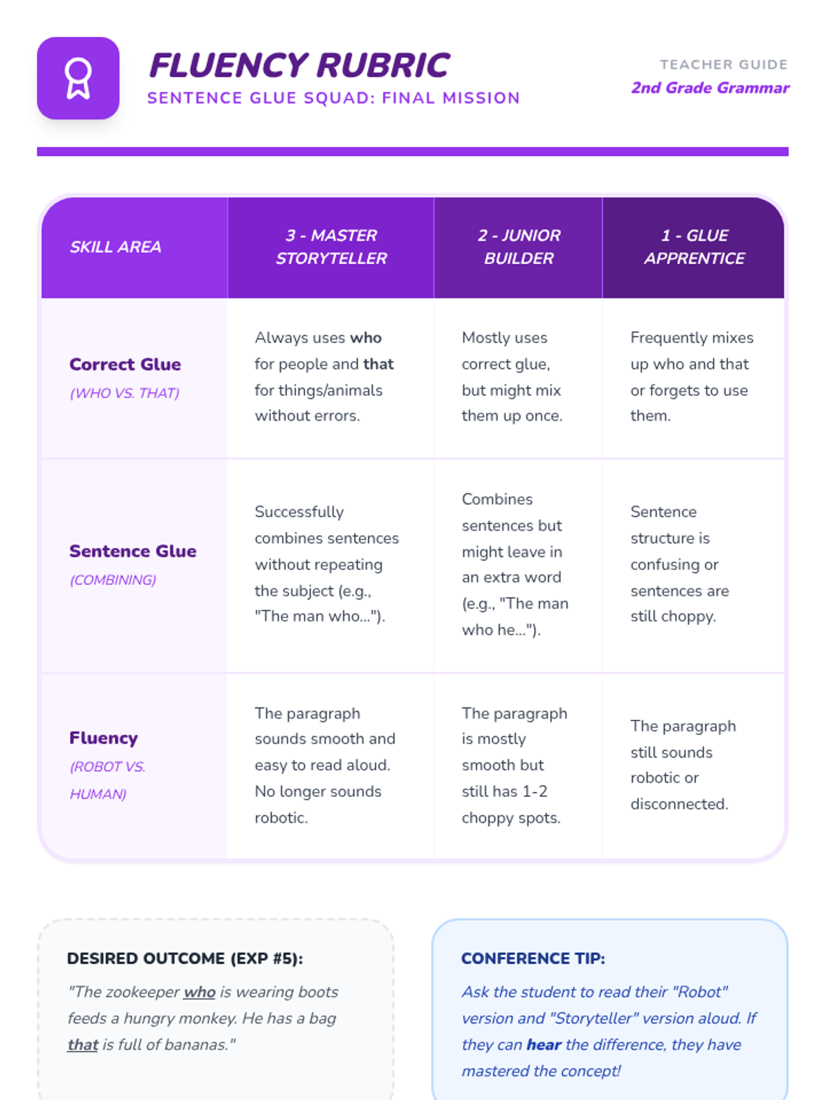 A 2nd-grade grammar sequence focusing on using relative pronouns (who and that) to combine simple sentences into descriptive ones. Through a 'Sentence Glue' theme, students learn to differentiate between human and non-human antecedents and improve their writing fluency.