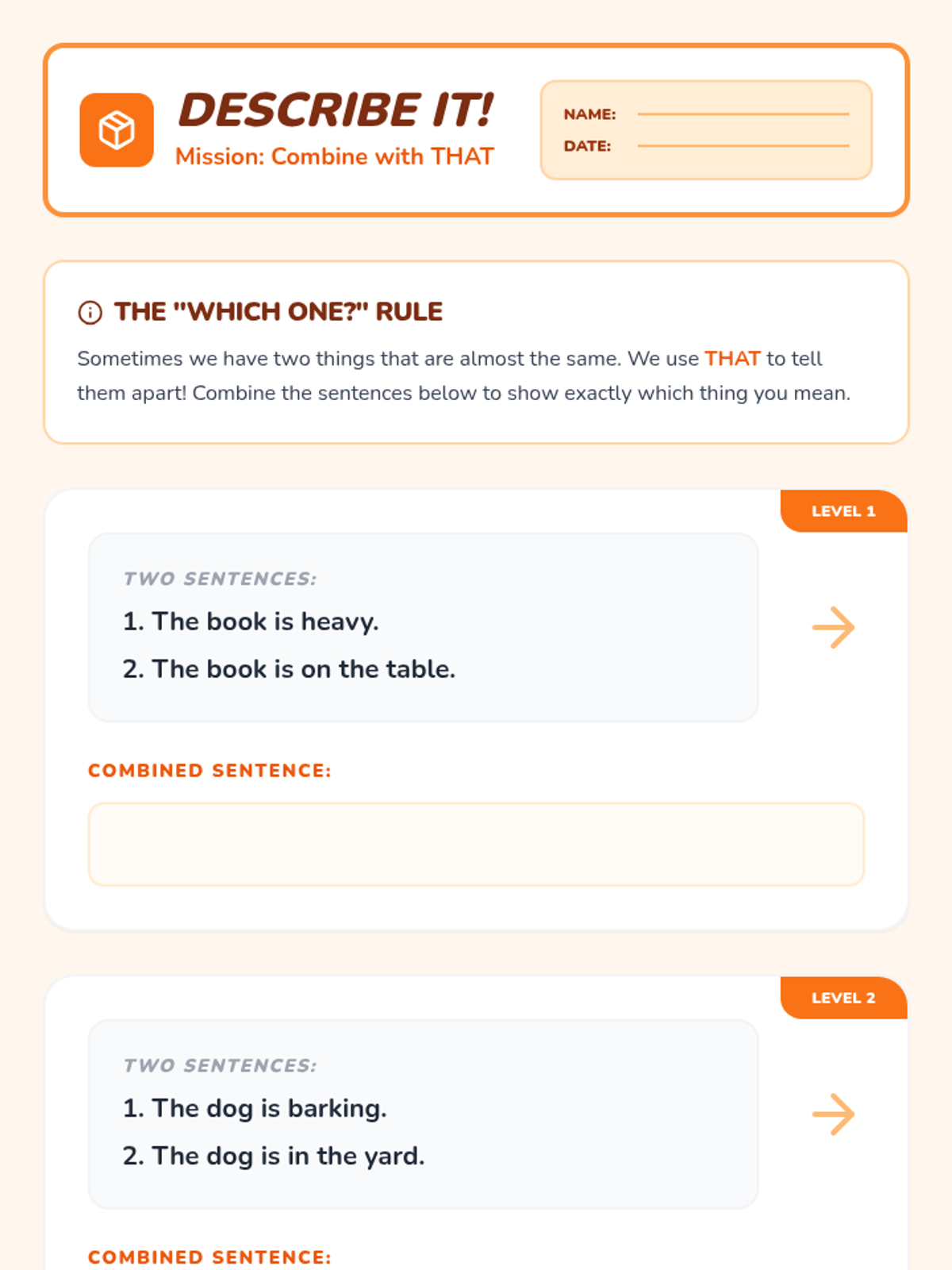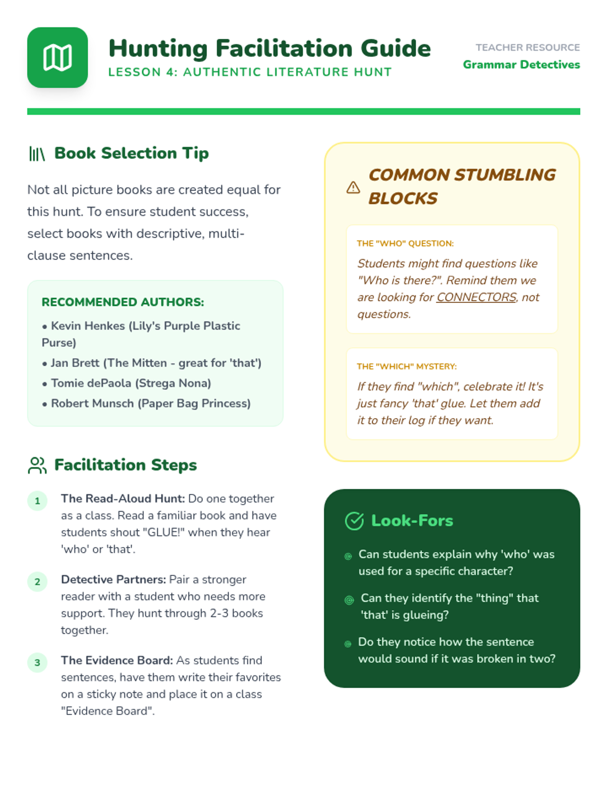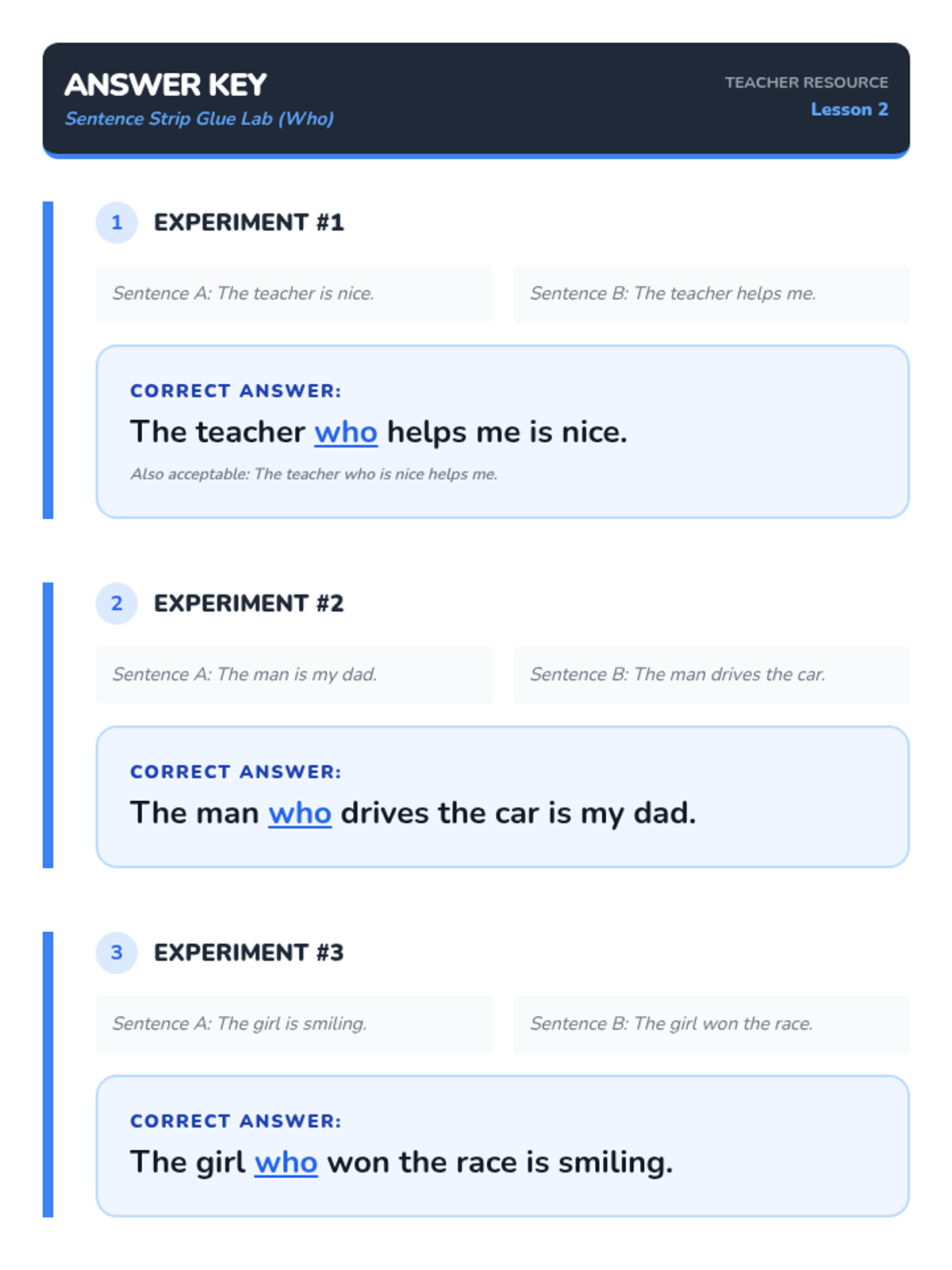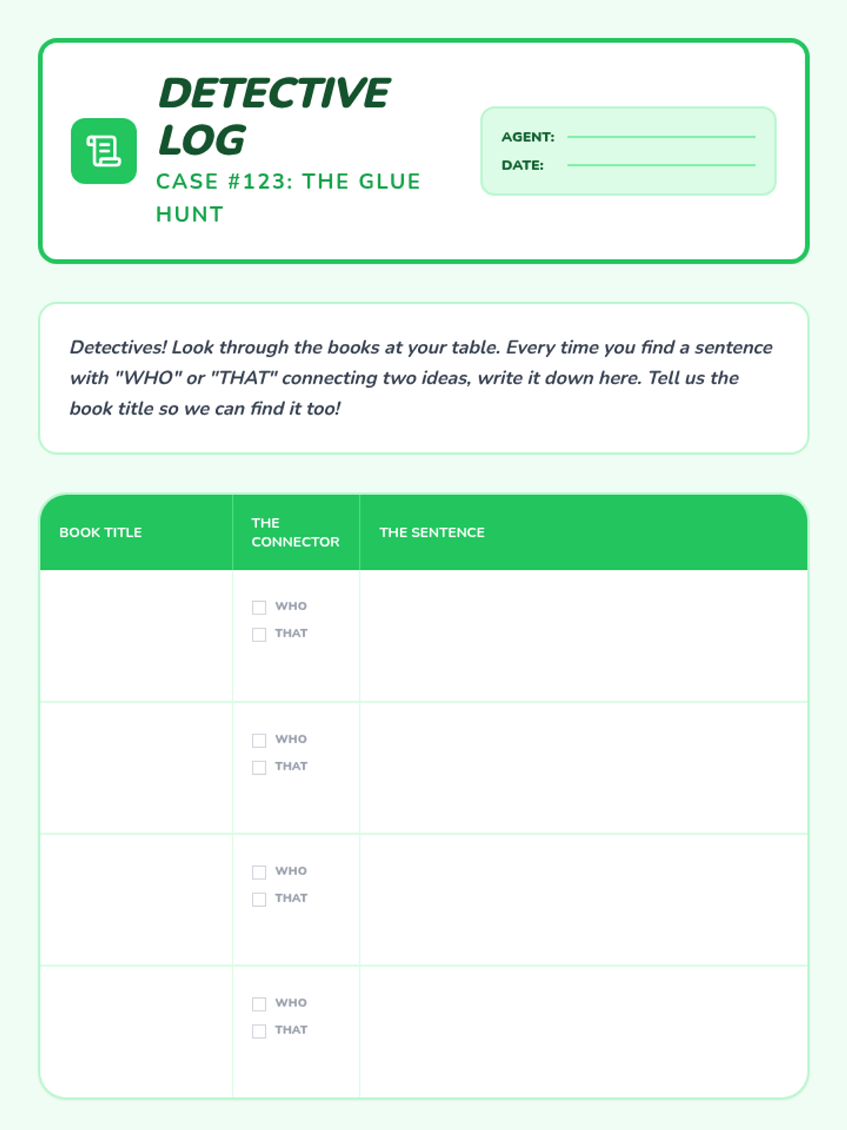 A 2nd-grade grammar sequence focusing on using relative pronouns (who and that) to combine simple sentences into descriptive ones. Through a 'Sentence Glue' theme, students learn to differentiate between human and non-human antecedents and improve their writing fluency.