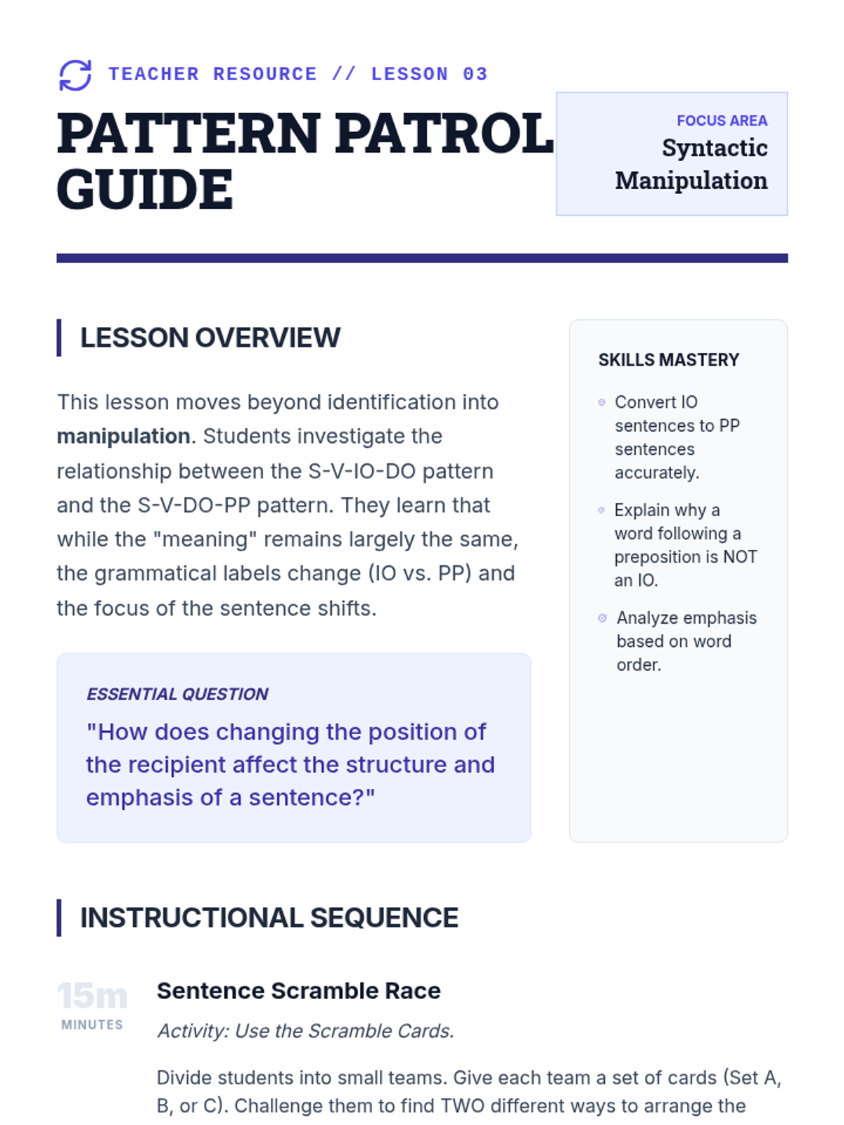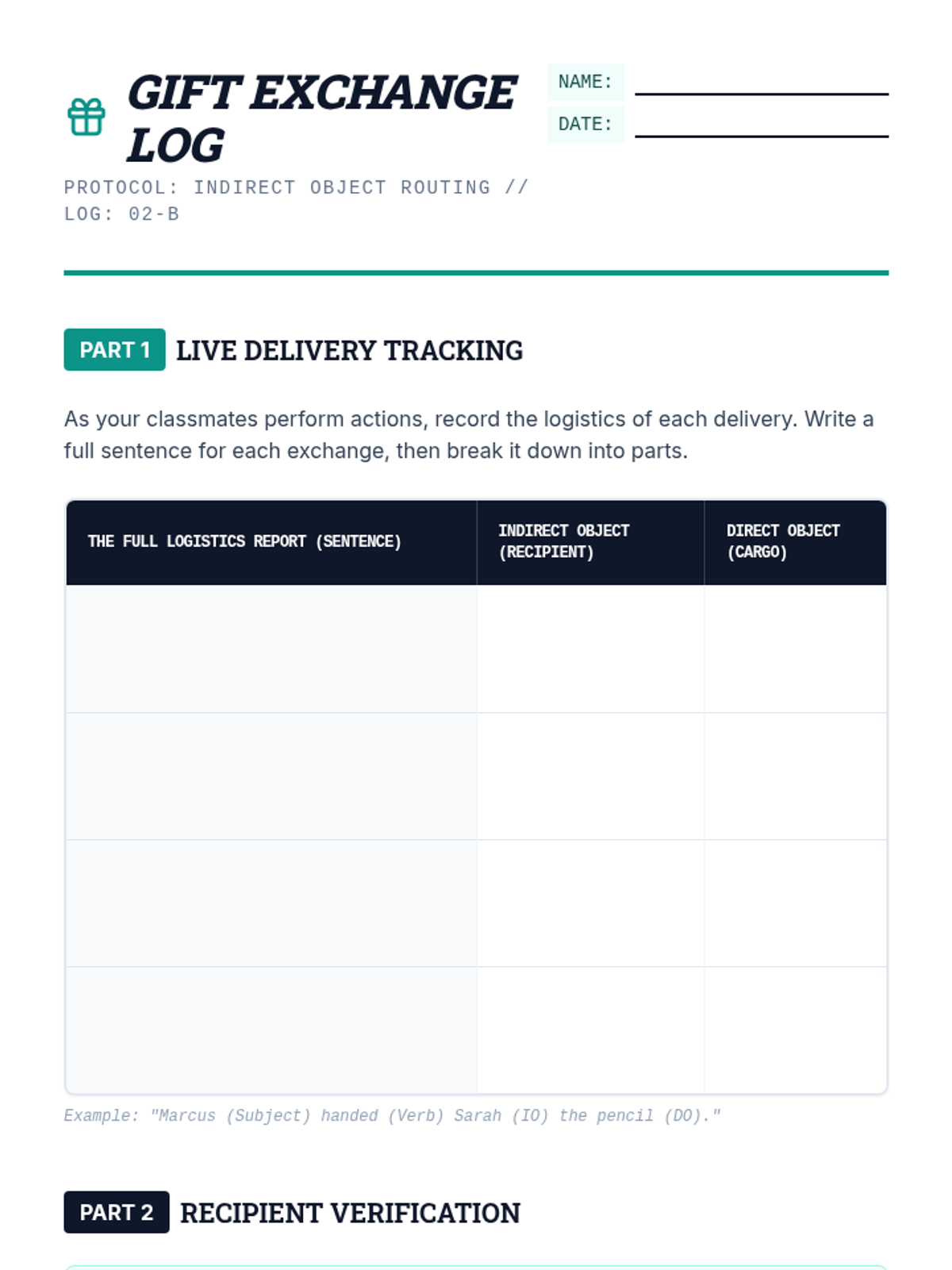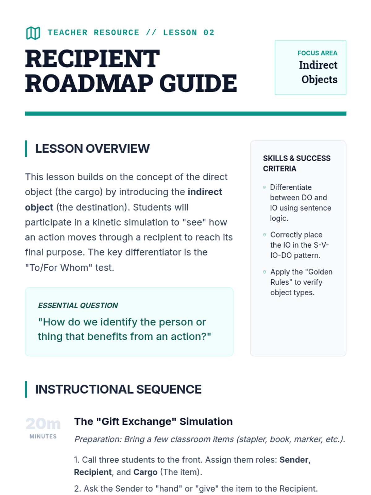 A comprehensive 6th-grade ELA sequence exploring the mechanics of direct and indirect objects. Students transition from identifying basic transitive action to manipulating complex sentence patterns and applying these structures in narrative writing using a 'Sentence Logistics' theme.