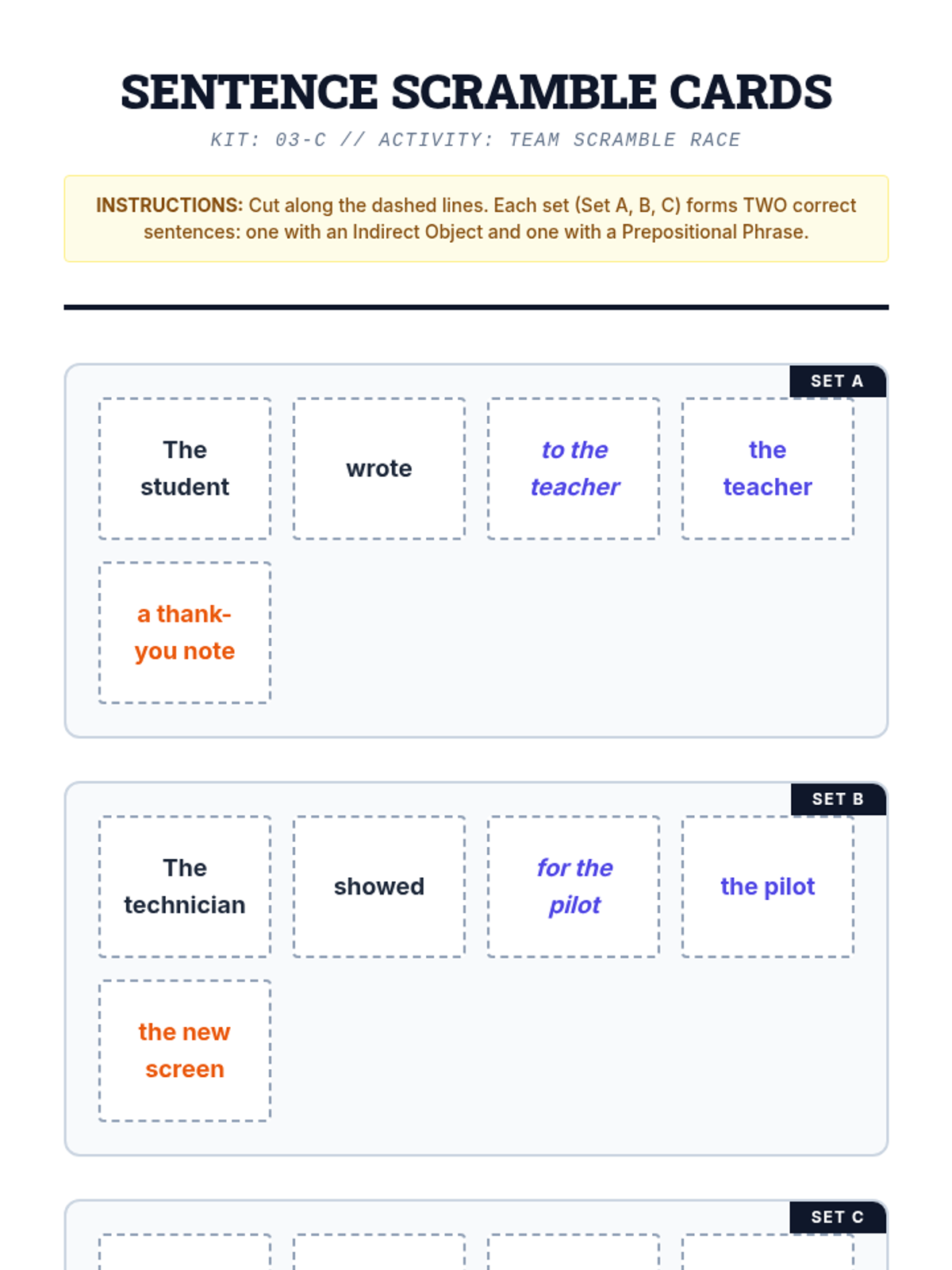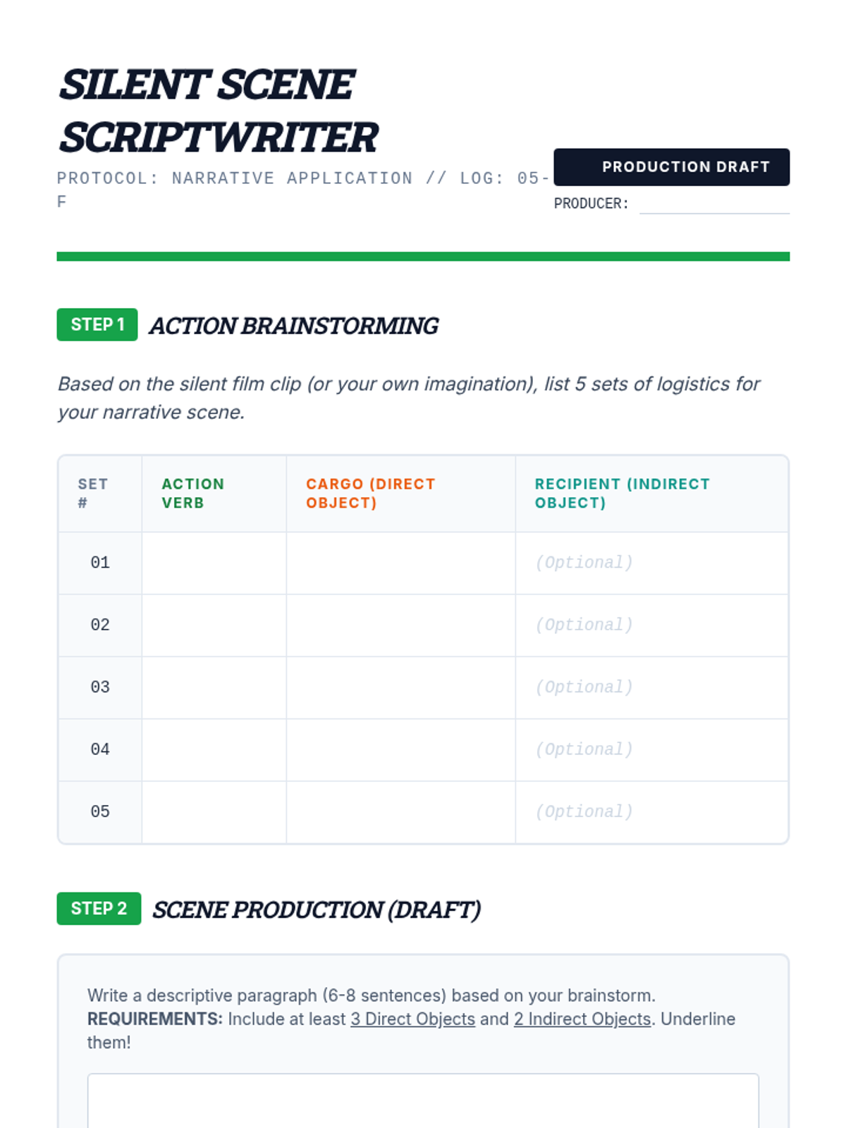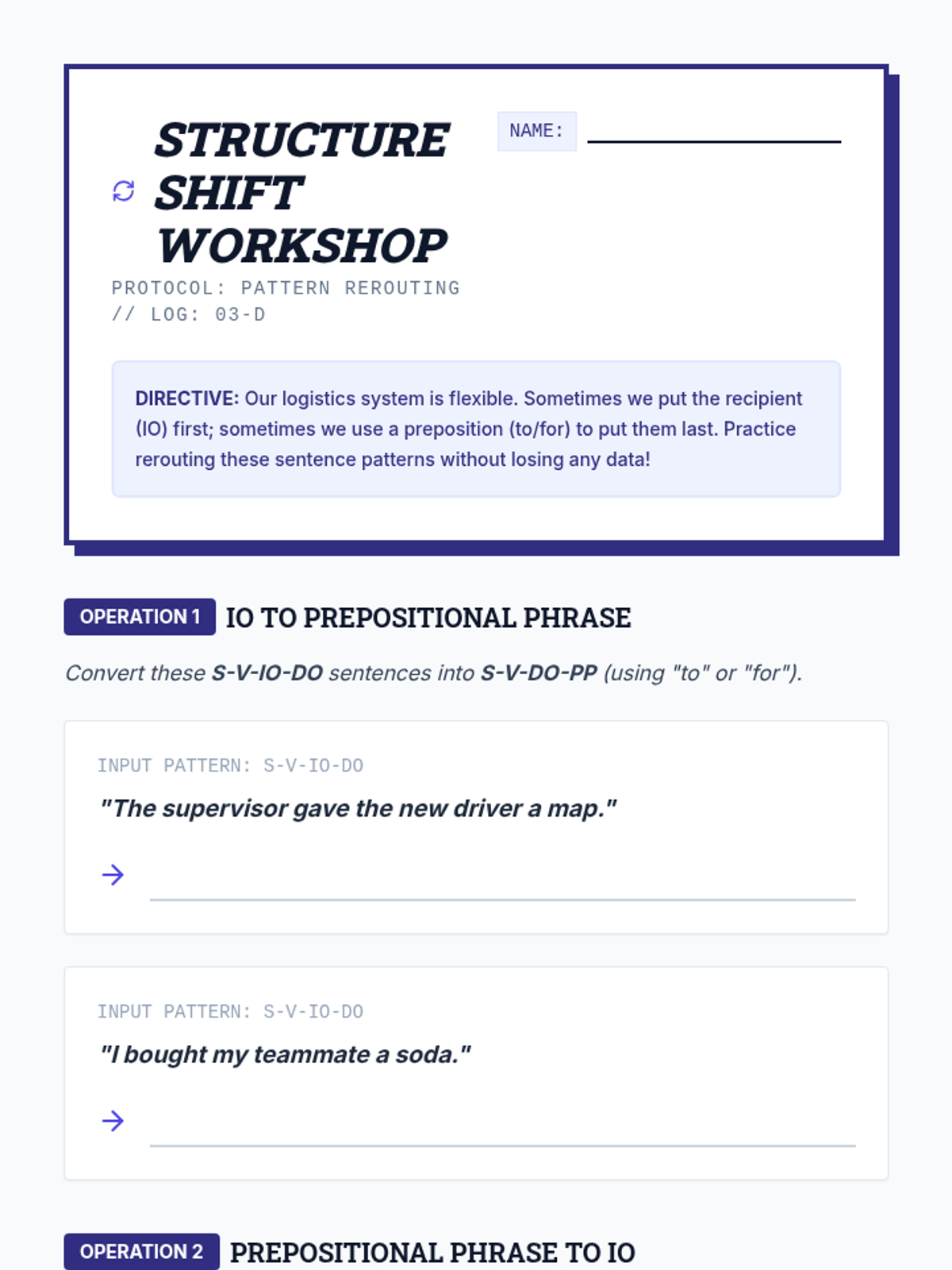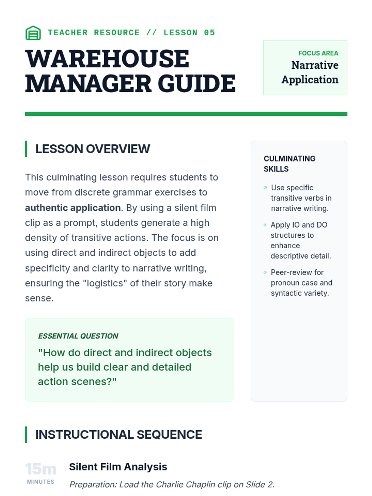A comprehensive 6th-grade ELA sequence exploring the mechanics of direct and indirect objects. Students transition from identifying basic transitive action to manipulating complex sentence patterns and applying these structures in narrative writing using a 'Sentence Logistics' theme.