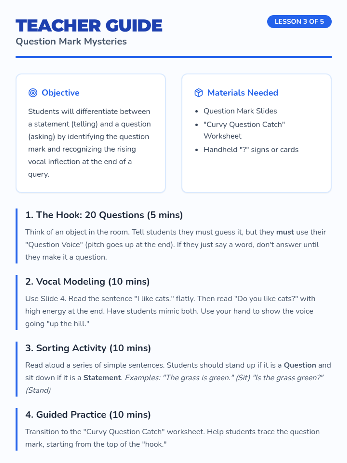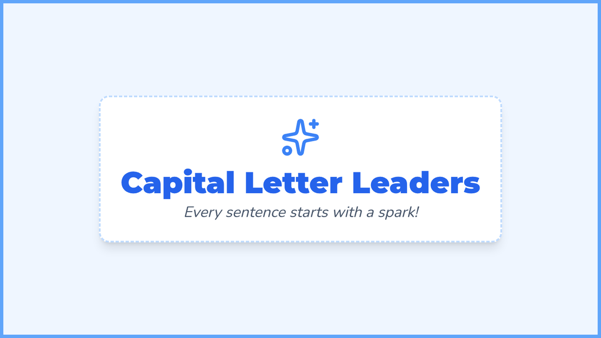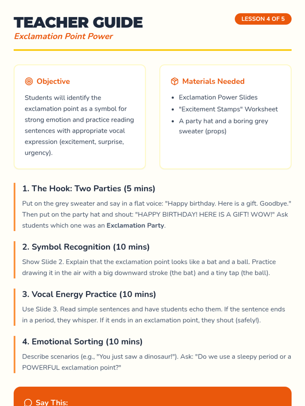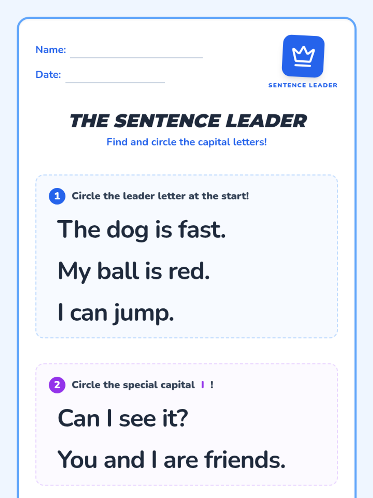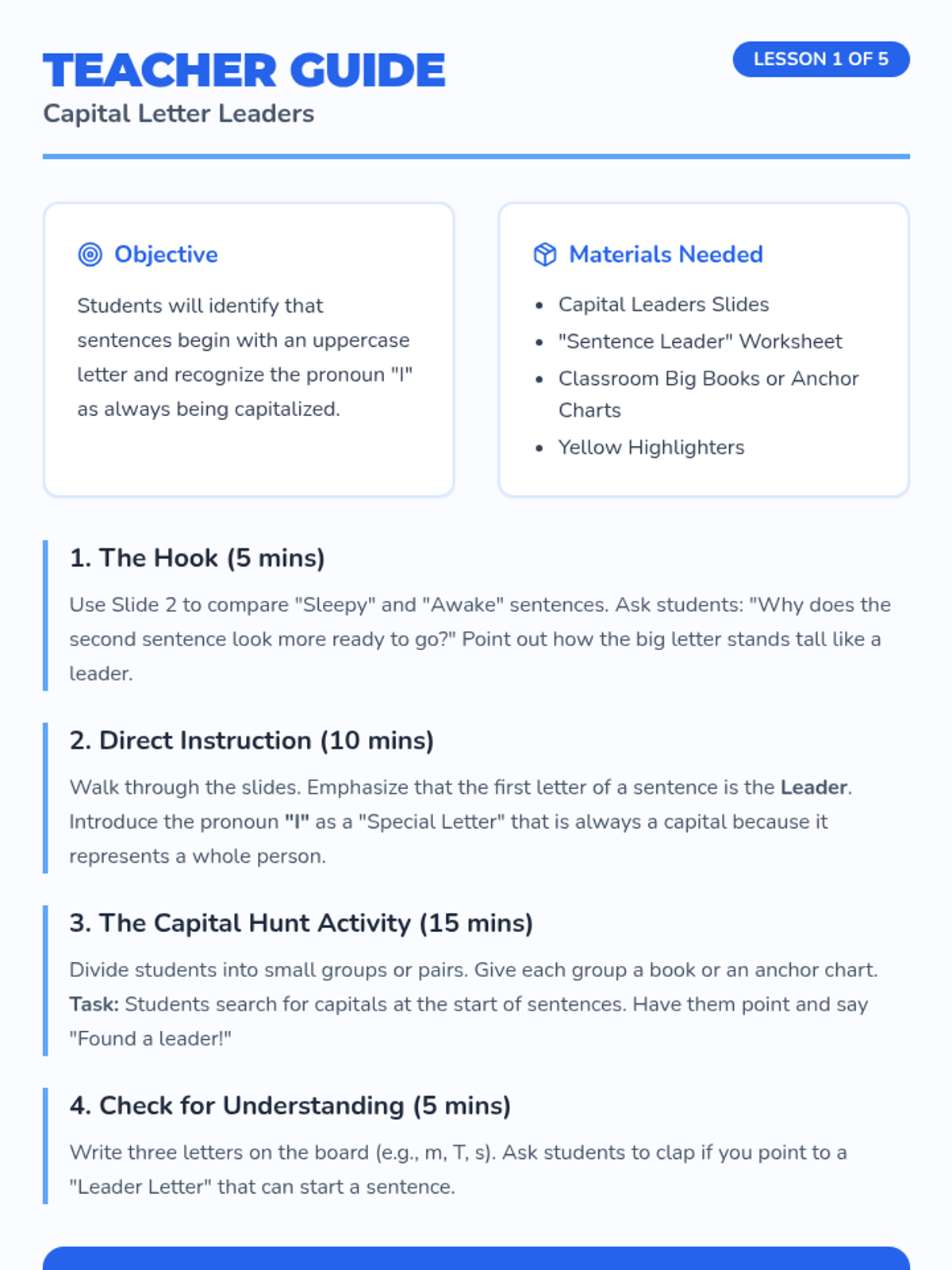 A Kindergarten ELA sequence focused on foundational sentence mechanics, teaching students to identify and use capital letters at the start of sentences and the pronoun 'I', as well as understanding the purpose of periods, question marks, and exclamation points.