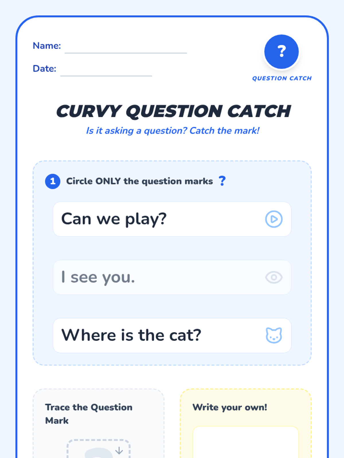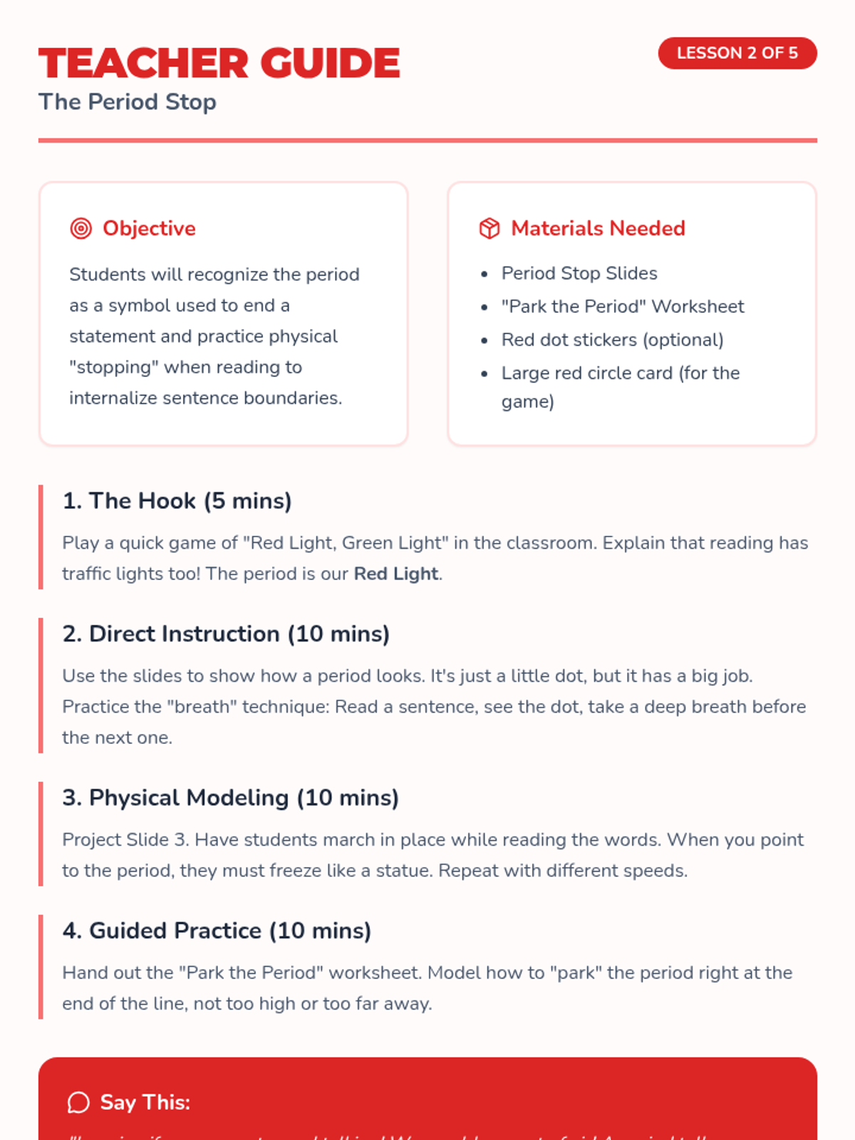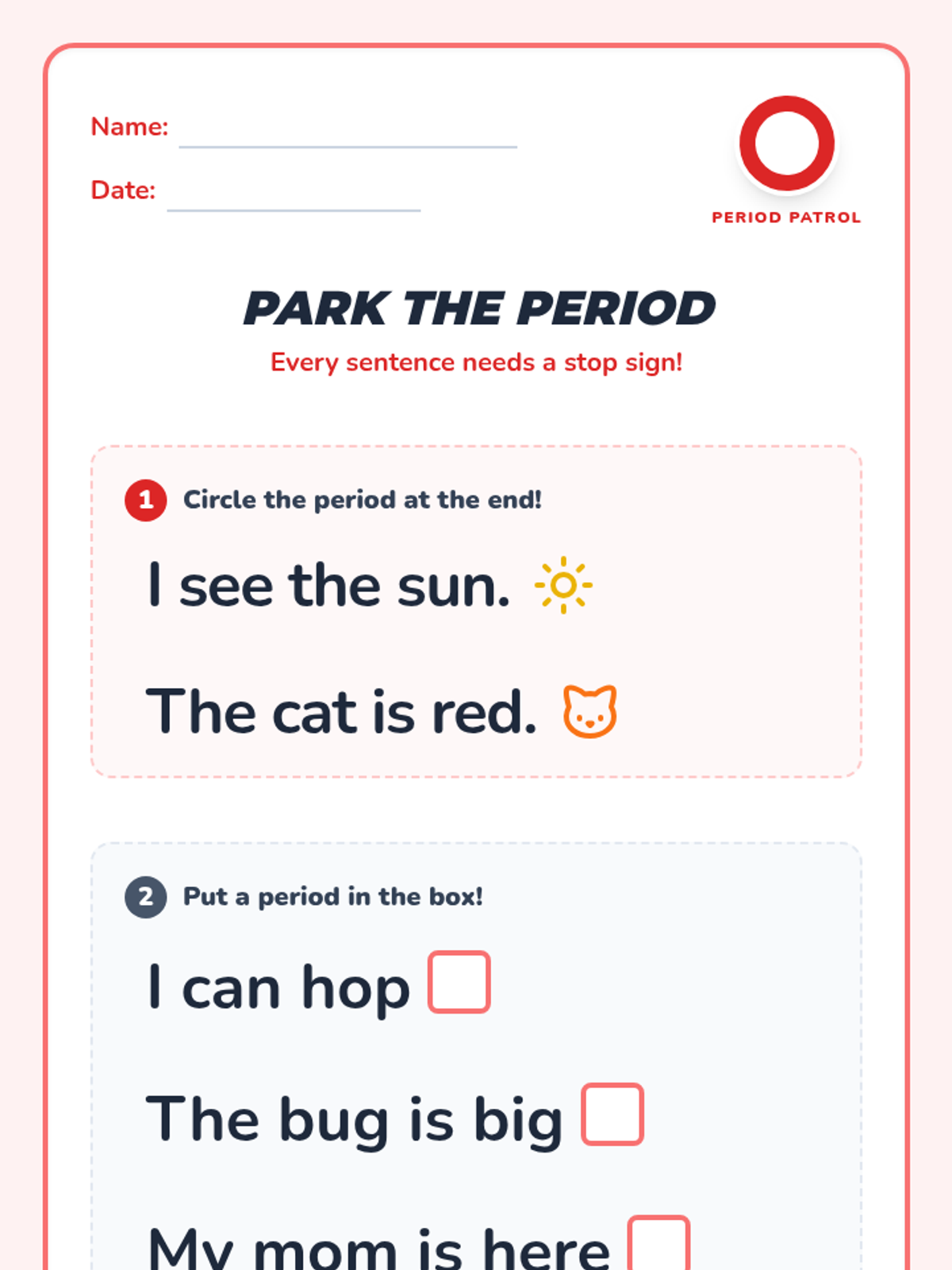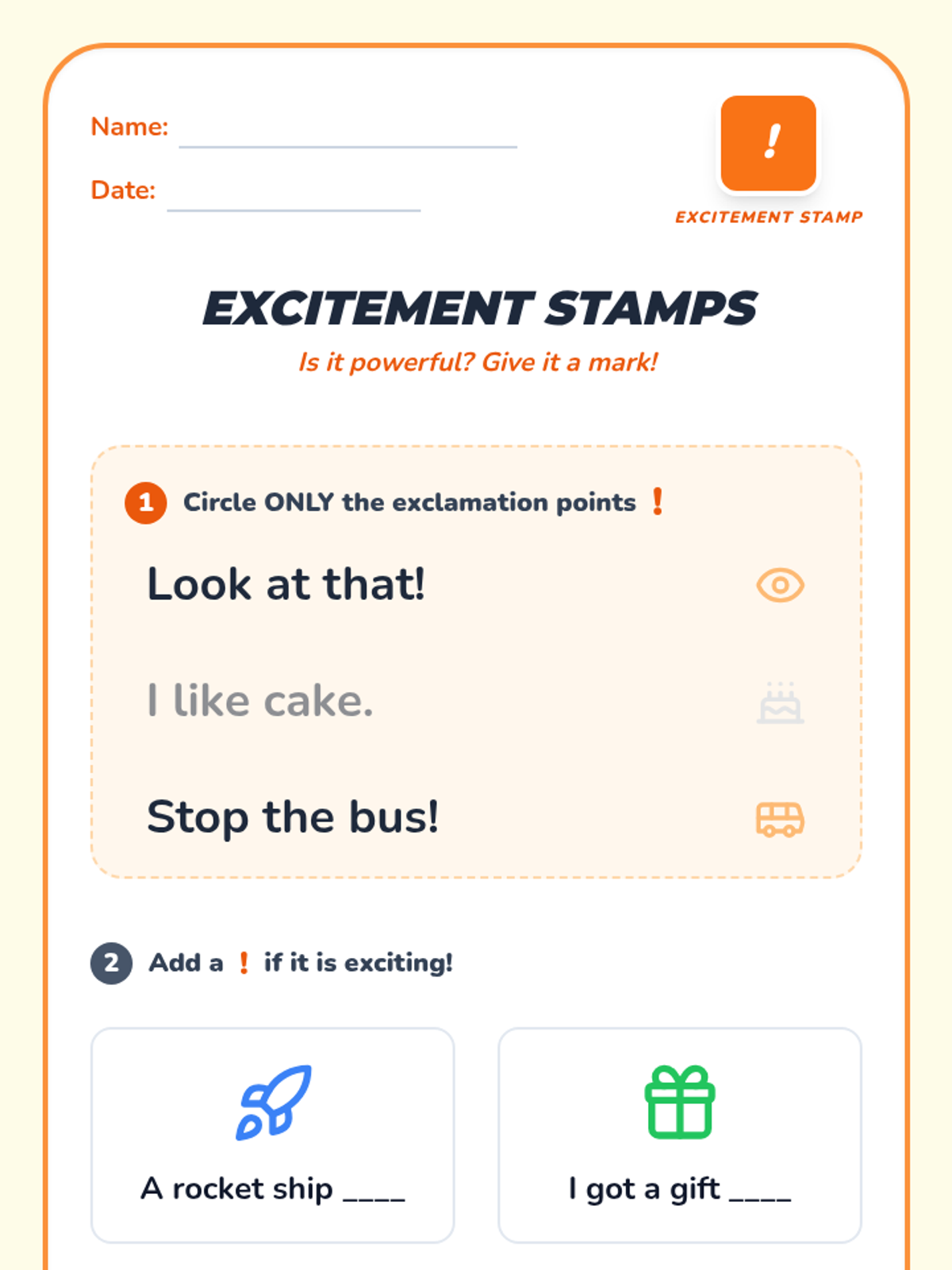 A Kindergarten ELA sequence focused on foundational sentence mechanics, teaching students to identify and use capital letters at the start of sentences and the pronoun 'I', as well as understanding the purpose of periods, question marks, and exclamation points.