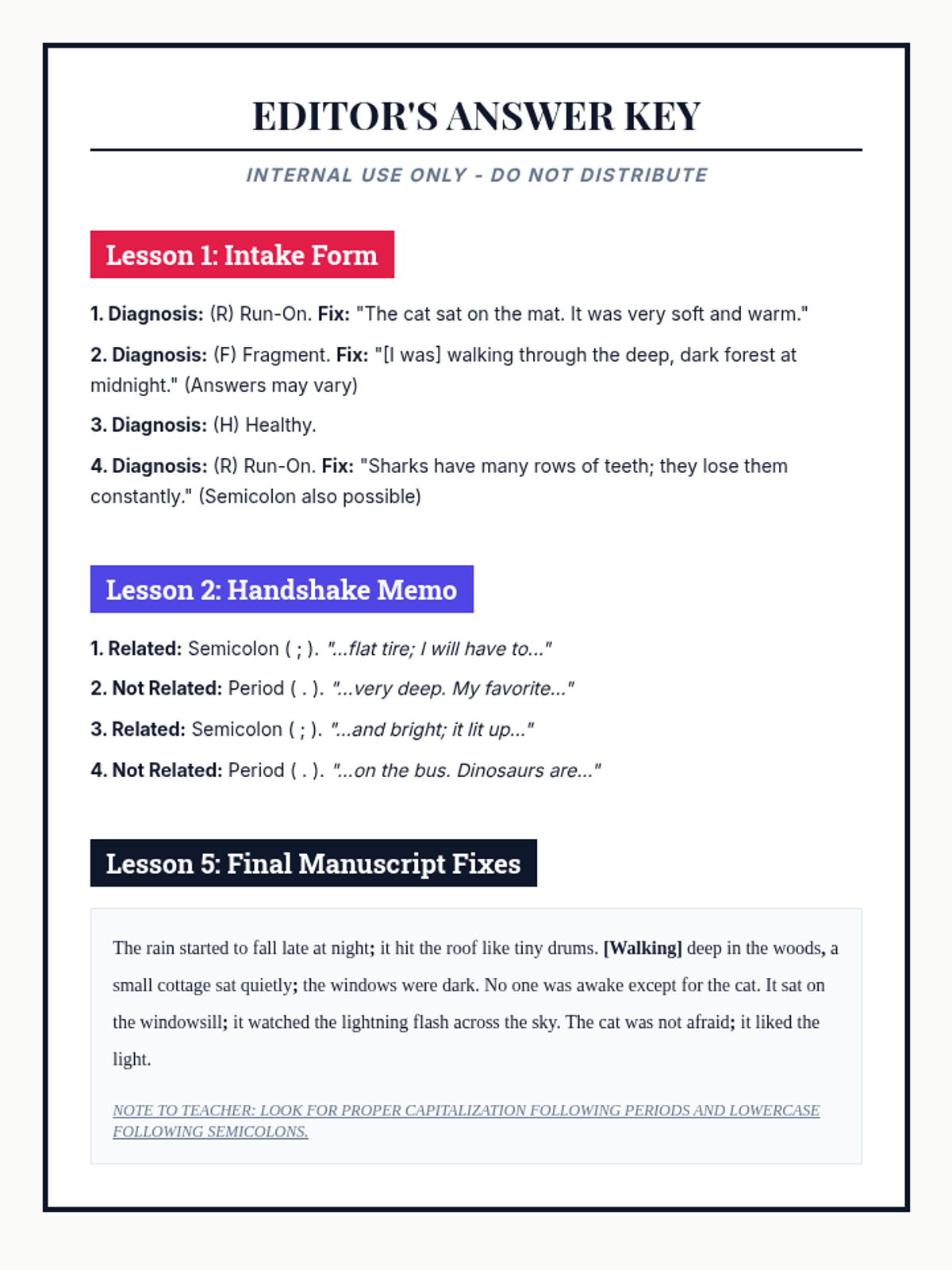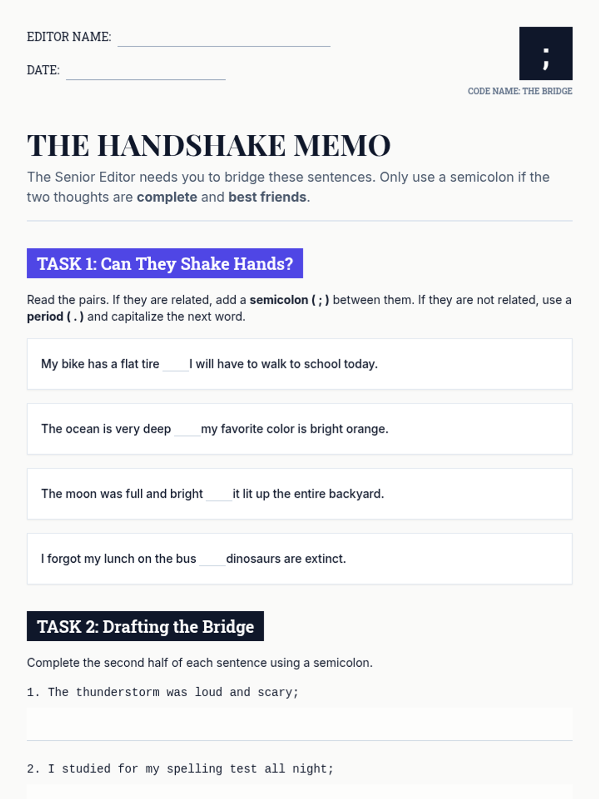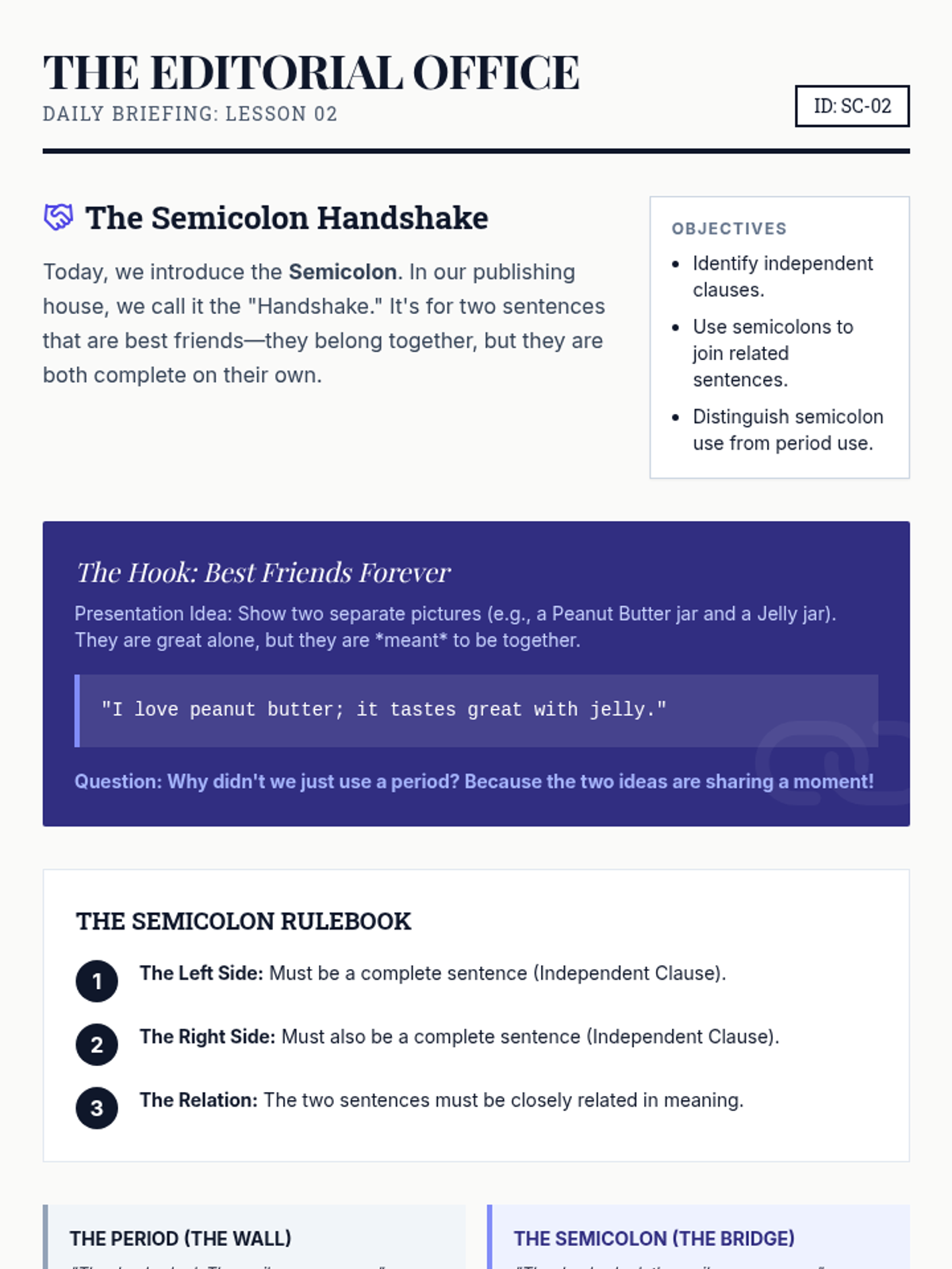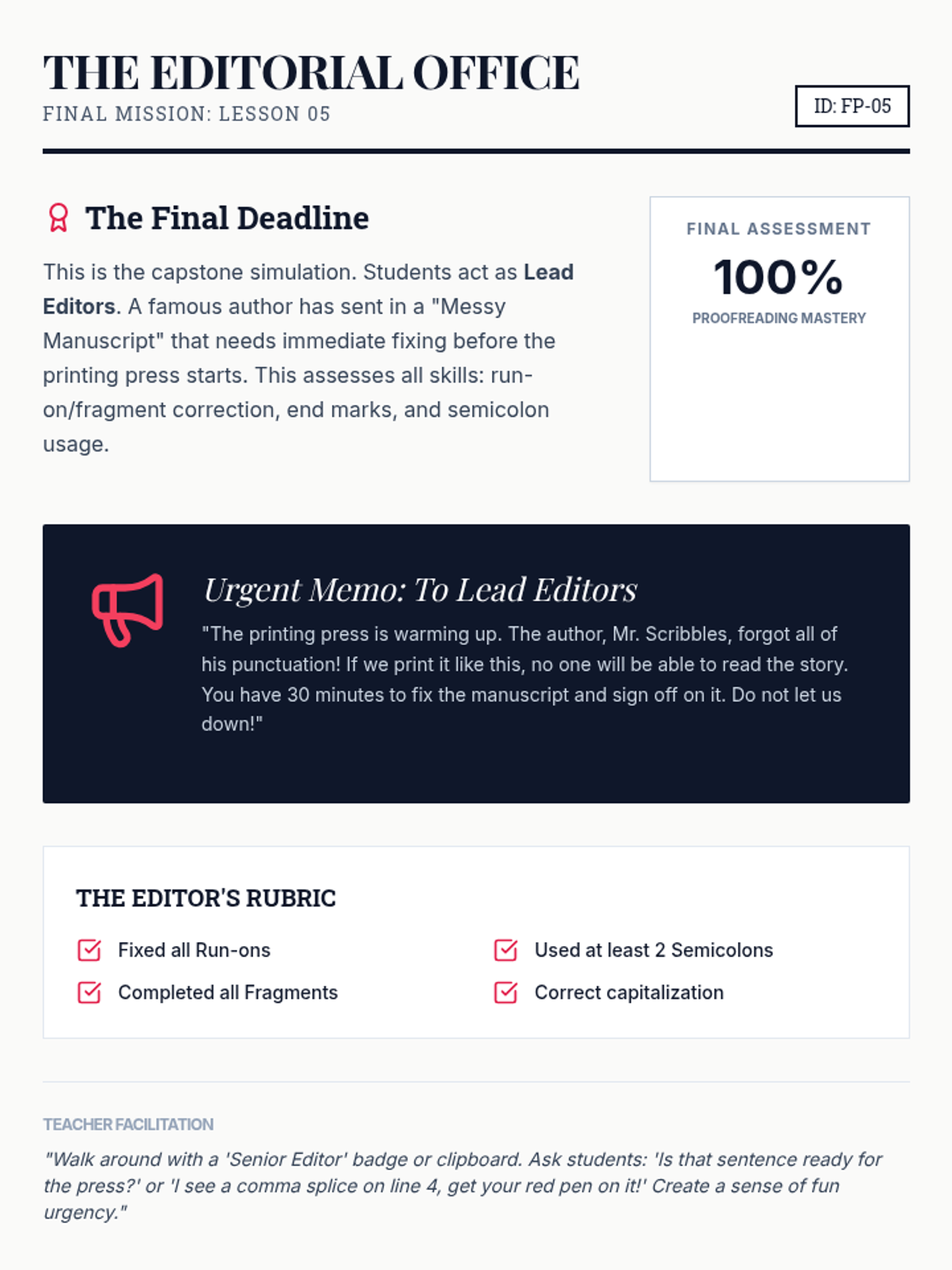 A 4th-grade grammar sequence where students act as editors in a publishing house, mastering sentence boundaries, end marks, and the semicolon to improve writing flow and clarity.
