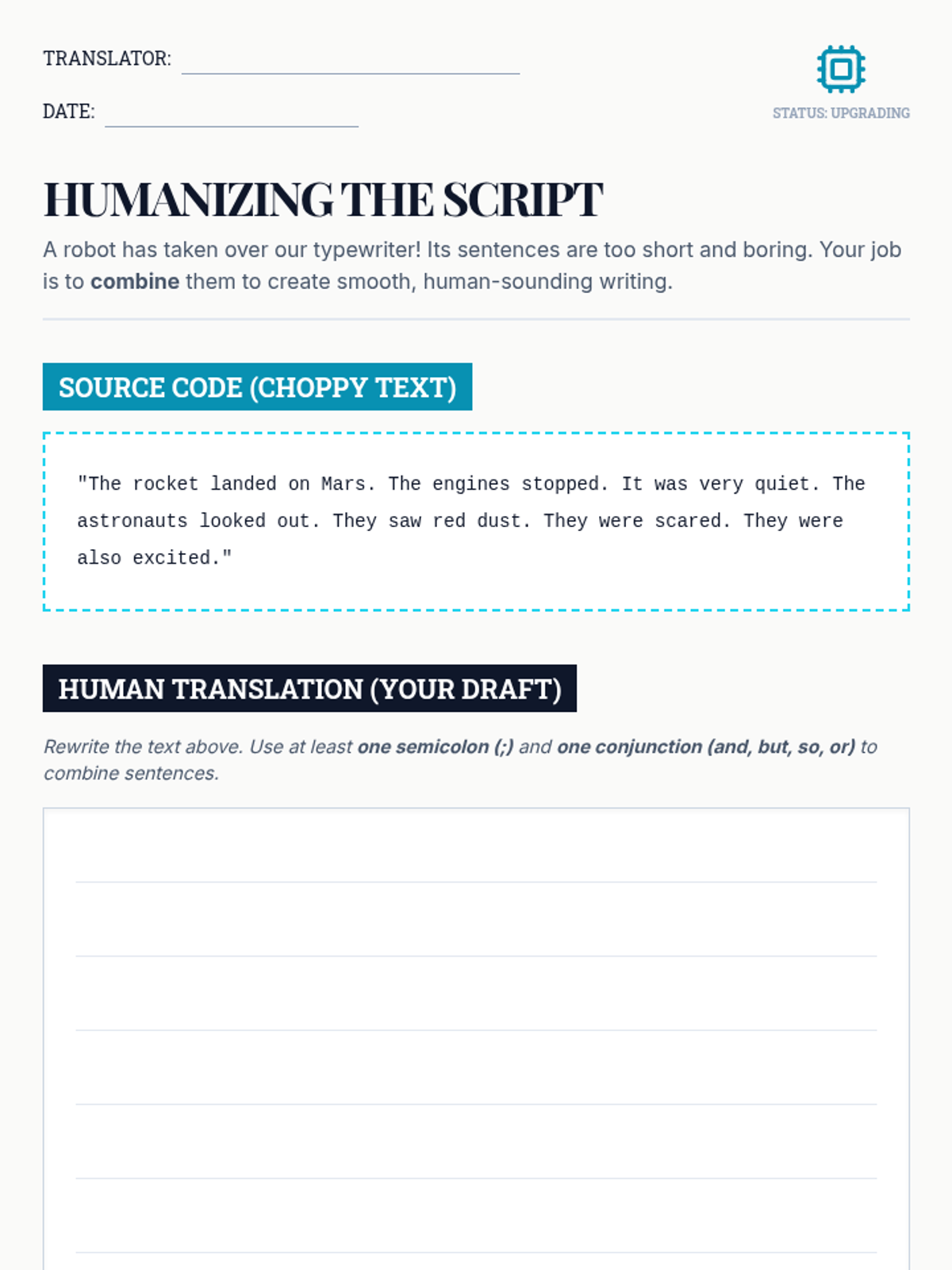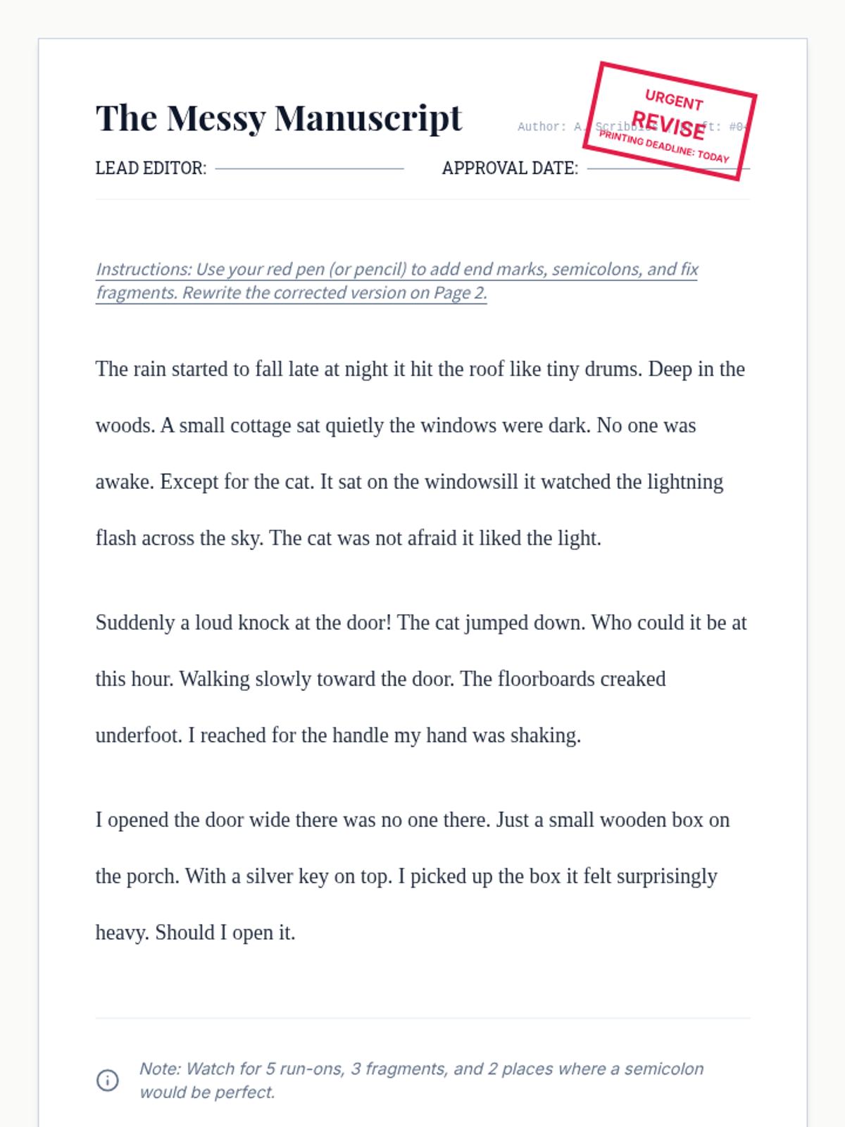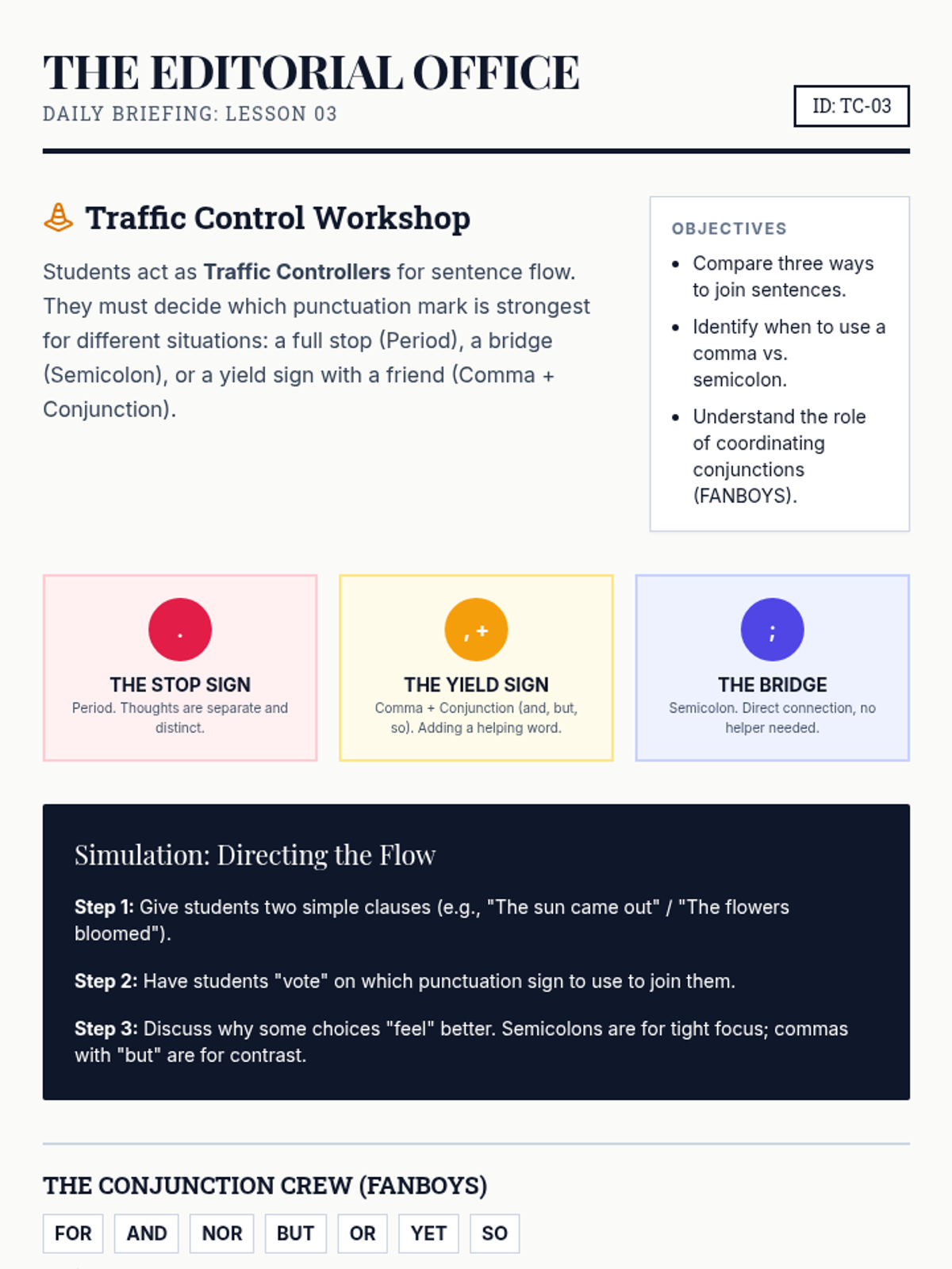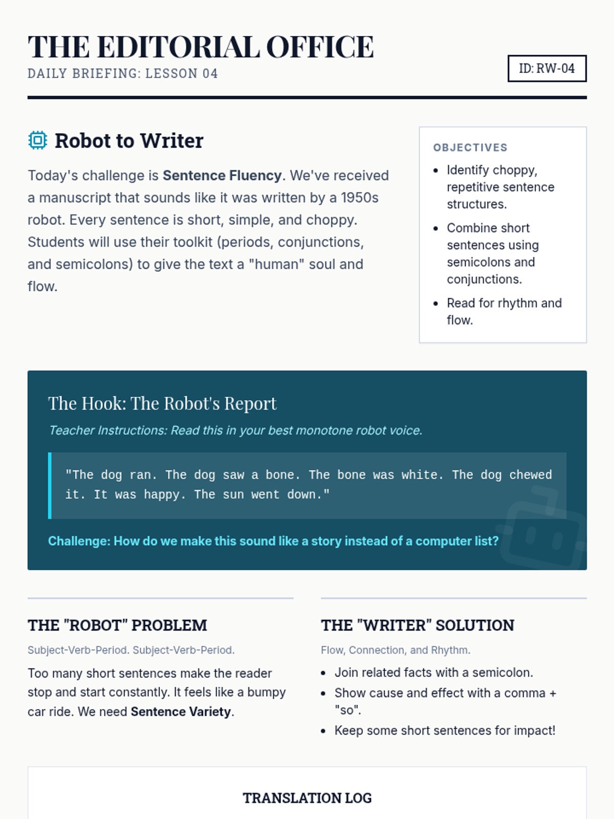 A 4th-grade grammar sequence where students act as editors in a publishing house, mastering sentence boundaries, end marks, and the semicolon to improve writing flow and clarity.