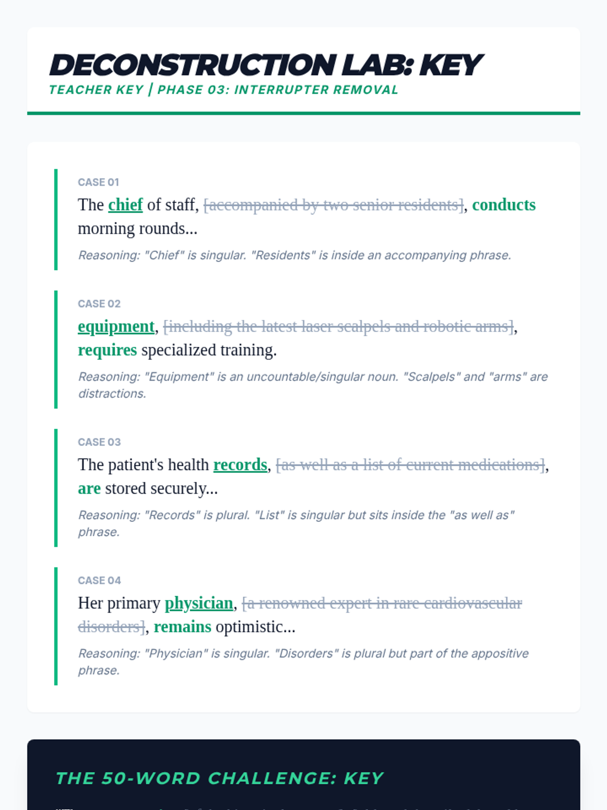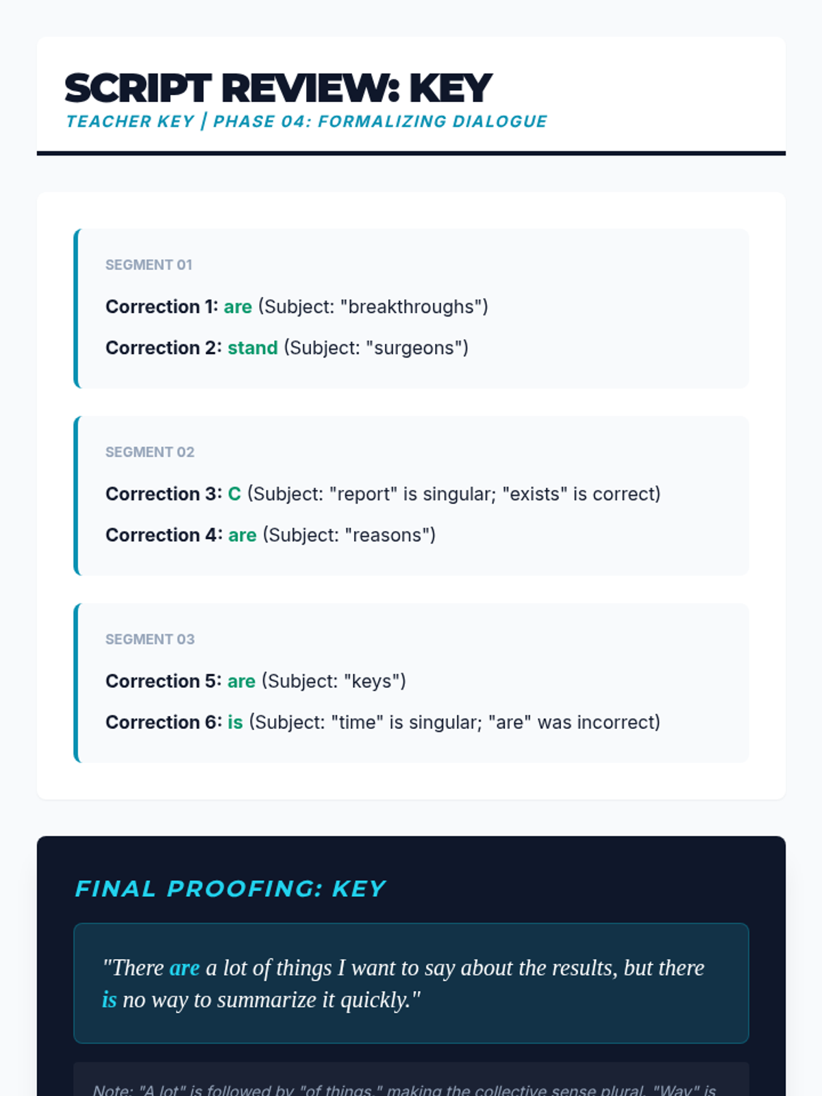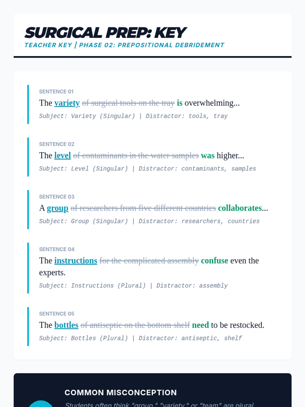 A comprehensive 9th Grade English sequence focusing on subject-verb agreement through sentence analysis. Students learn to navigate intervening phrases, appositives, and inverted structures to ensure grammatical precision in complex writing.