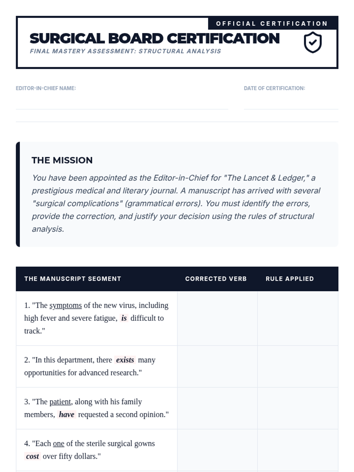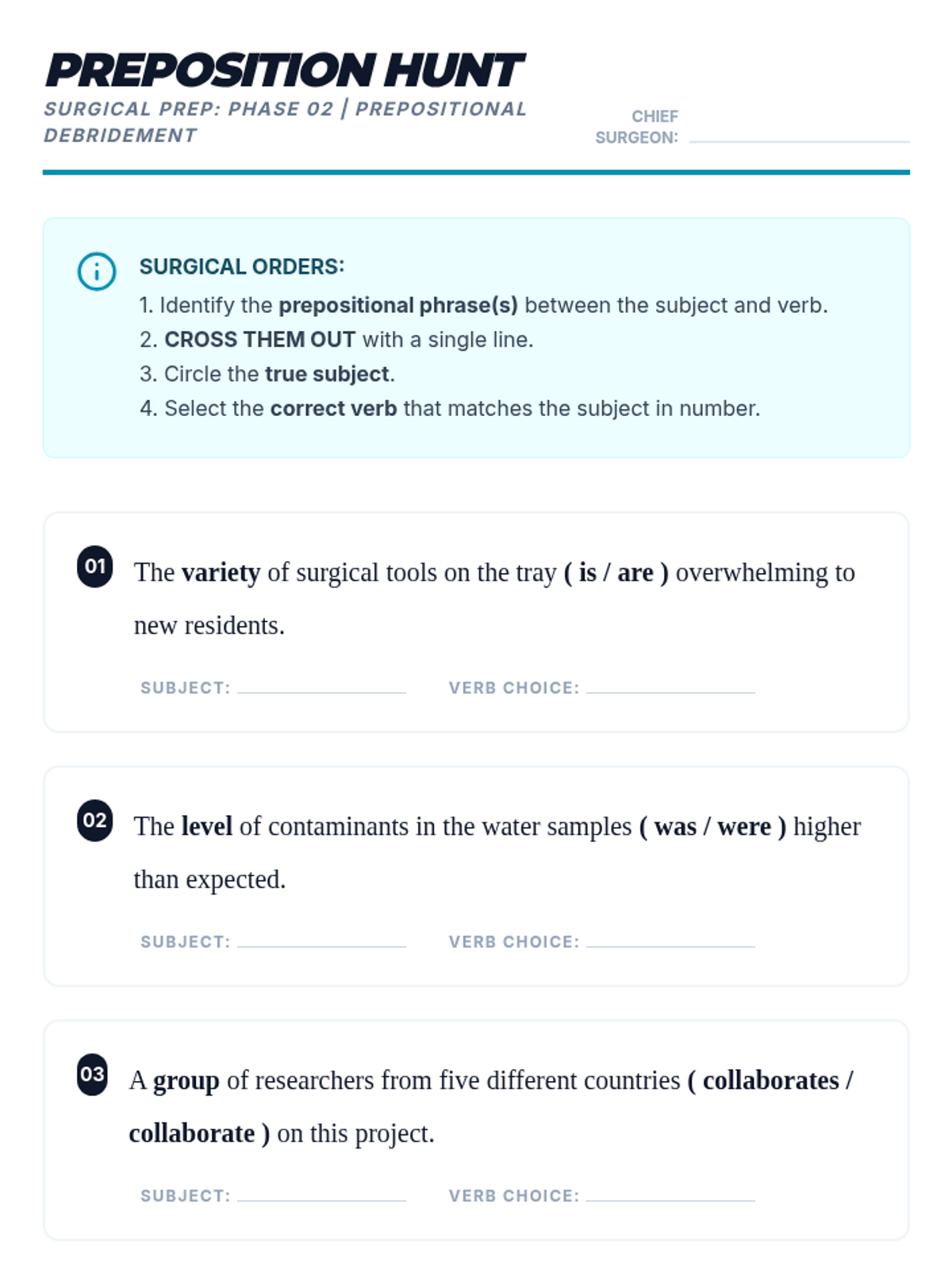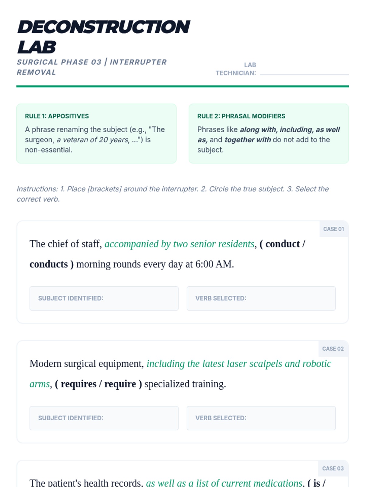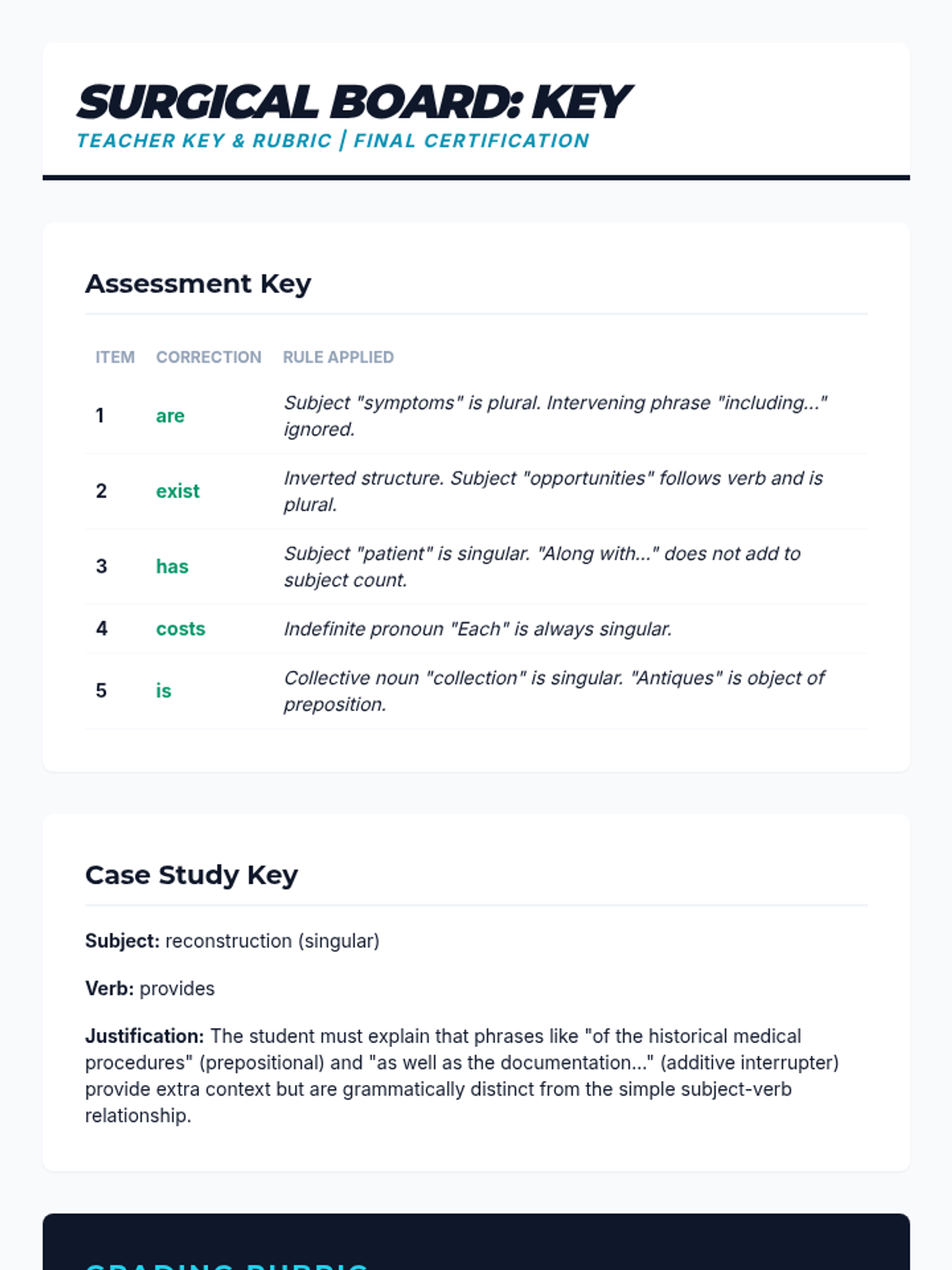 A comprehensive 9th Grade English sequence focusing on subject-verb agreement through sentence analysis. Students learn to navigate intervening phrases, appositives, and inverted structures to ensure grammatical precision in complex writing.