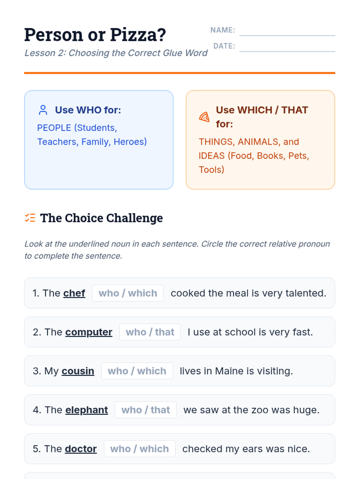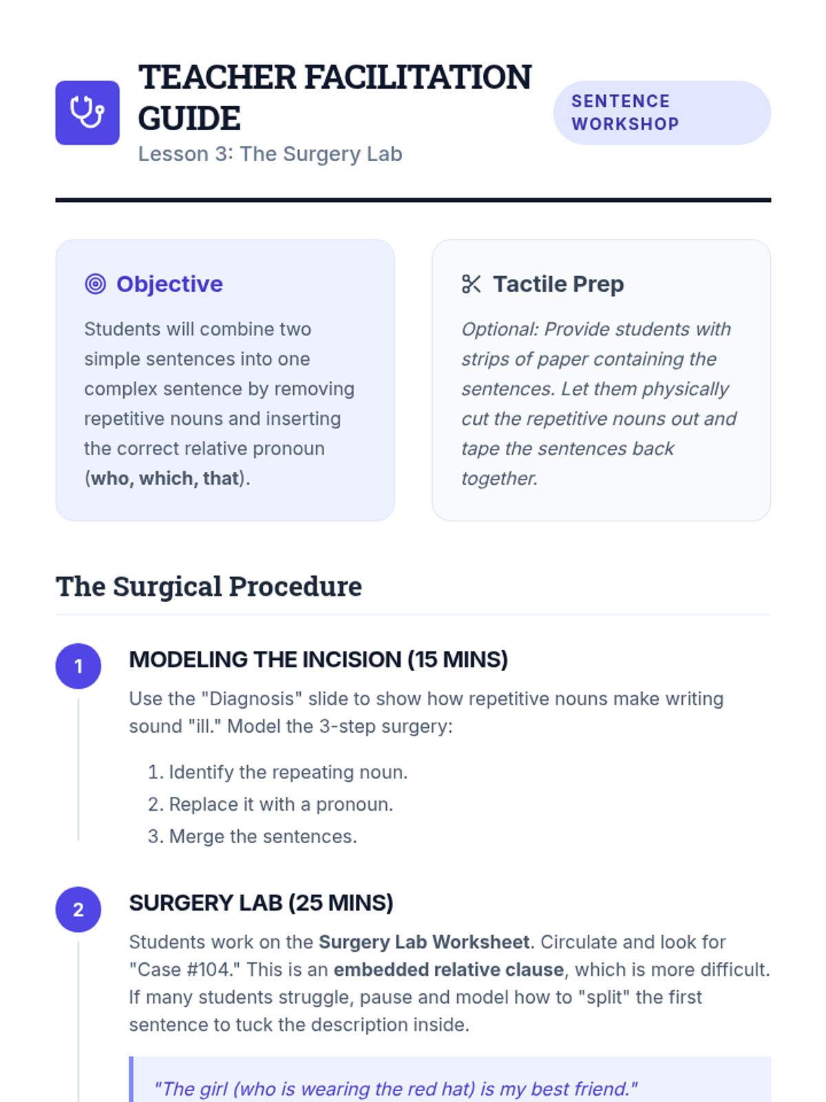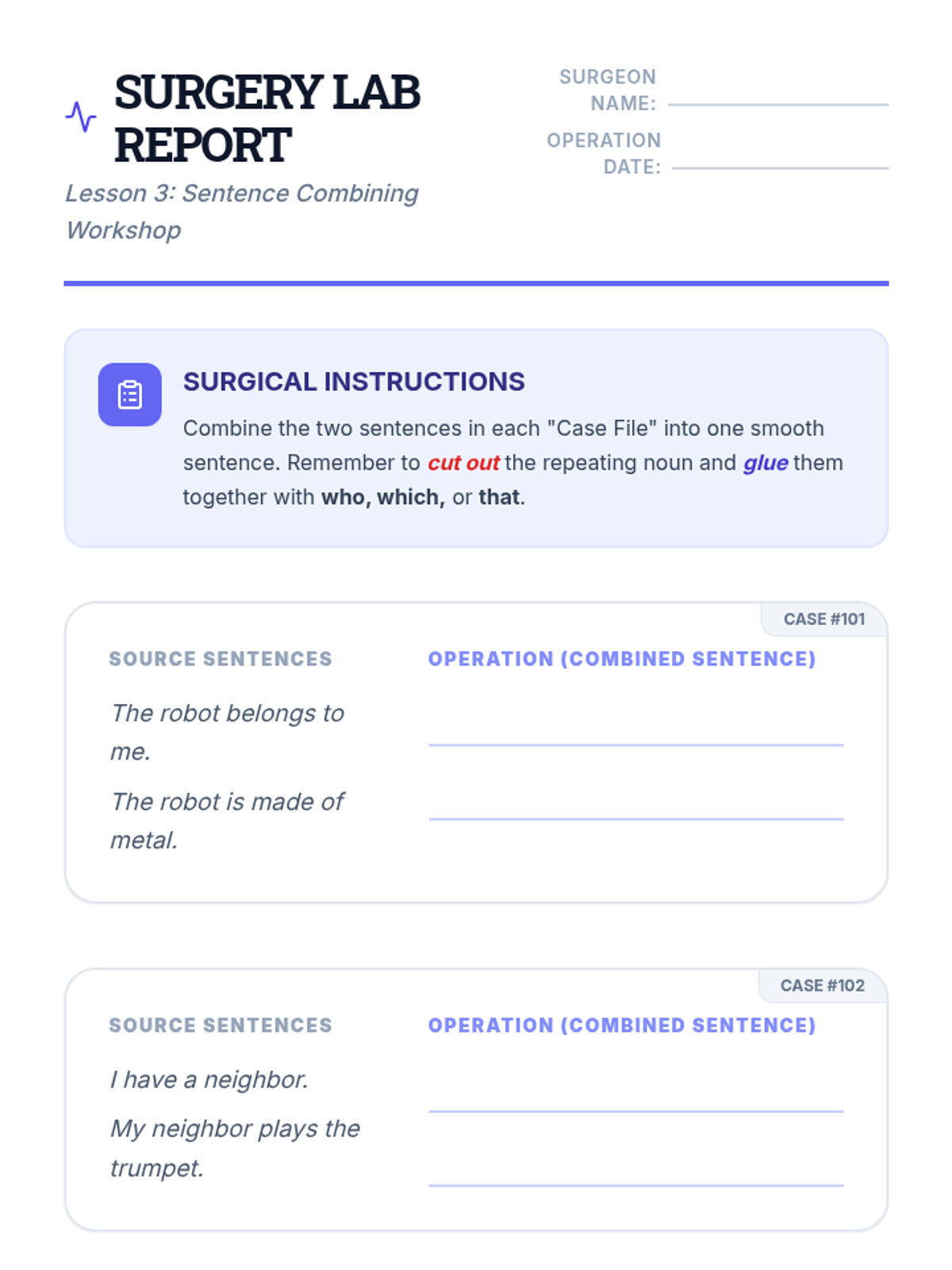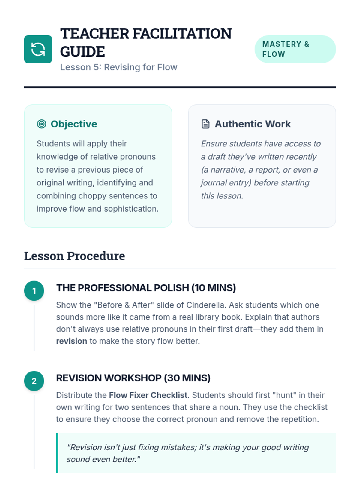 This workshop-style sequence teaches 4th-grade students how to use relative pronouns (who, whose, whom, which, that) to combine choppy sentences into fluid, complex text. Students move from identifying 'glue words' to performing 'sentence surgery,' ultimately revising their own writing for better flow and sophistication.