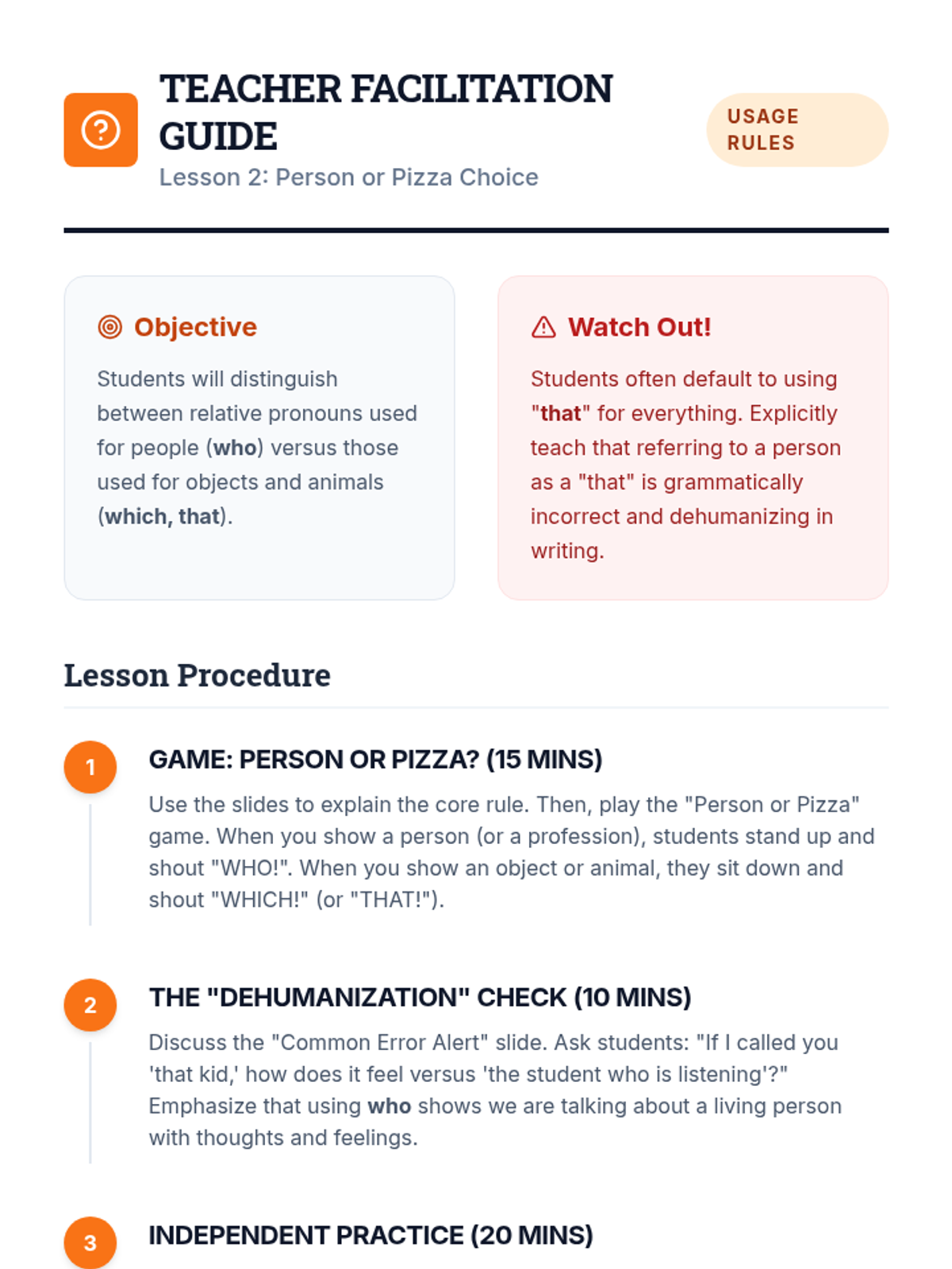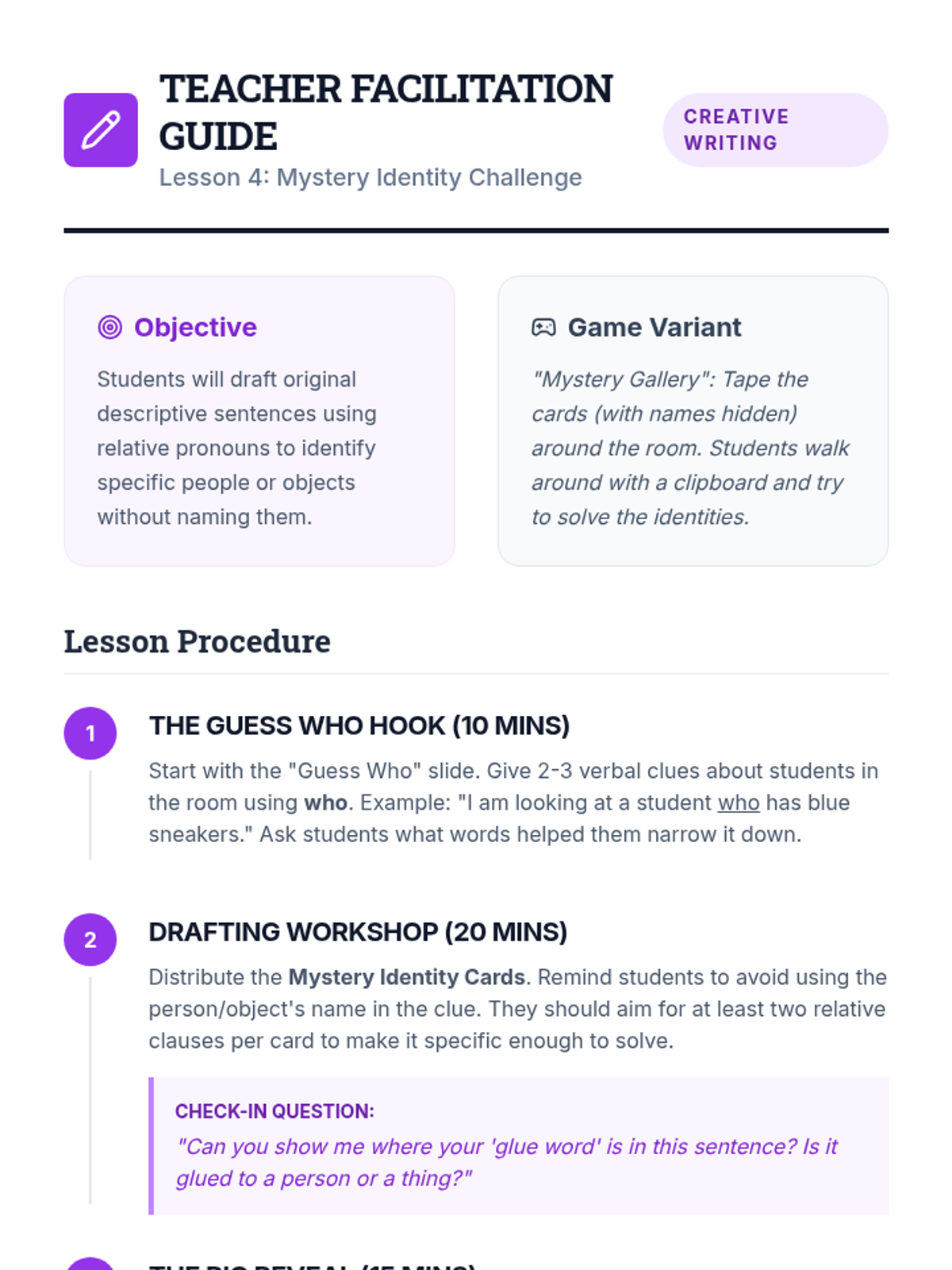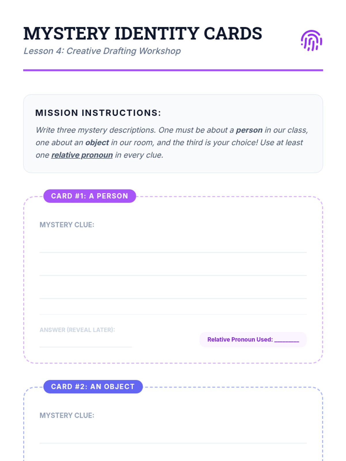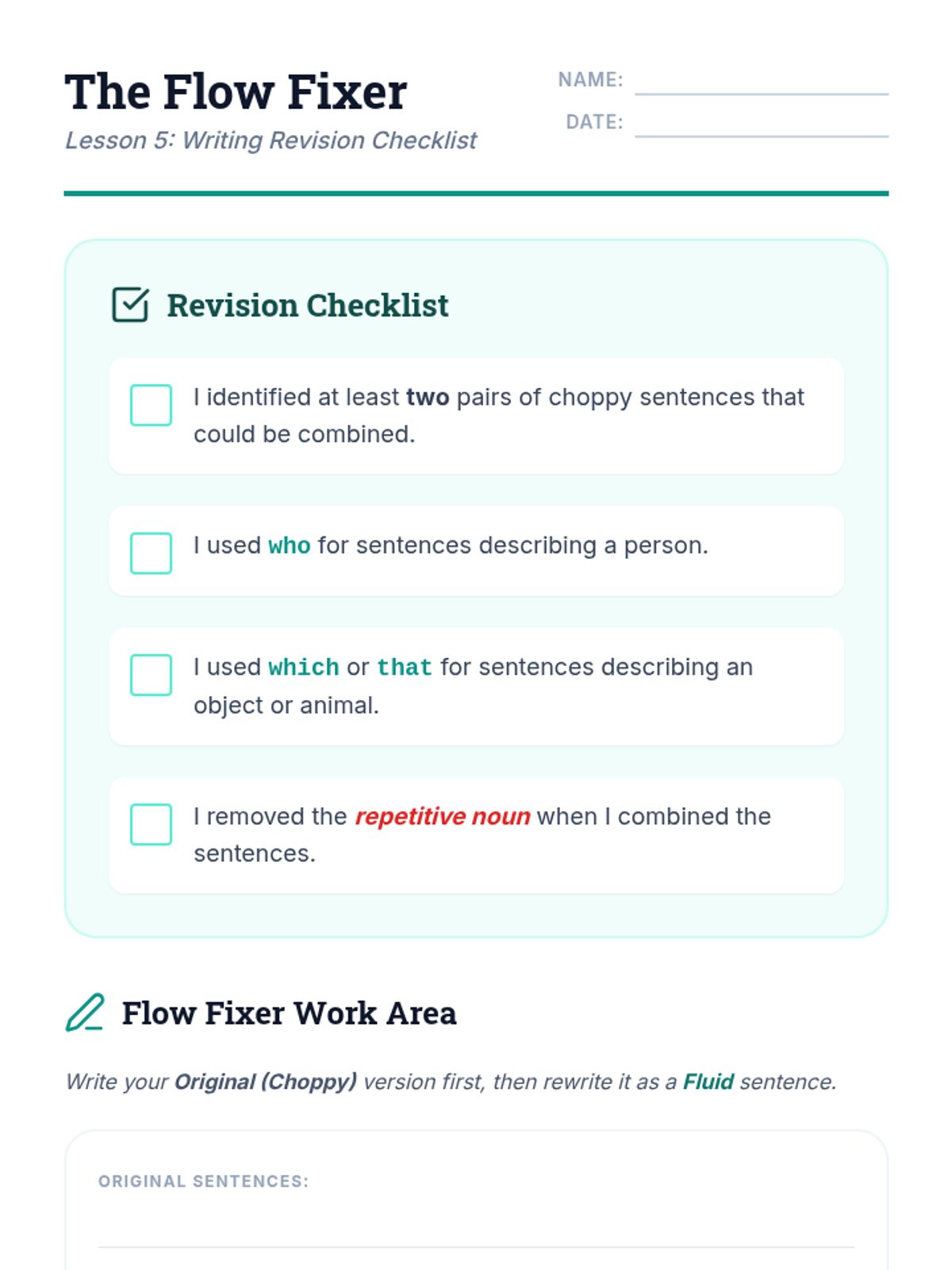 This workshop-style sequence teaches 4th-grade students how to use relative pronouns (who, whose, whom, which, that) to combine choppy sentences into fluid, complex text. Students move from identifying 'glue words' to performing 'sentence surgery,' ultimately revising their own writing for better flow and sophistication.