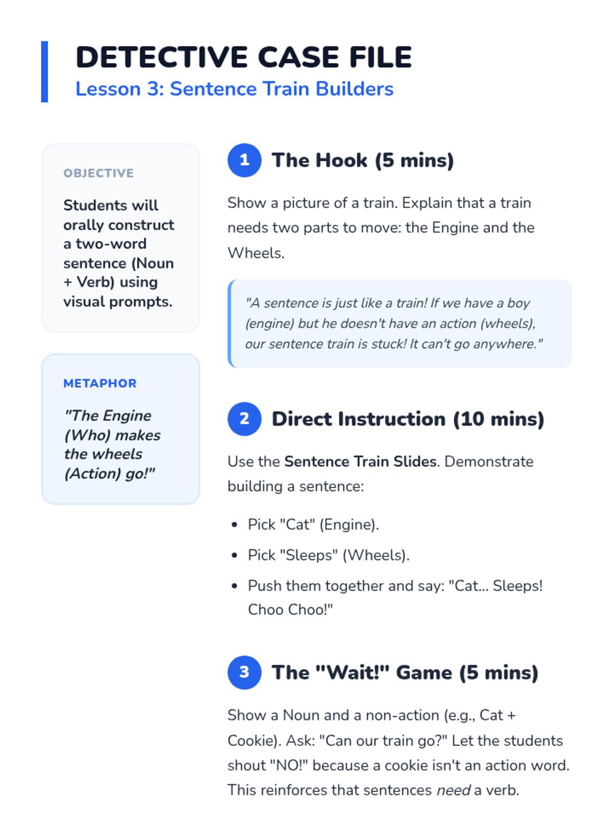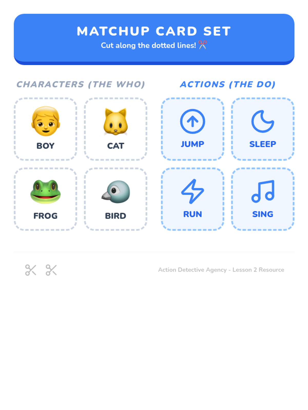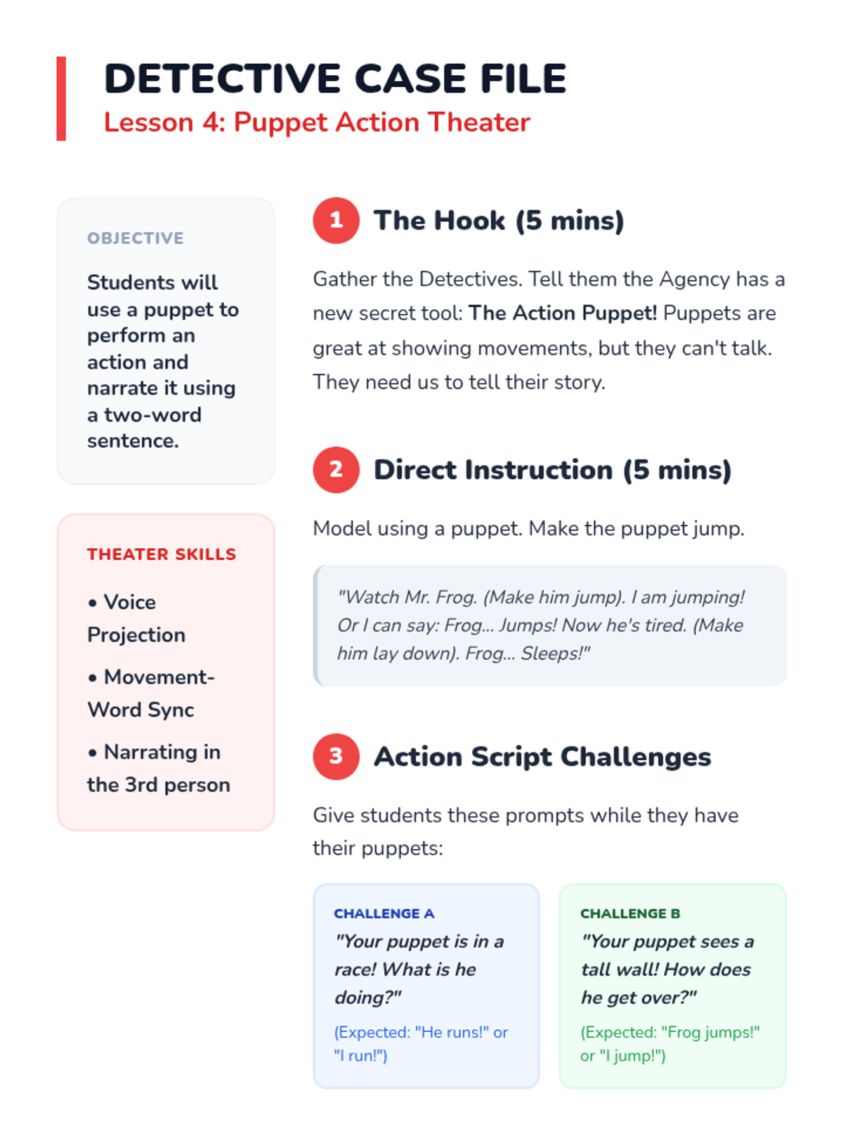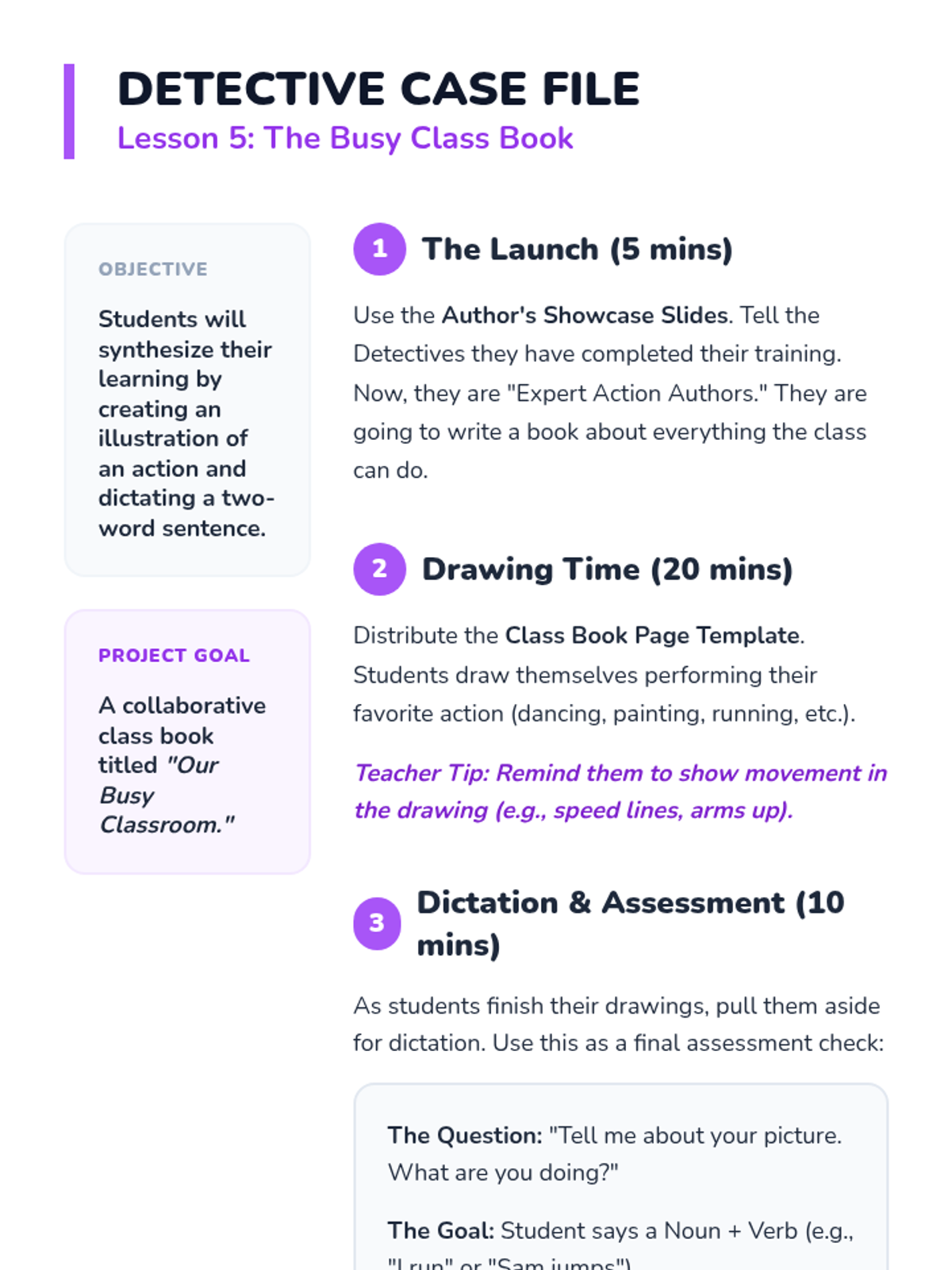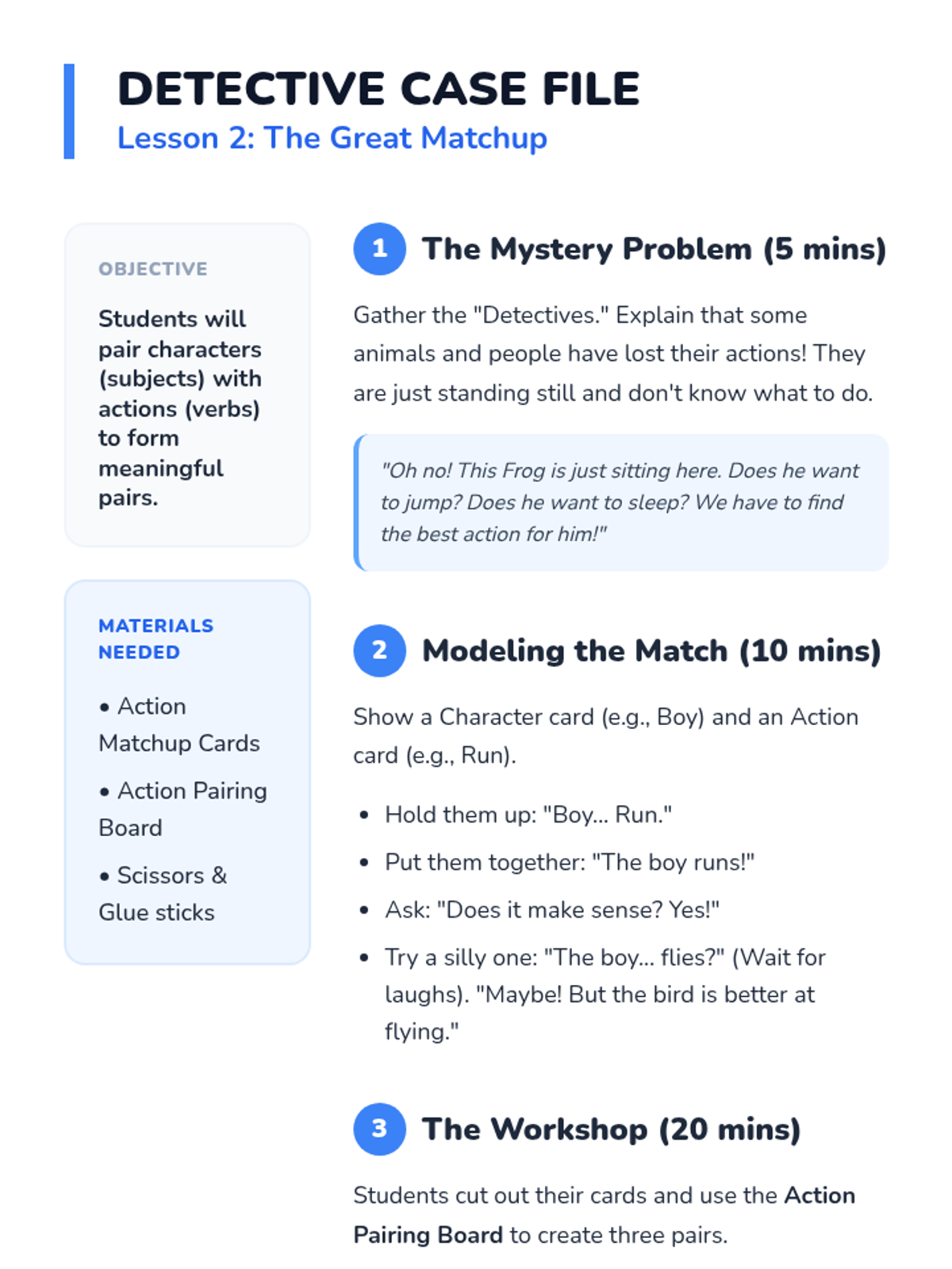 This sequence guides Pre-K students from identifying action words (verbs) in illustrations to constructing simple two-word sentences. Using a 'detective' theme, students explore movement through storytelling, matching games, and creative expression.