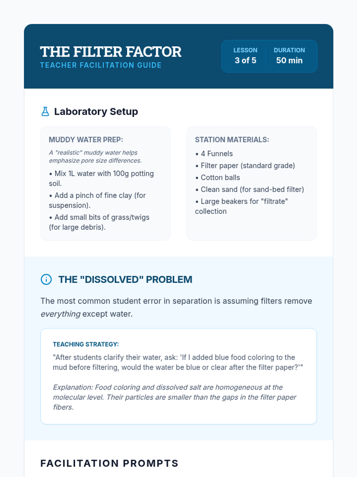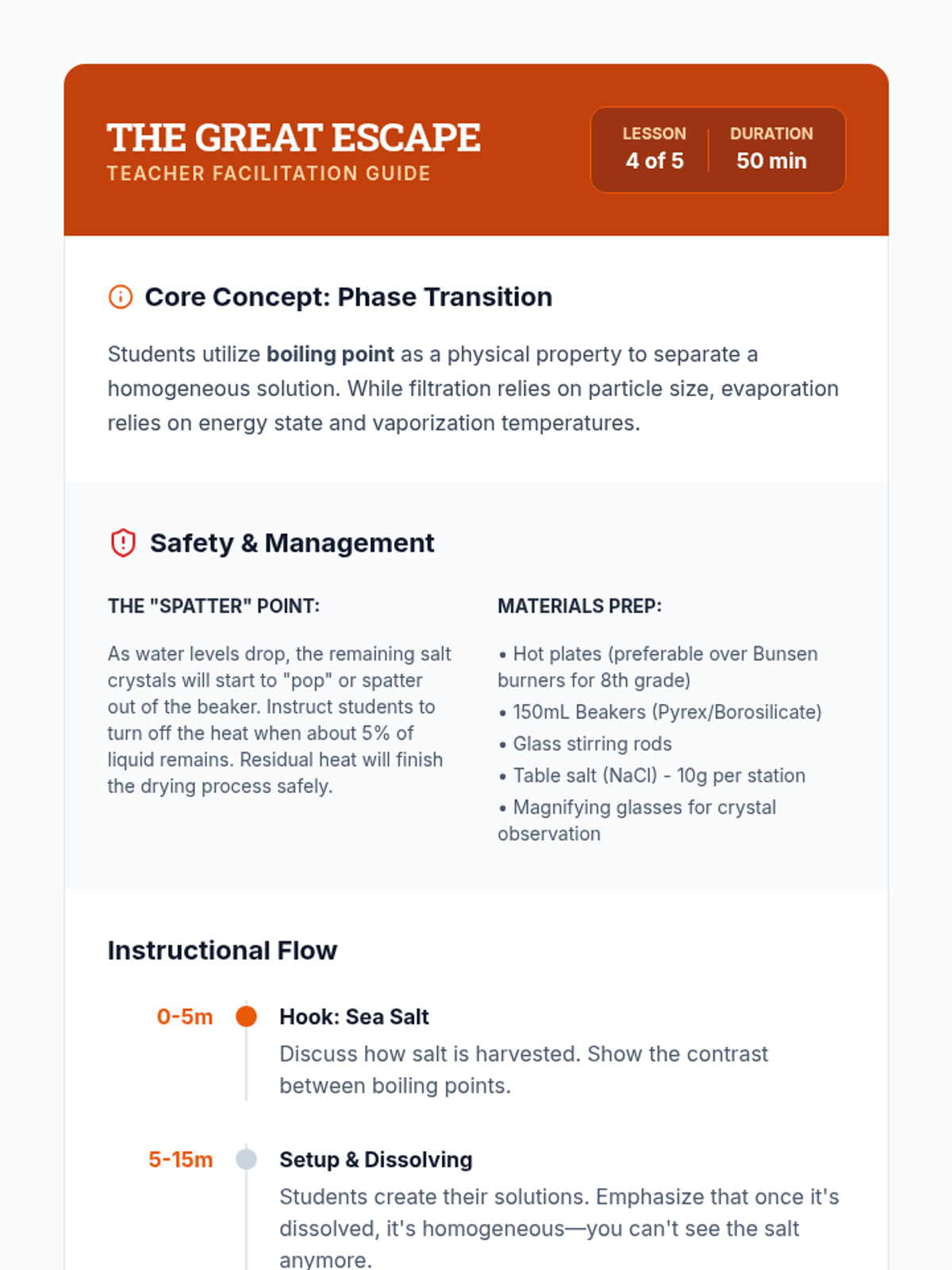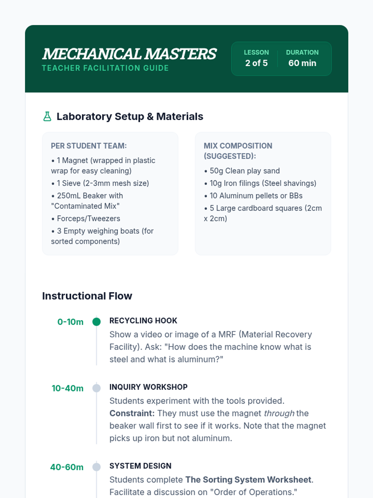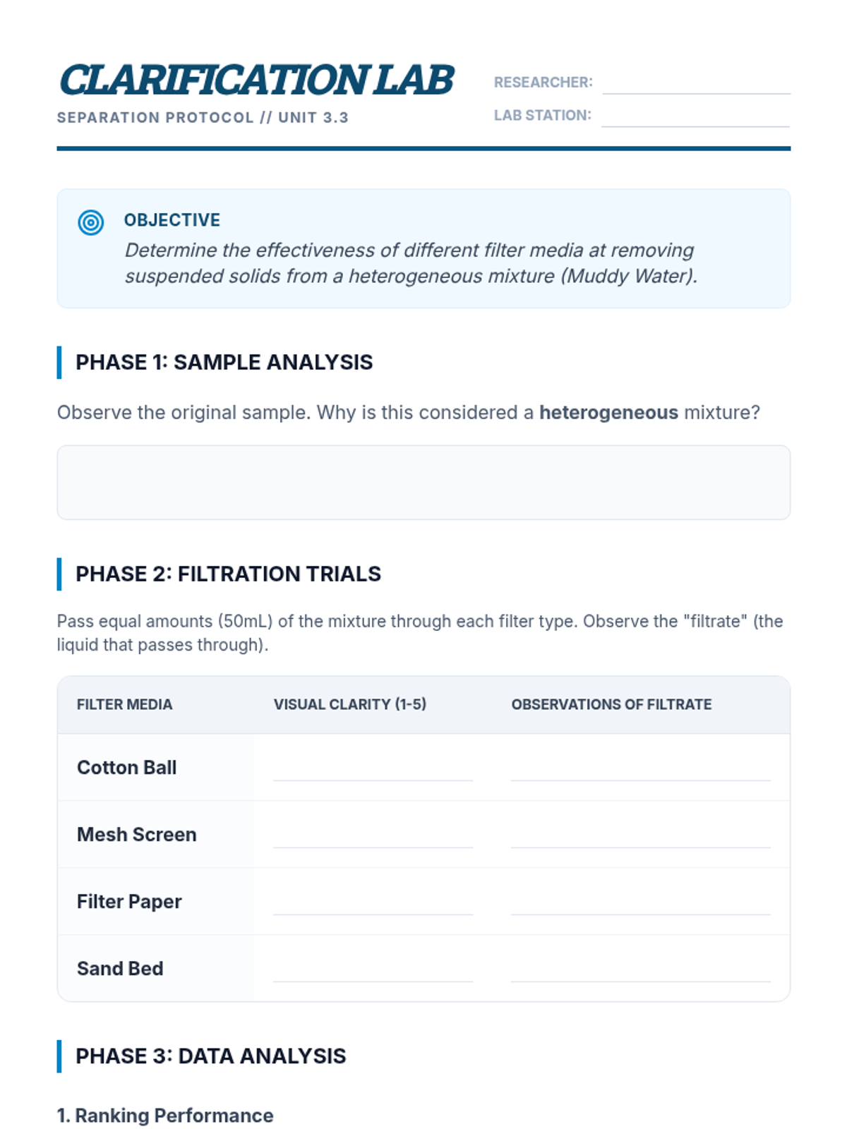 Students investigate the physical properties of matter to design and execute protocols for separating complex mixtures. The sequence moves from theoretical classification of matter to practical laboratory techniques, culminating in a performance task where students isolate components from a four-part mixture.