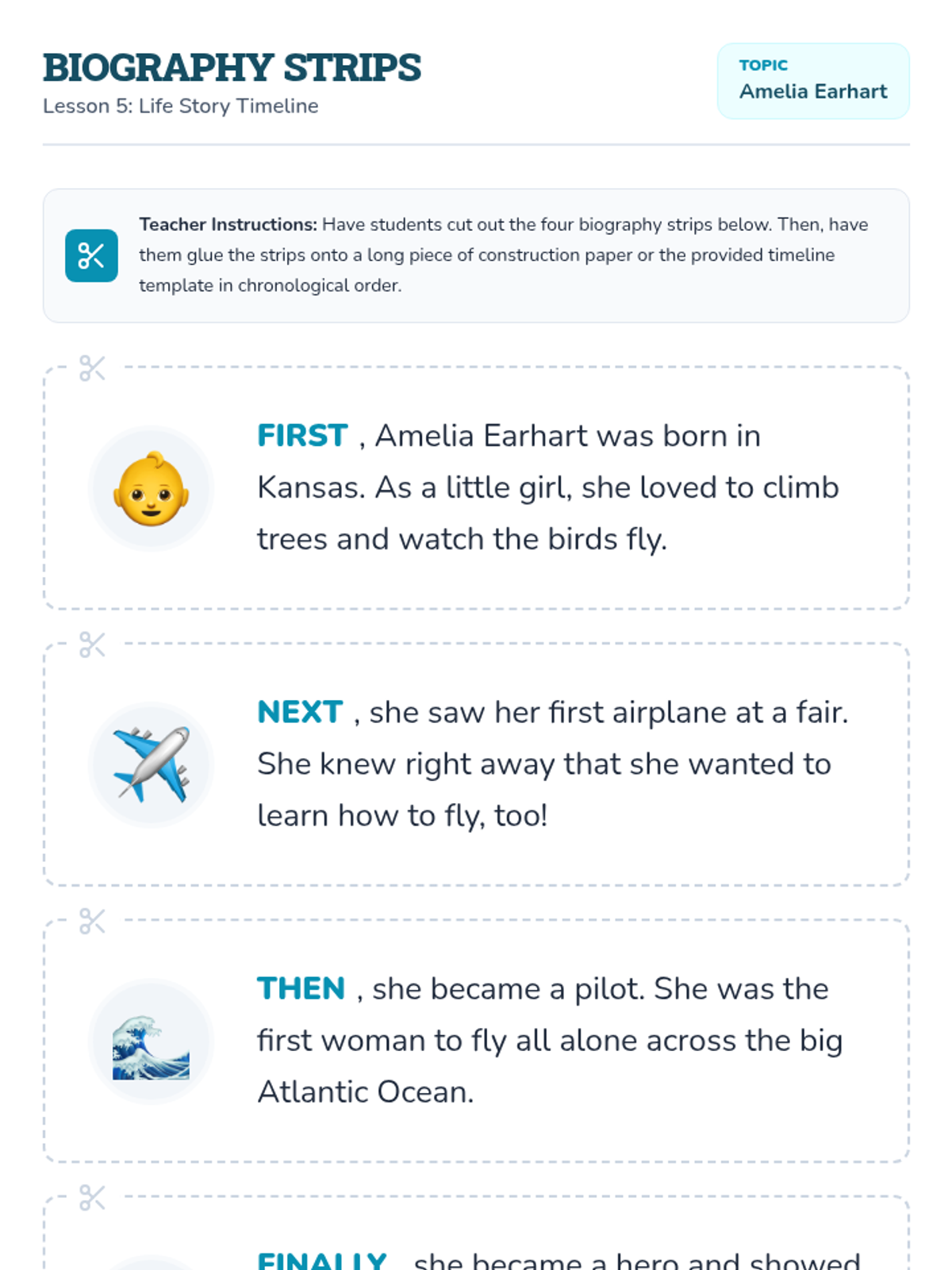 A 1st Grade sequence exploring chronology and sequencing in historical biographies. Students learn to distinguish past from present, identify signal words like 'first' and 'next', and construct timelines of famous lives.