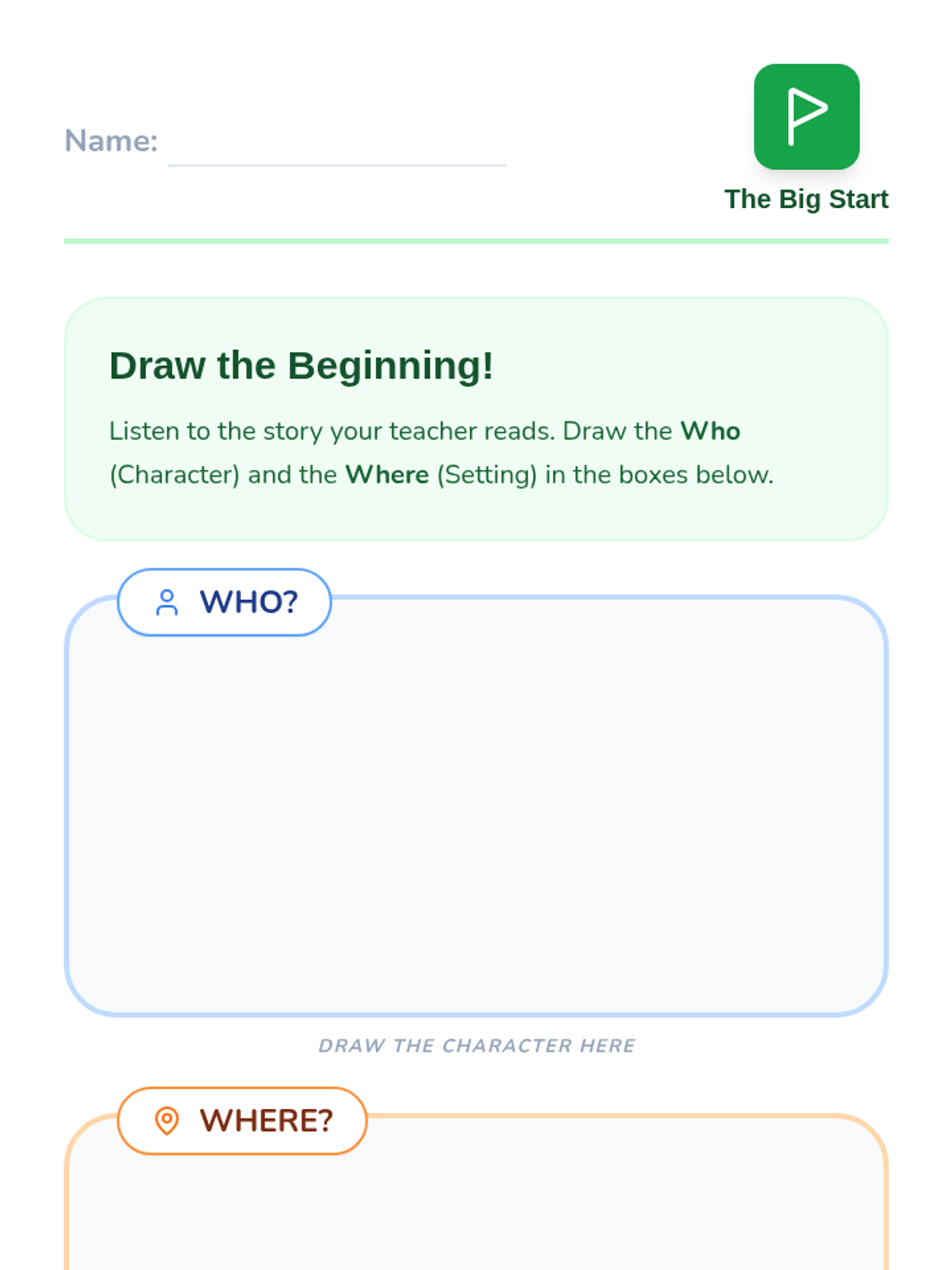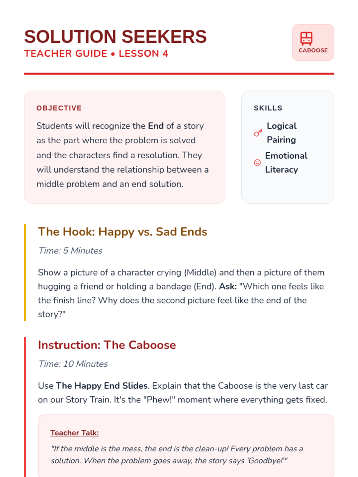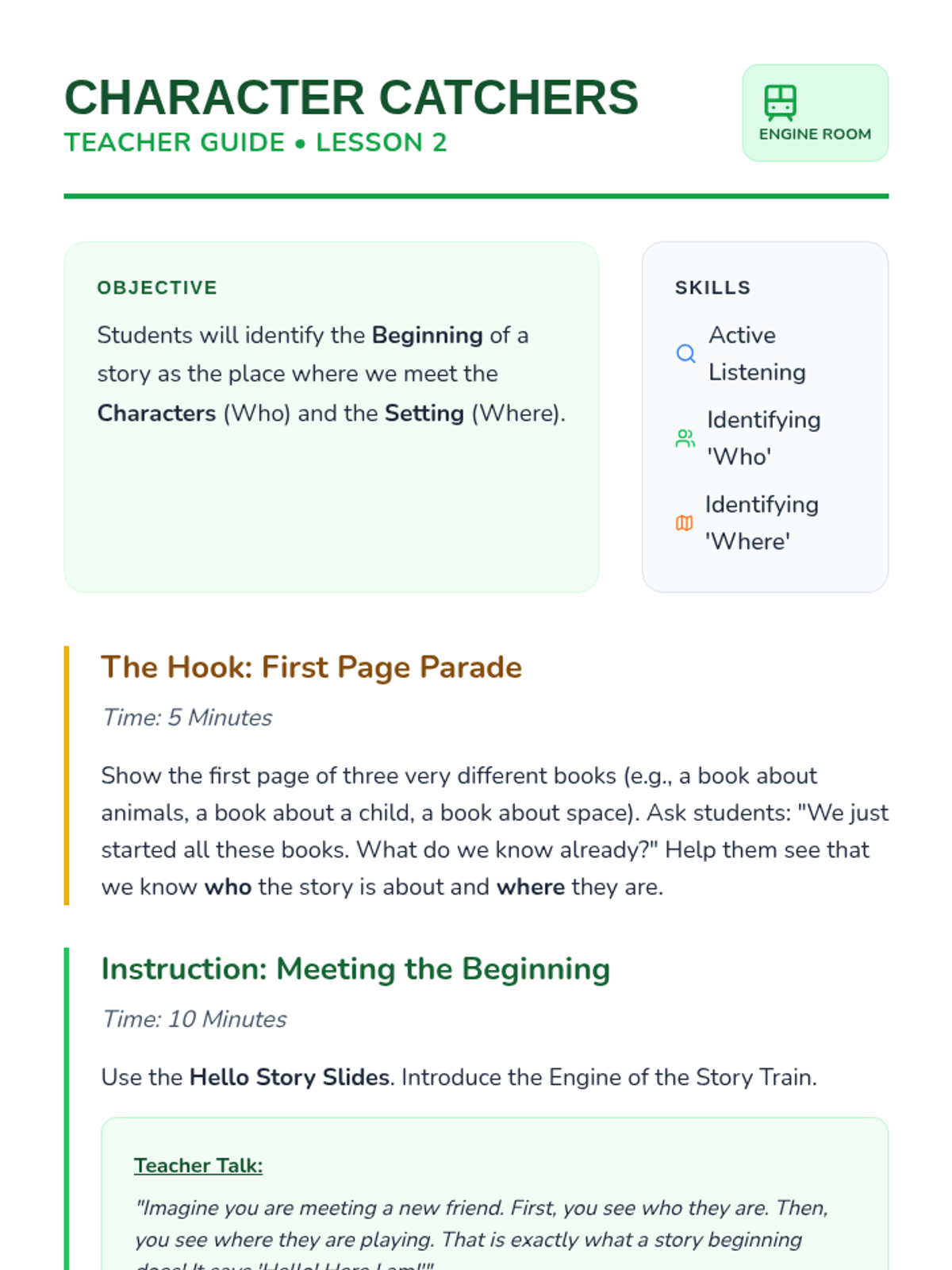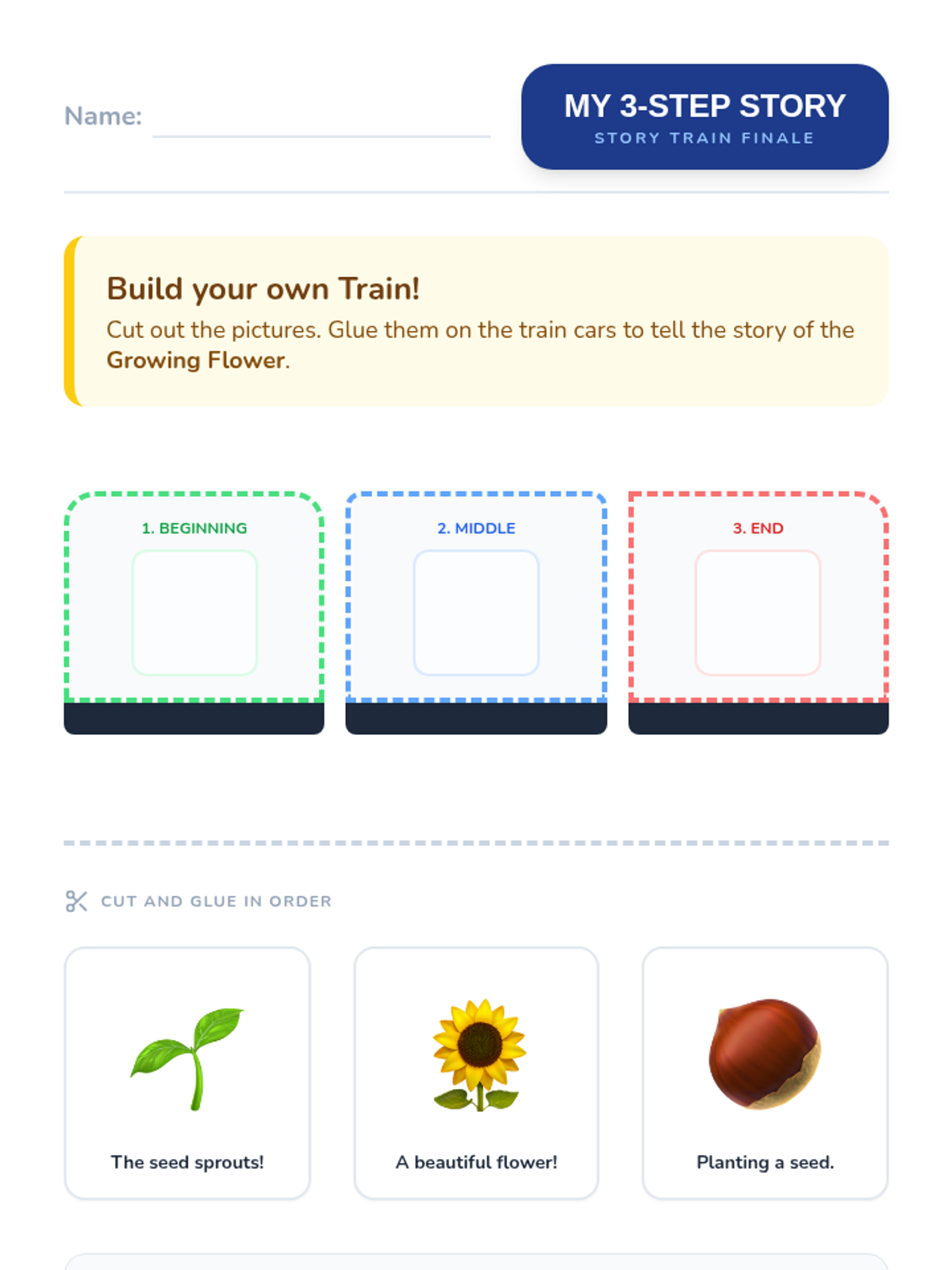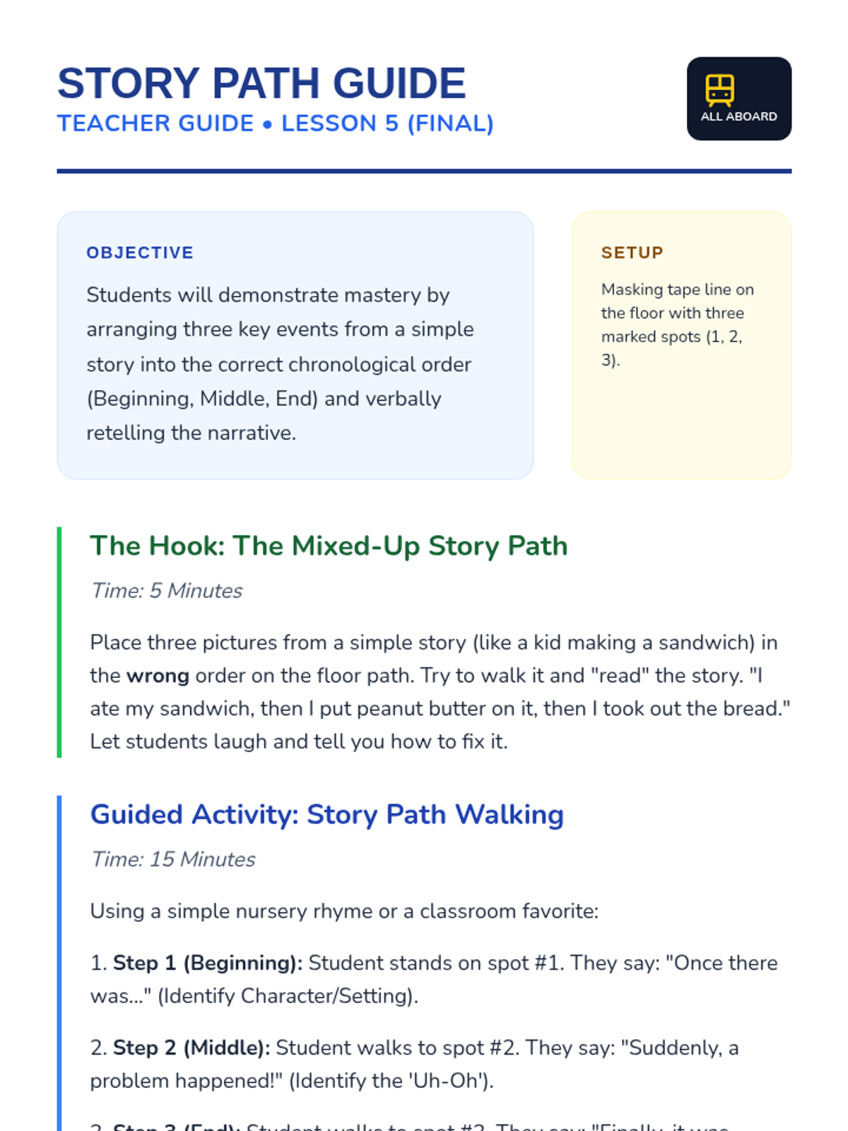 A Pre-K sequence introducing narrative structure (beginning, middle, end) through daily routines, familiar stories, and interactive sorting activities. students learn to identify key story parts and arrange events in chronological order.