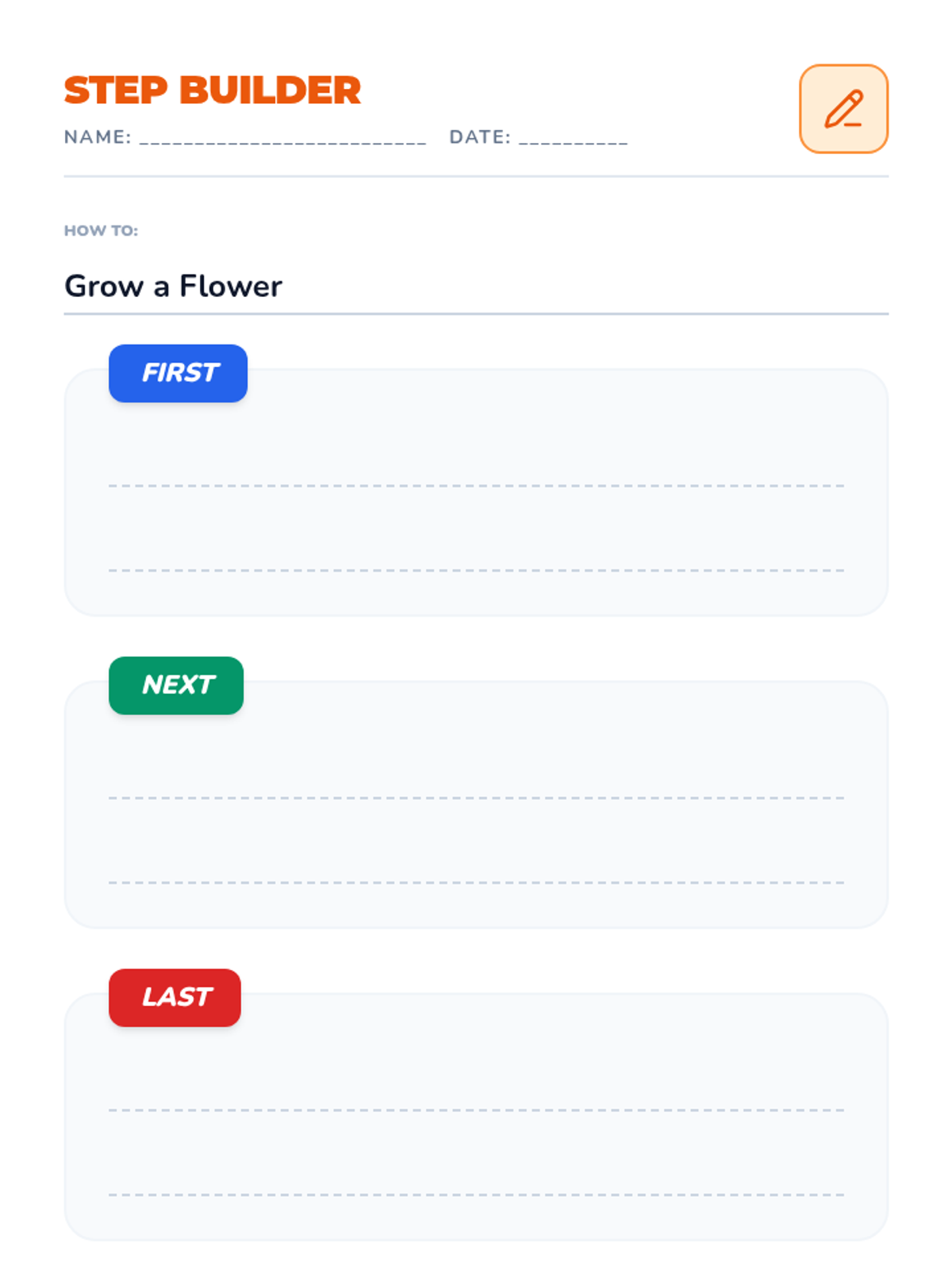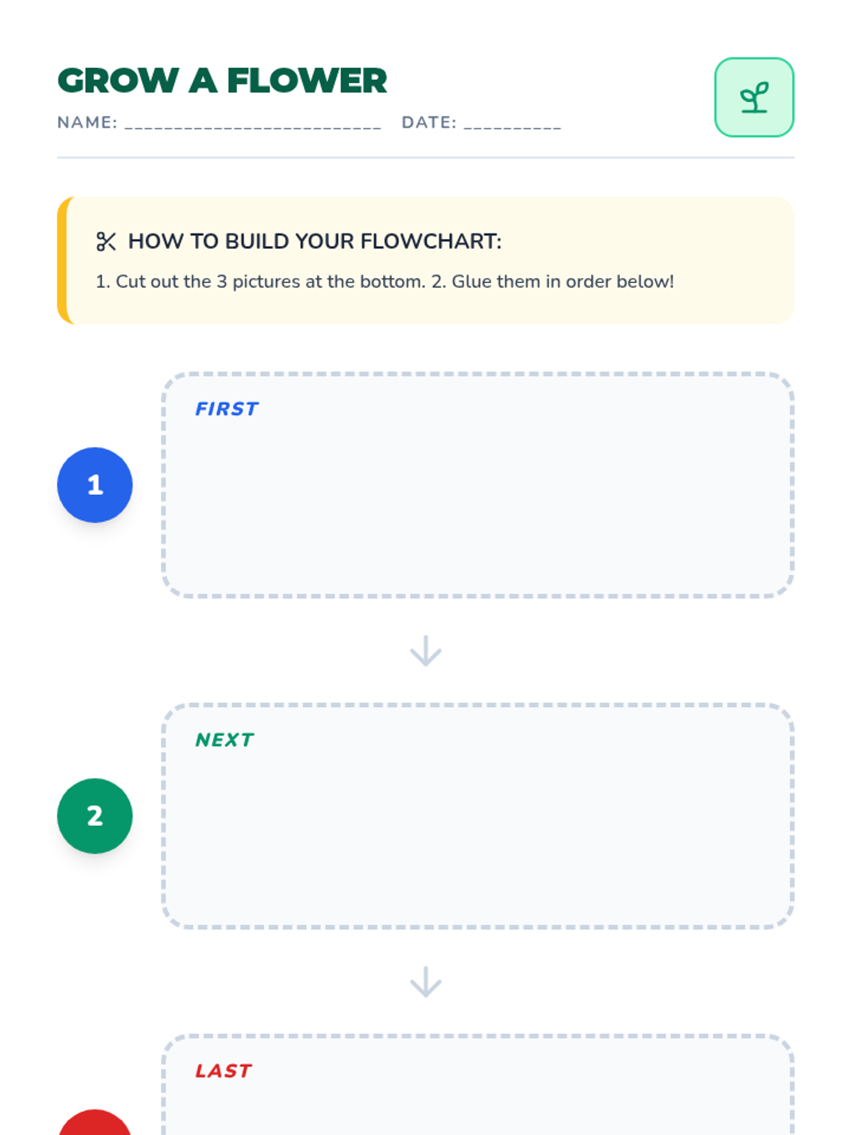 This sequence introduces 1st Grade students to procedural writing using flowcharts. It focuses on breaking down tasks into three distinct steps (First, Next, Last) through physical movement, visual organizers, action verbs, and scaffolded sentence writing.