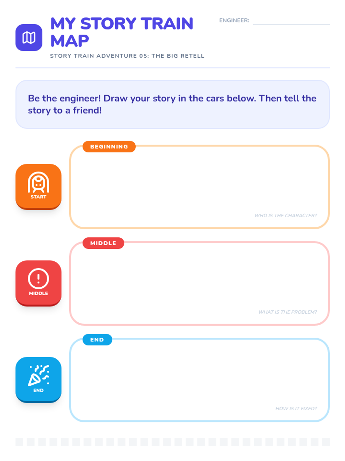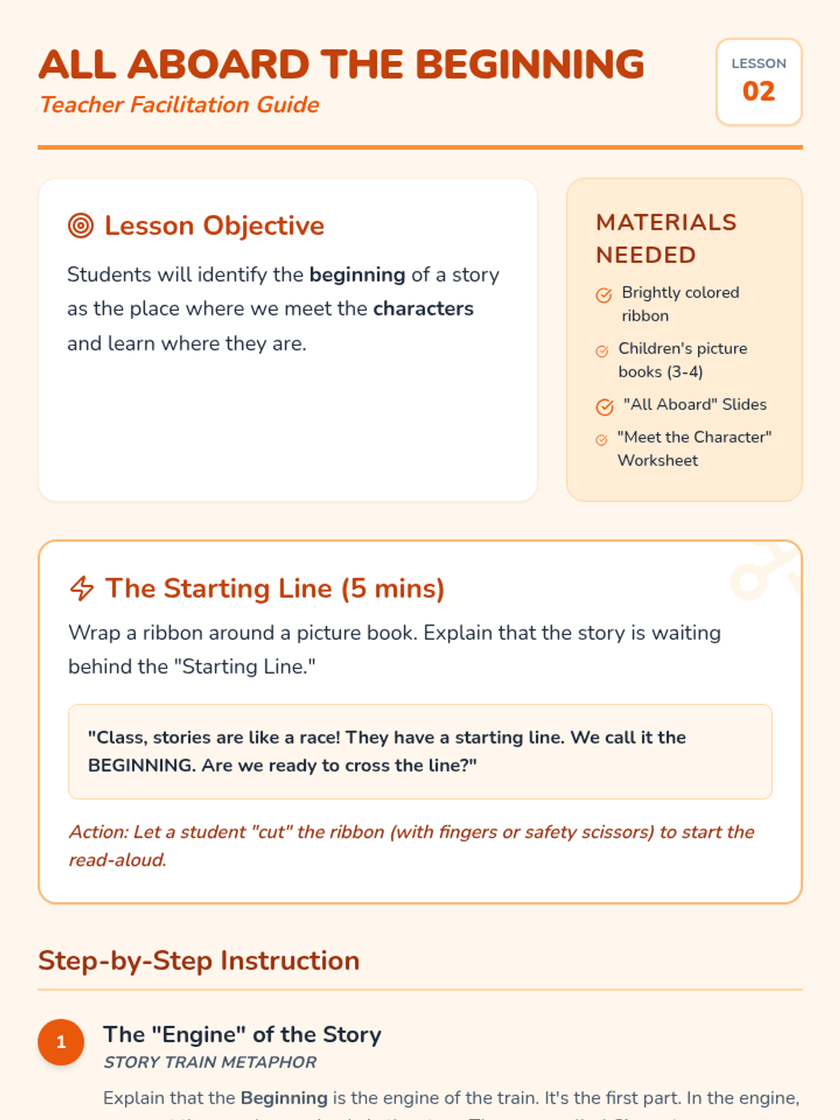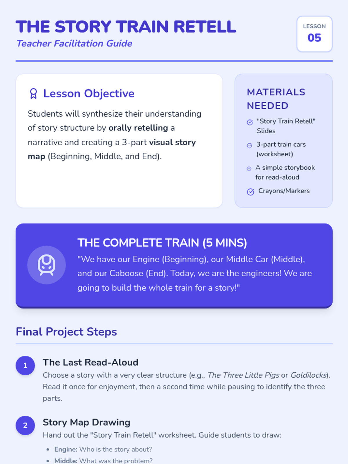 A foundational Pre-K sequence focused on understanding the chronological order of stories (Beginning, Middle, and End) through familiar routines, character introductions, problem-solving, and visual retelling projects.