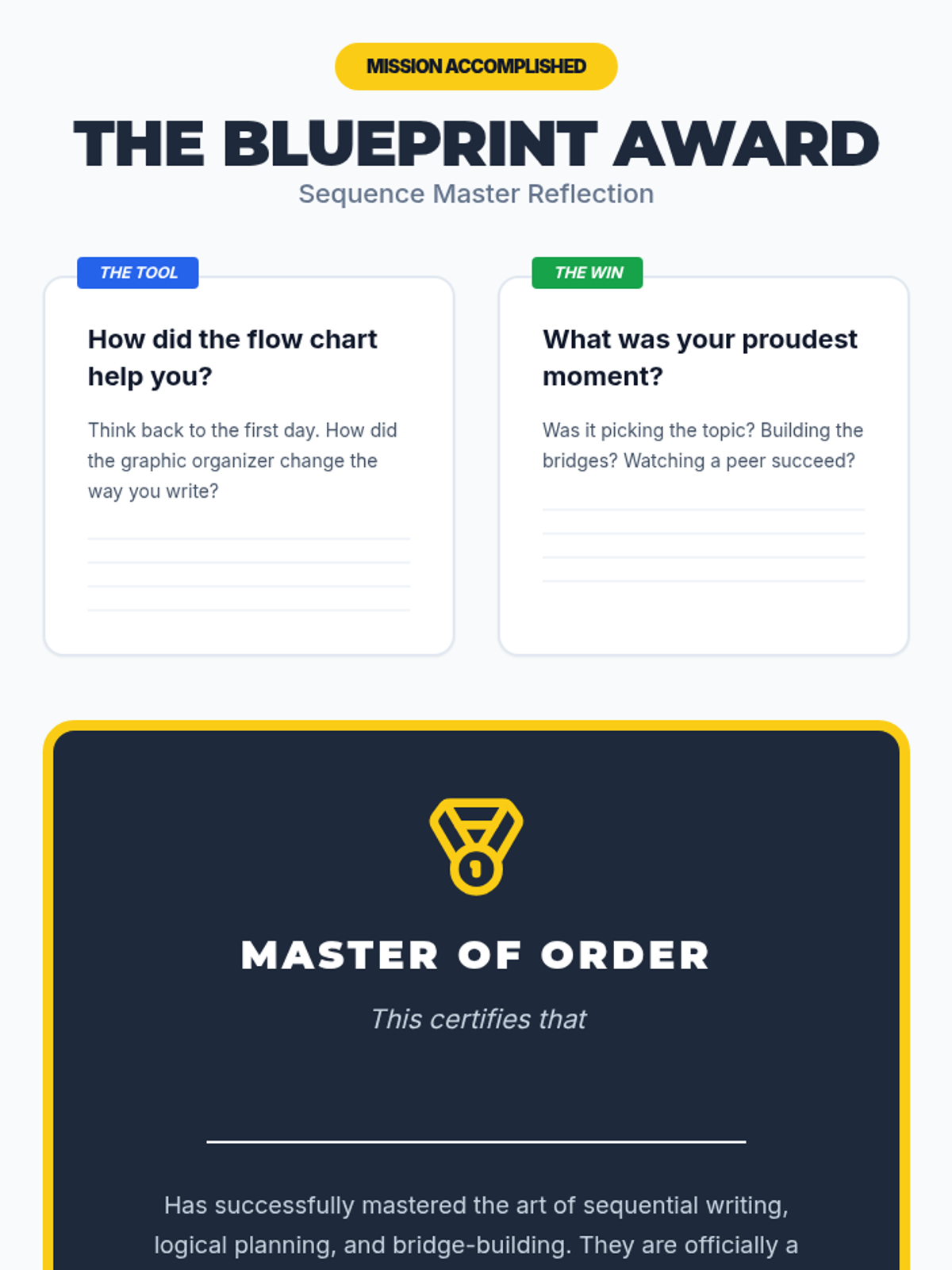 A 5-lesson sequence designed to help 4th-grade students, particularly those with executive function challenges, master sequential writing through the use of flow charts and structured graphic organizers. Students transition from understanding the necessity of order to drafting and testing their own 'How-To' procedural texts.