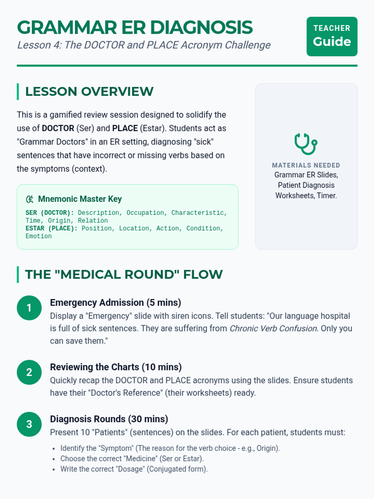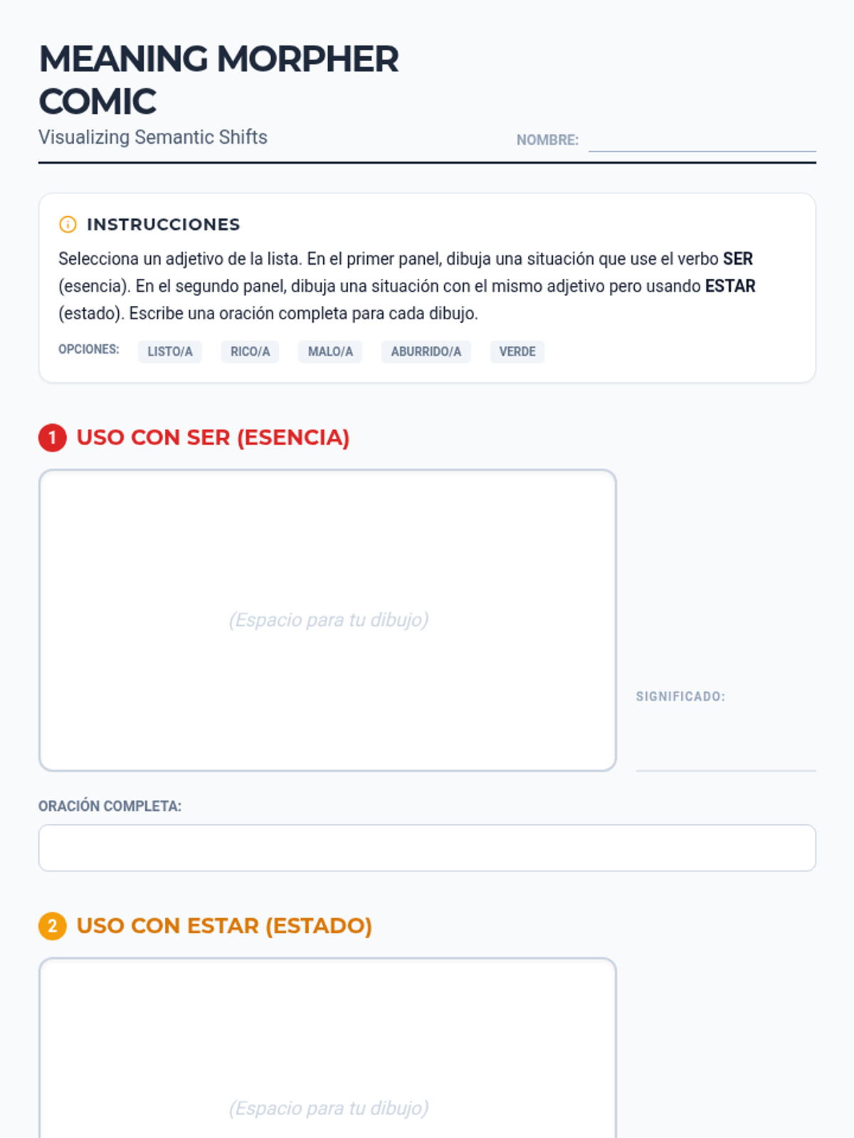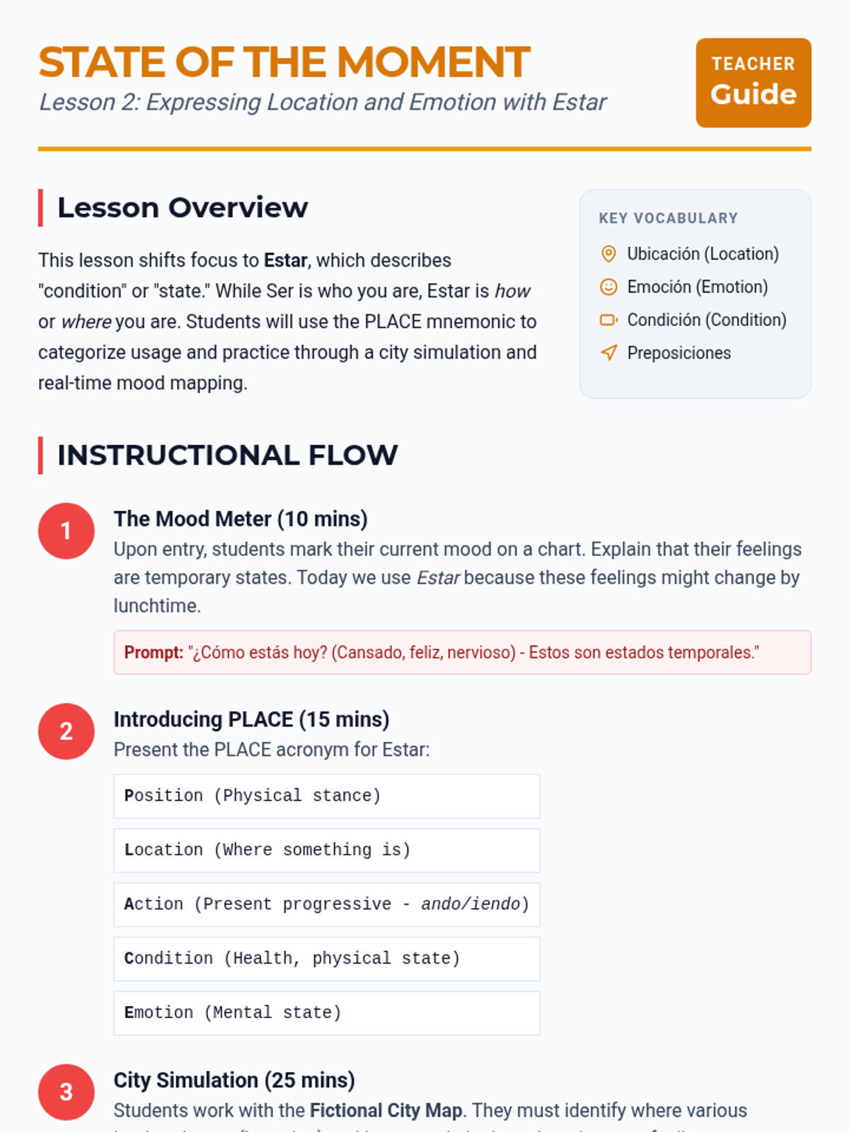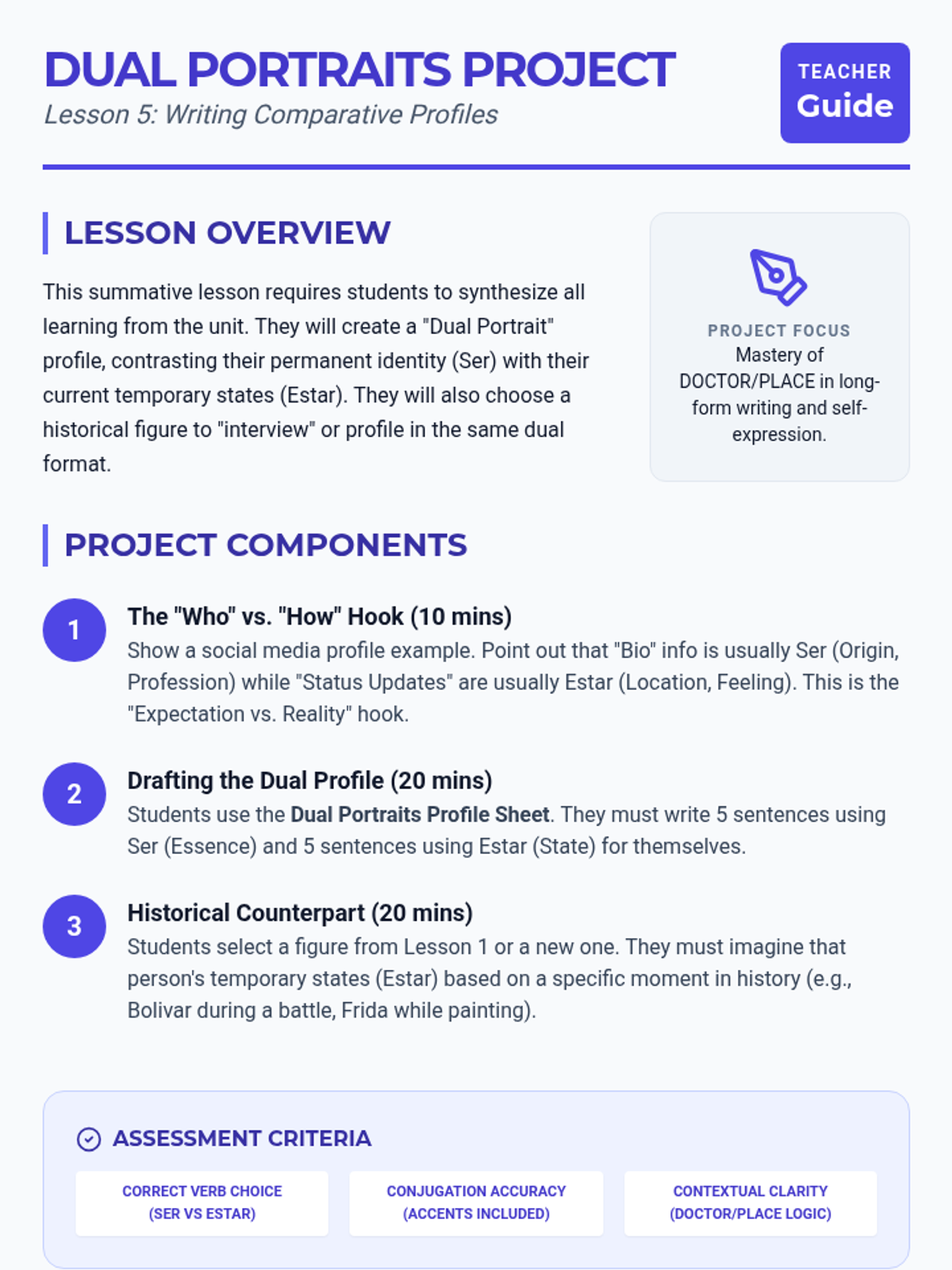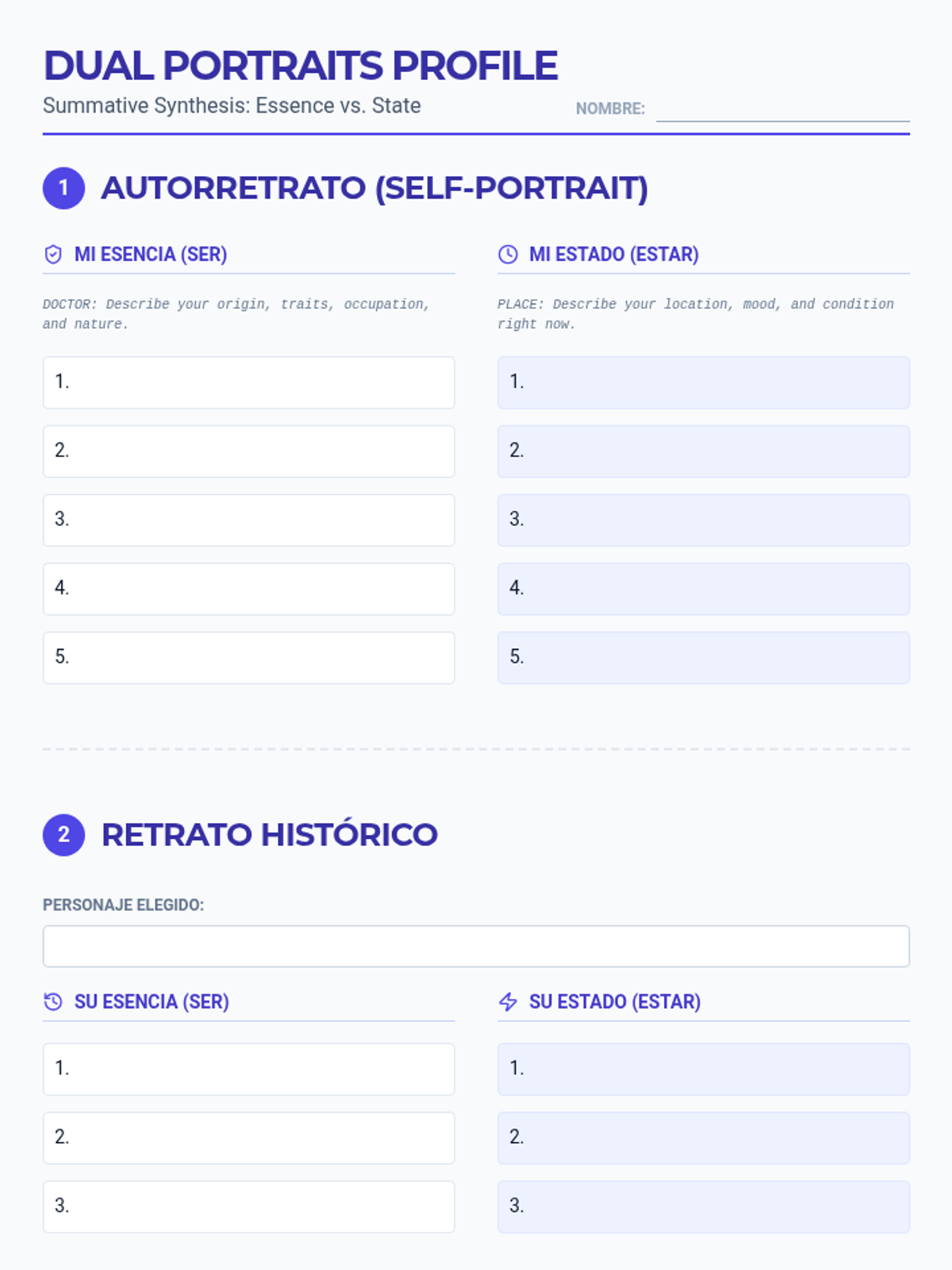 A comprehensive 11th-grade Spanish unit exploring the nuances between 'Ser' and 'Estar'. Students move from foundational usage to complex semantic shifts, culminating in a comparative writing project.