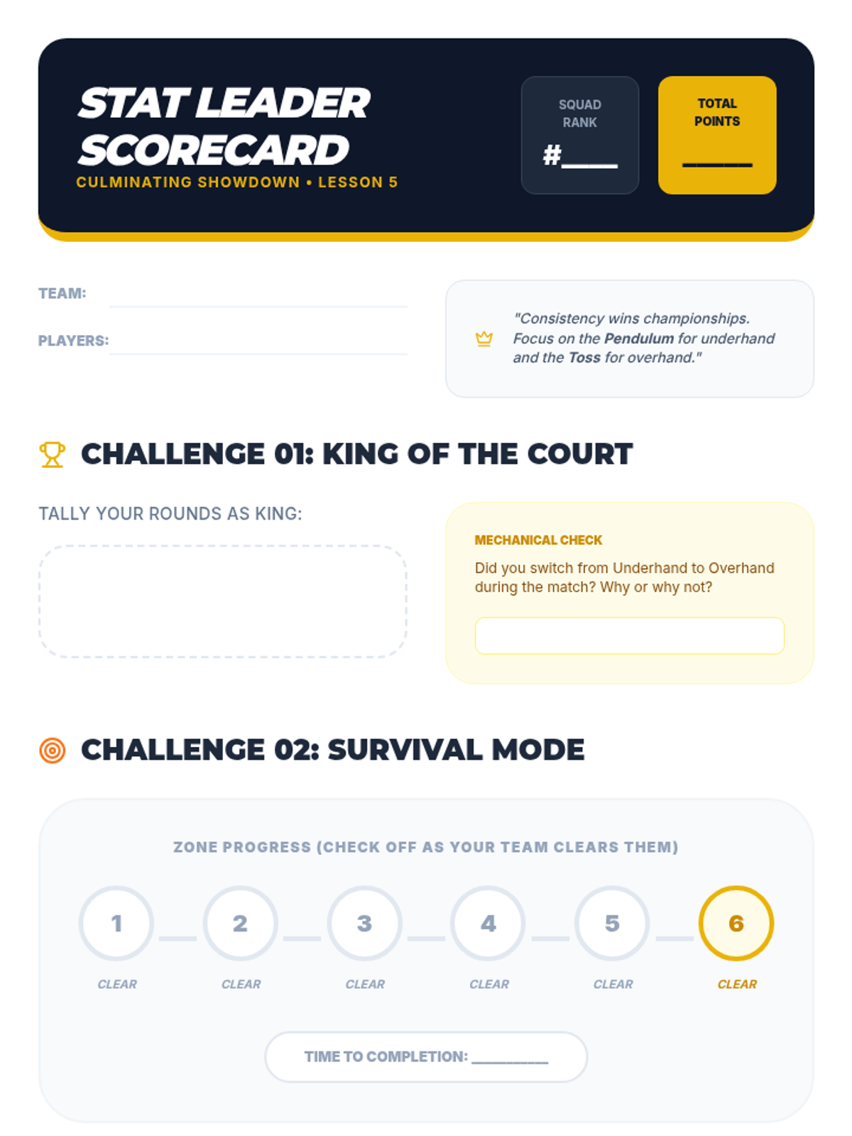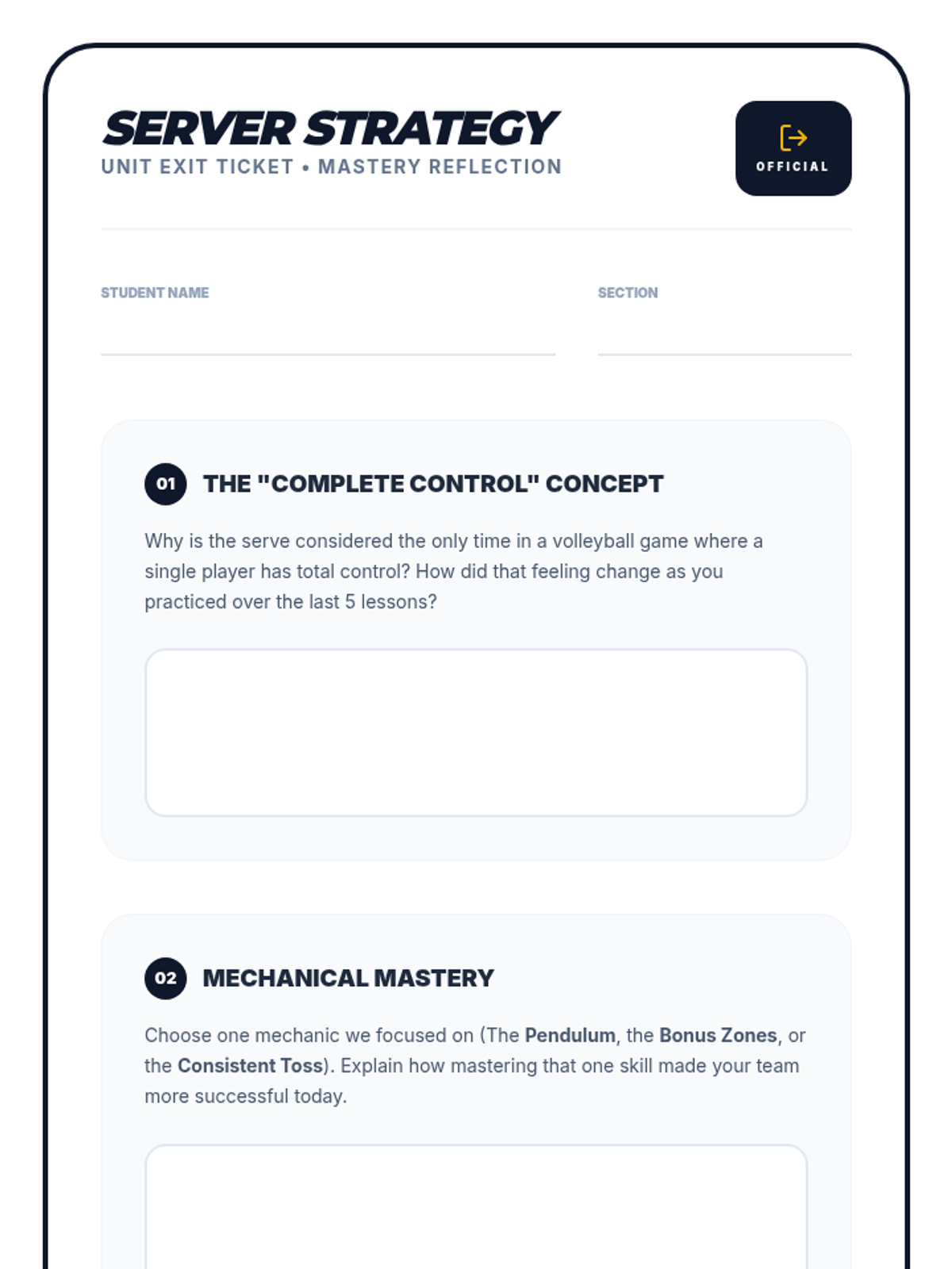 A 5-lesson unit for 6th graders focusing on the mechanics of volleyball serving, court positioning, and strategic placement using a workshop approach.