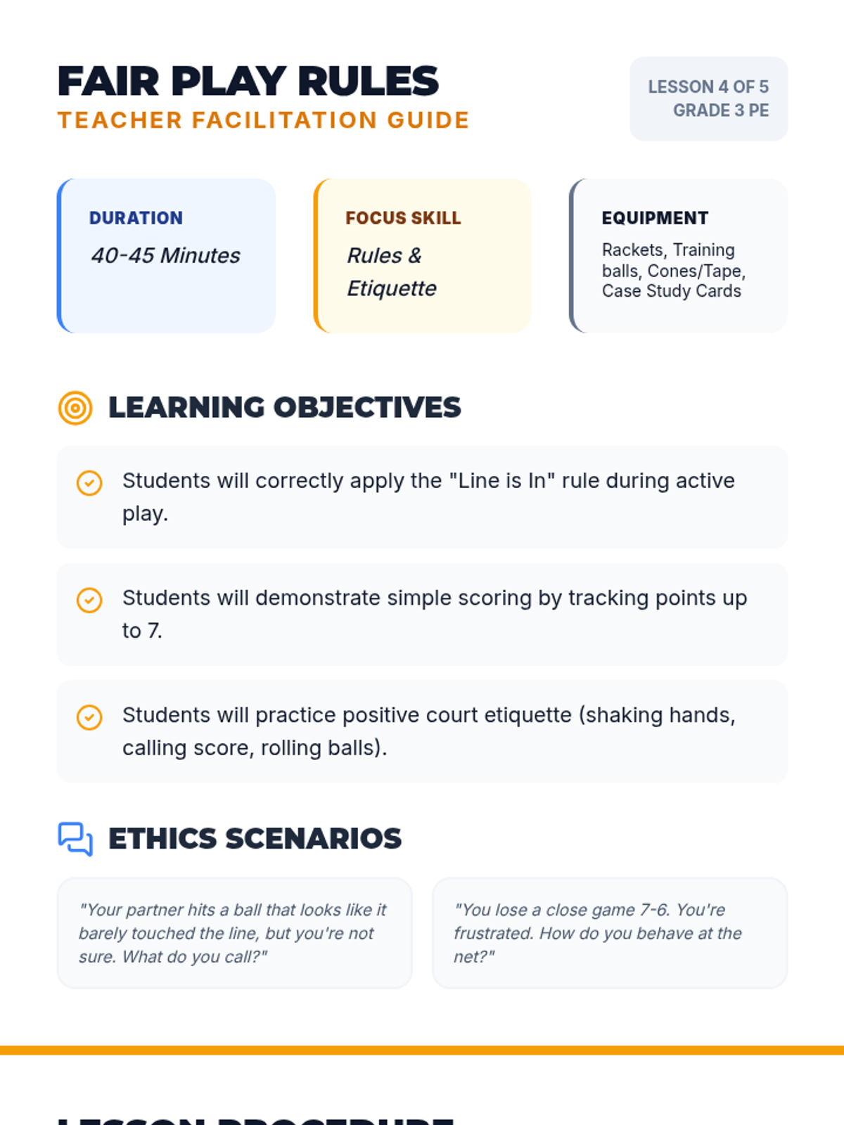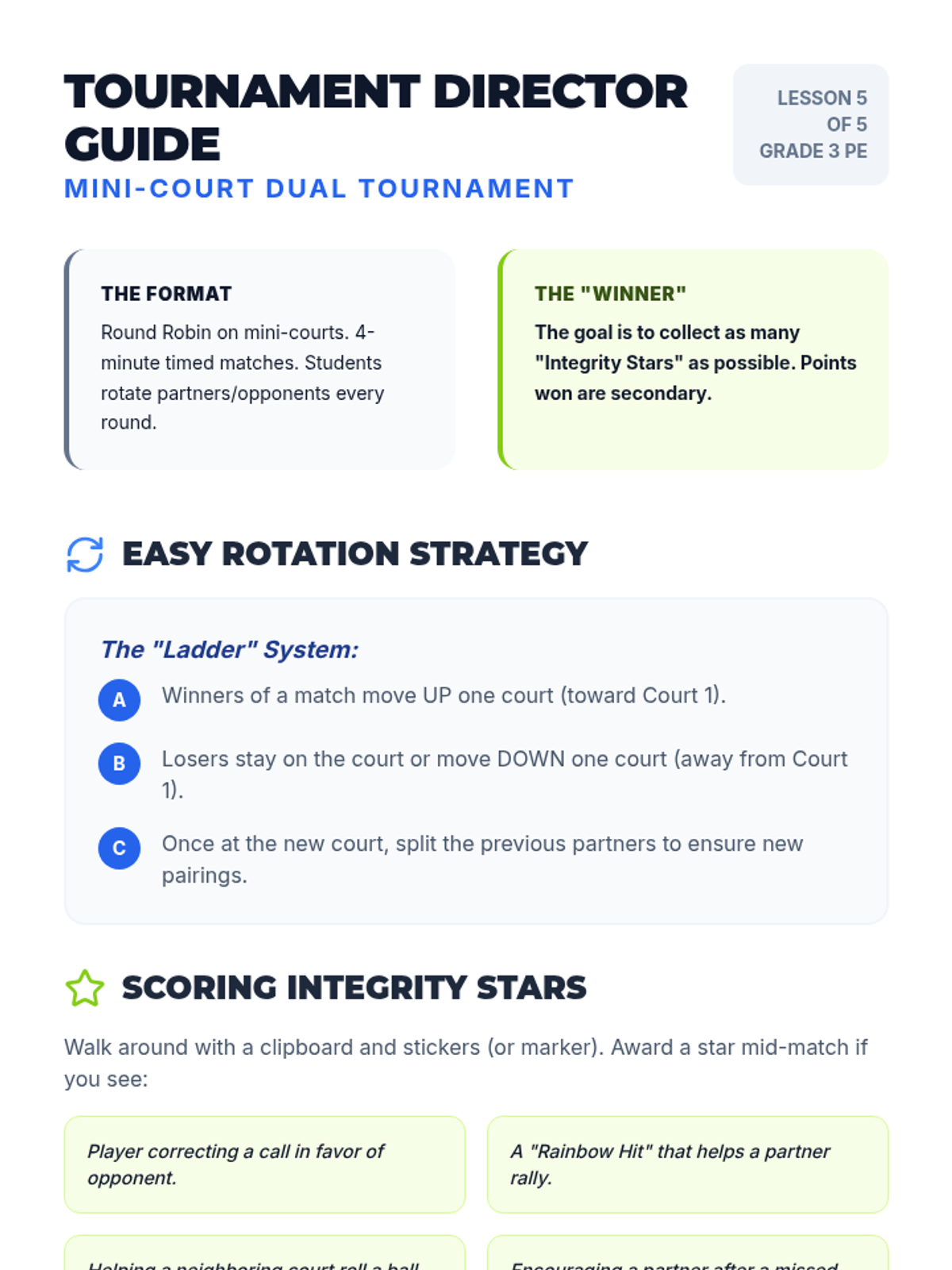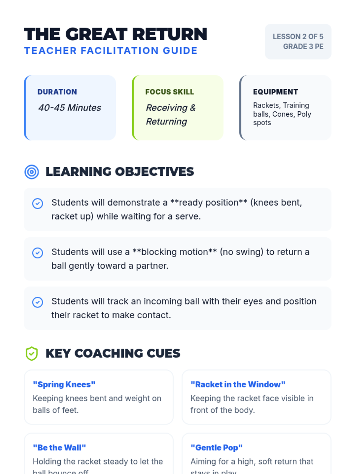 A comprehensive 3rd-grade PE unit focusing on the underhand serve, receiving skills, and cooperative rallying. Students progress from individual mechanics to sustained dual play with an emphasis on sportsmanship and consistency.