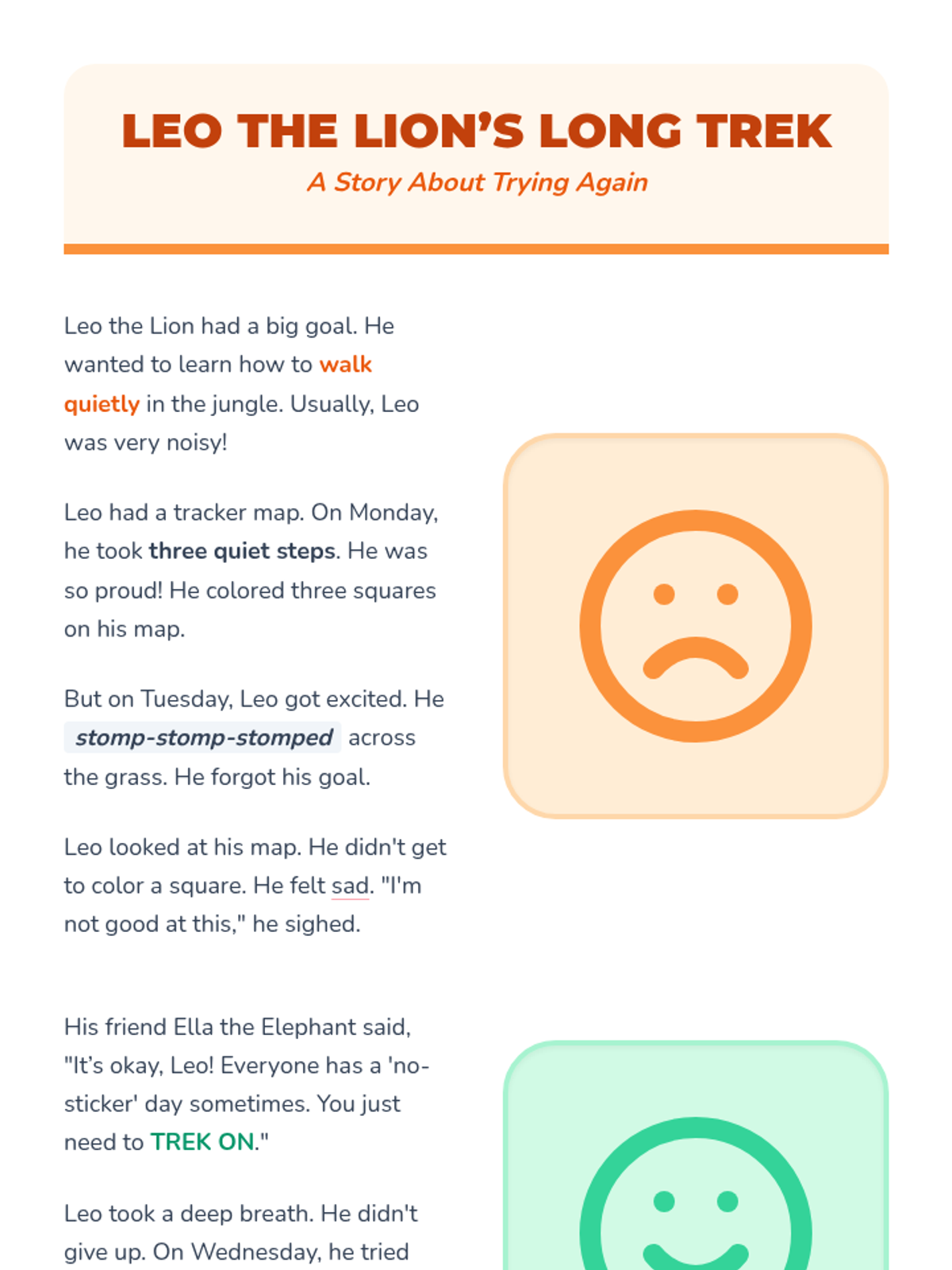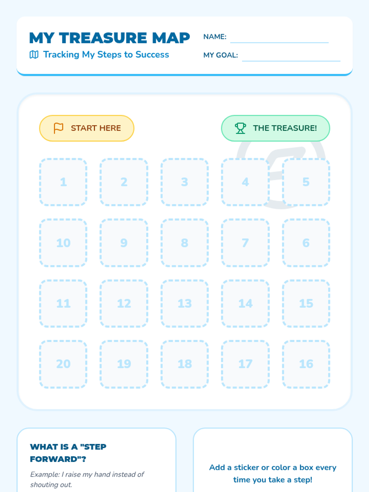 A sequence for 1st graders focused on goal-setting and self-tracking. Students learn to choose a behavior goal, design a visual progress tracker, and develop resilience when facing setbacks.