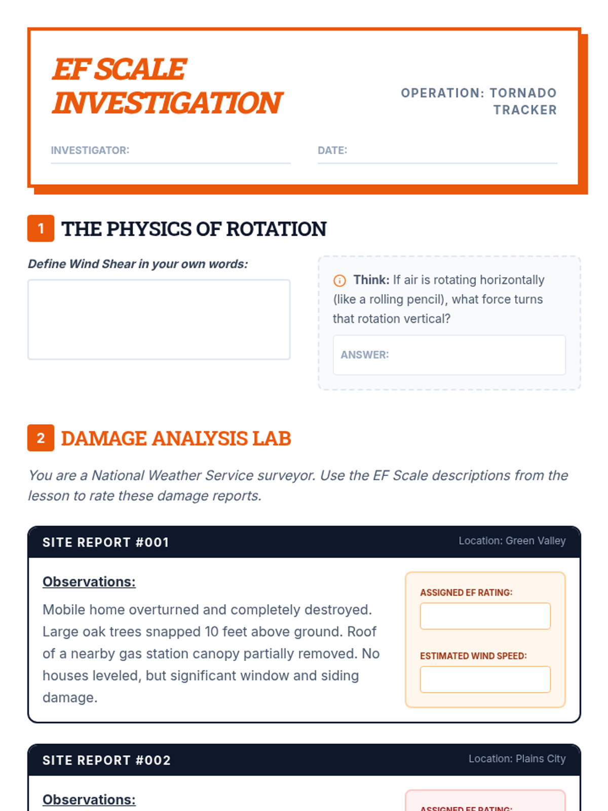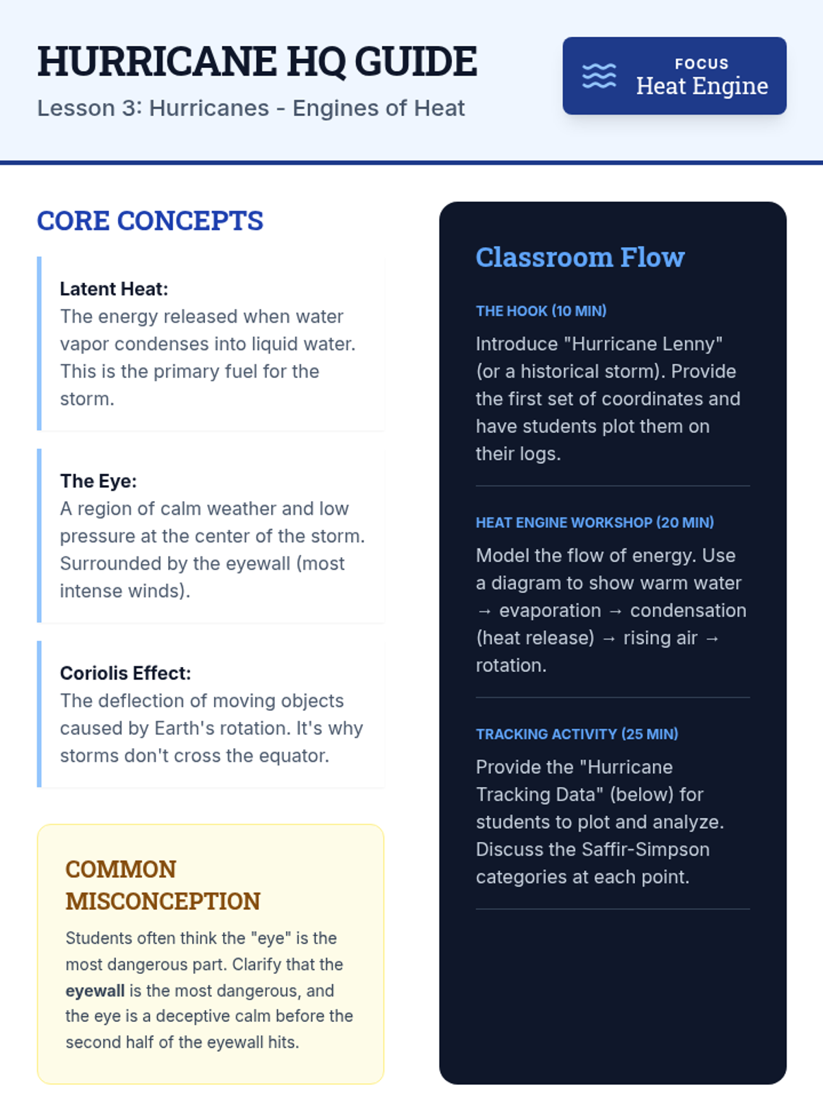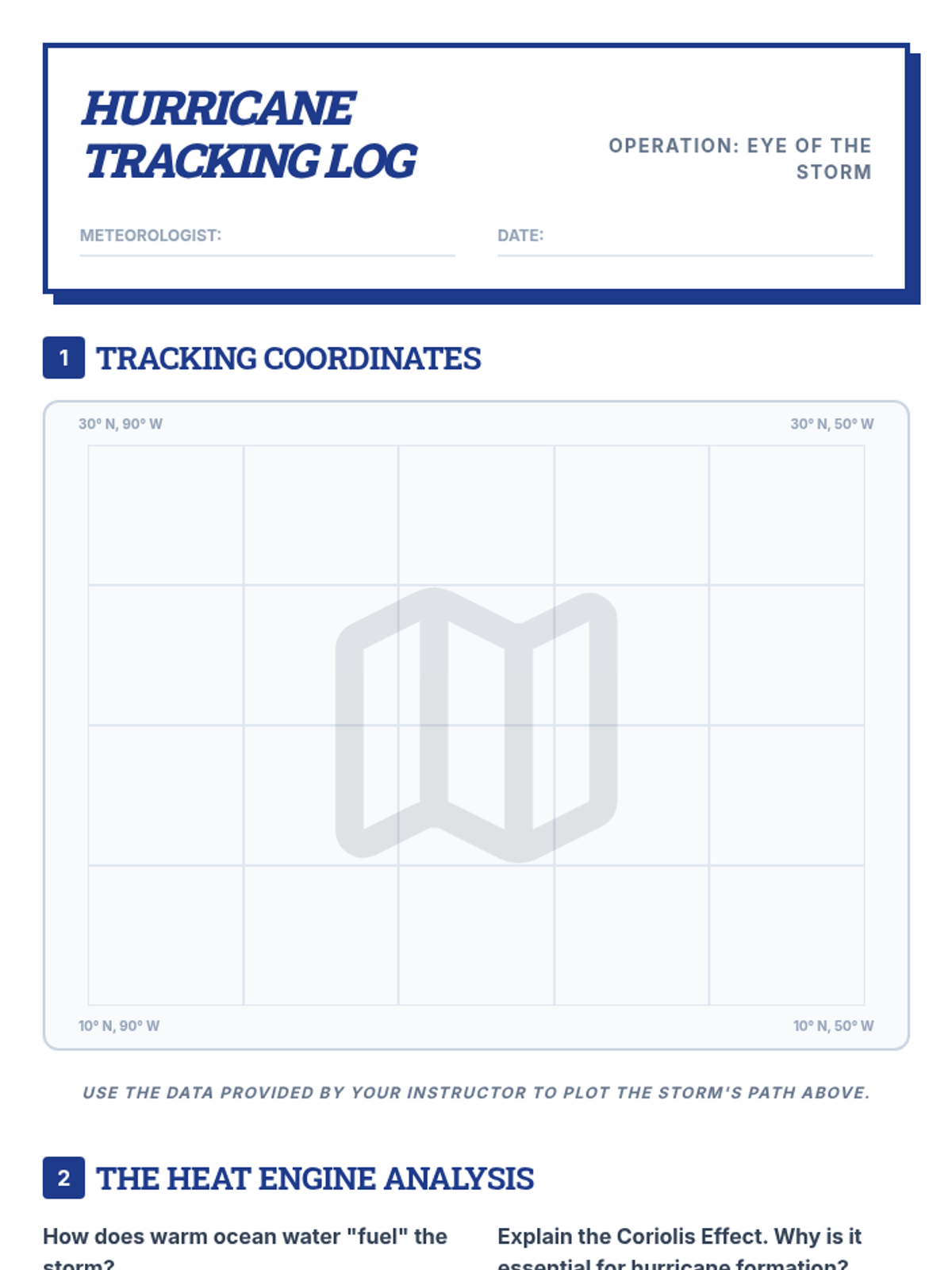 This middle school Earth Science sequence explores the mechanics, tracking, and safety protocols of severe weather systems. Students analyze the life cycles of thunderstorms, the genesis of tornadoes, the heat-driven power of hurricanes, and the technology used to predict these events to improve disaster preparedness.