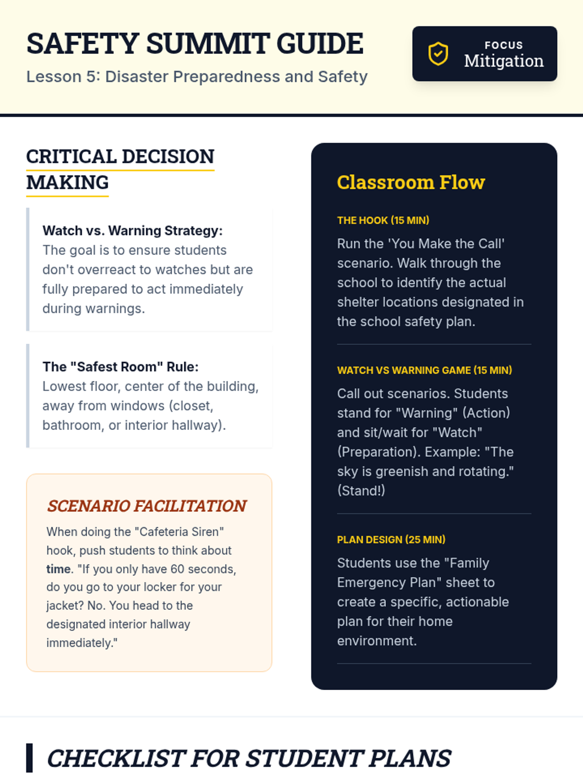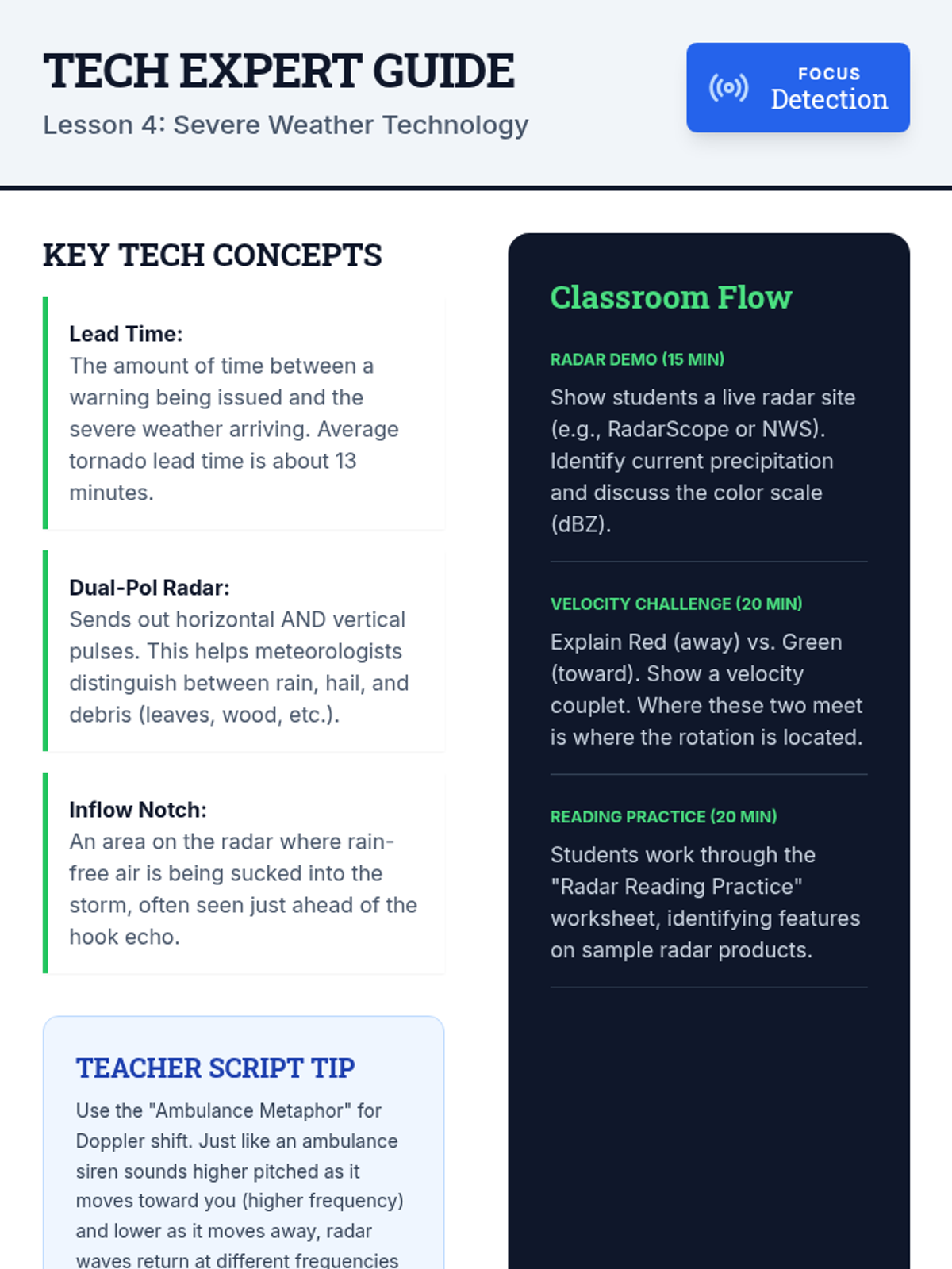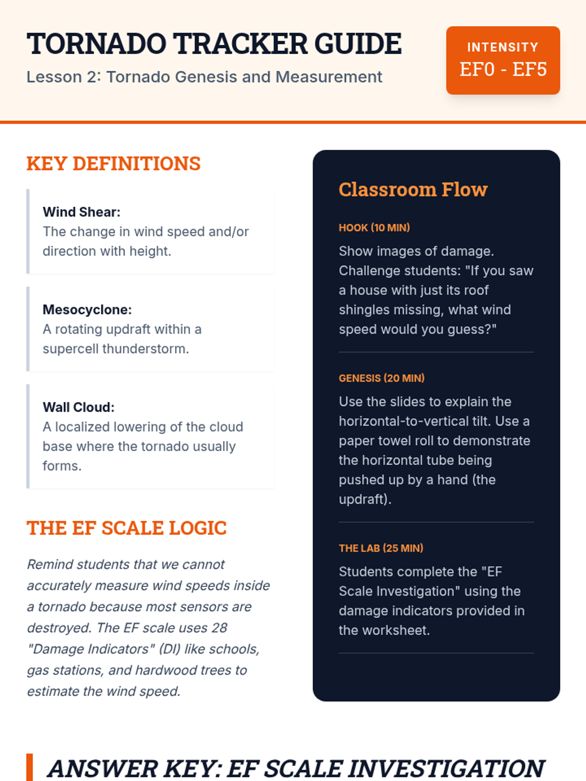 This middle school Earth Science sequence explores the mechanics, tracking, and safety protocols of severe weather systems. Students analyze the life cycles of thunderstorms, the genesis of tornadoes, the heat-driven power of hurricanes, and the technology used to predict these events to improve disaster preparedness.