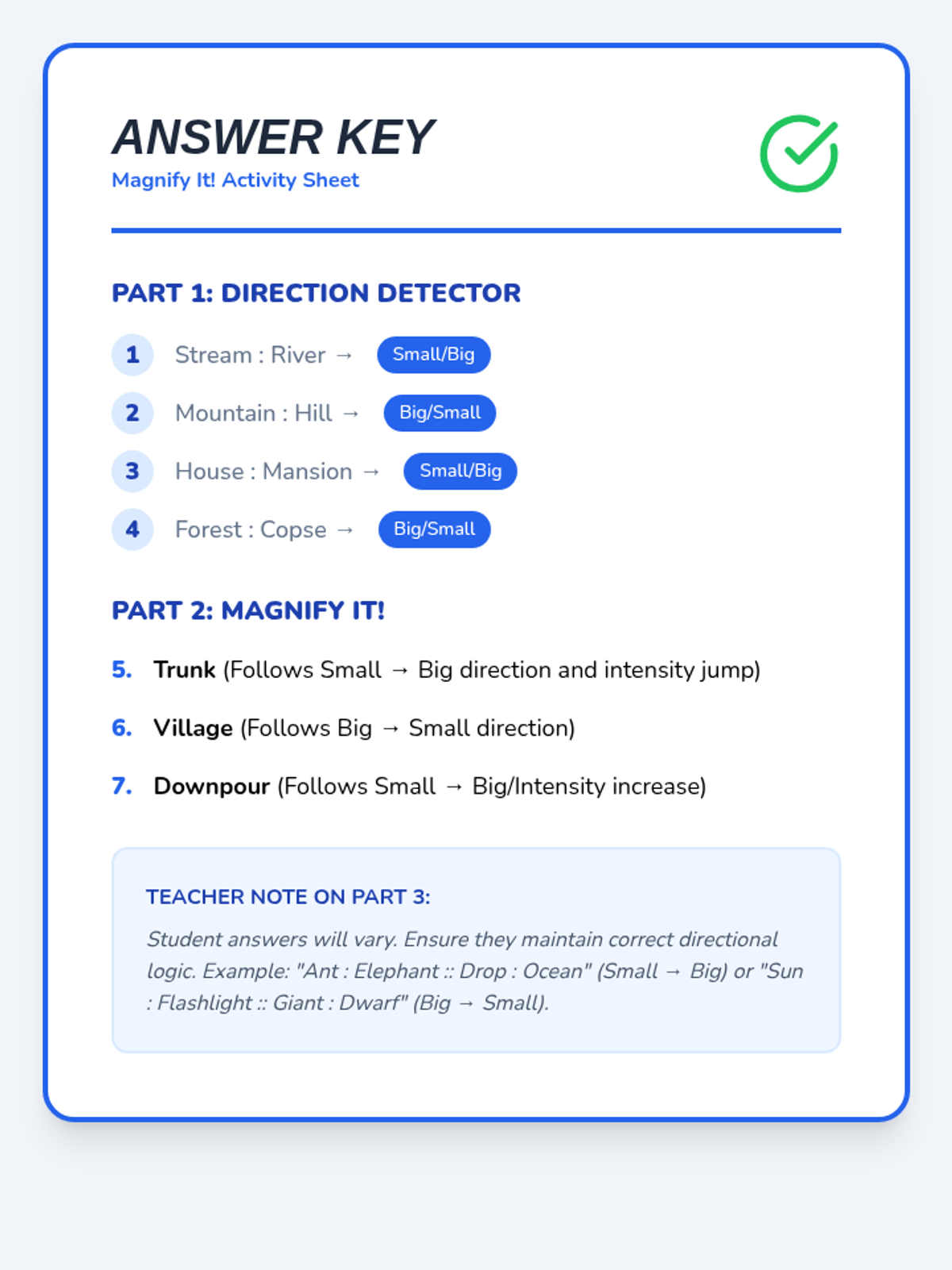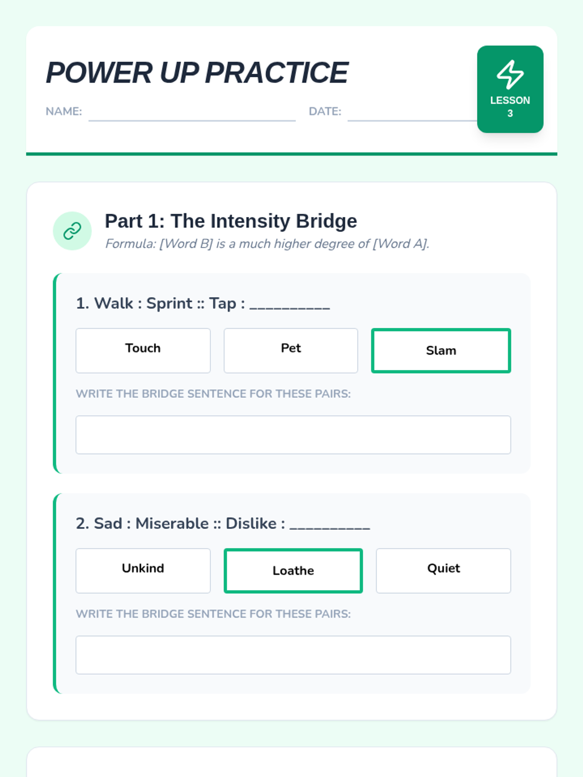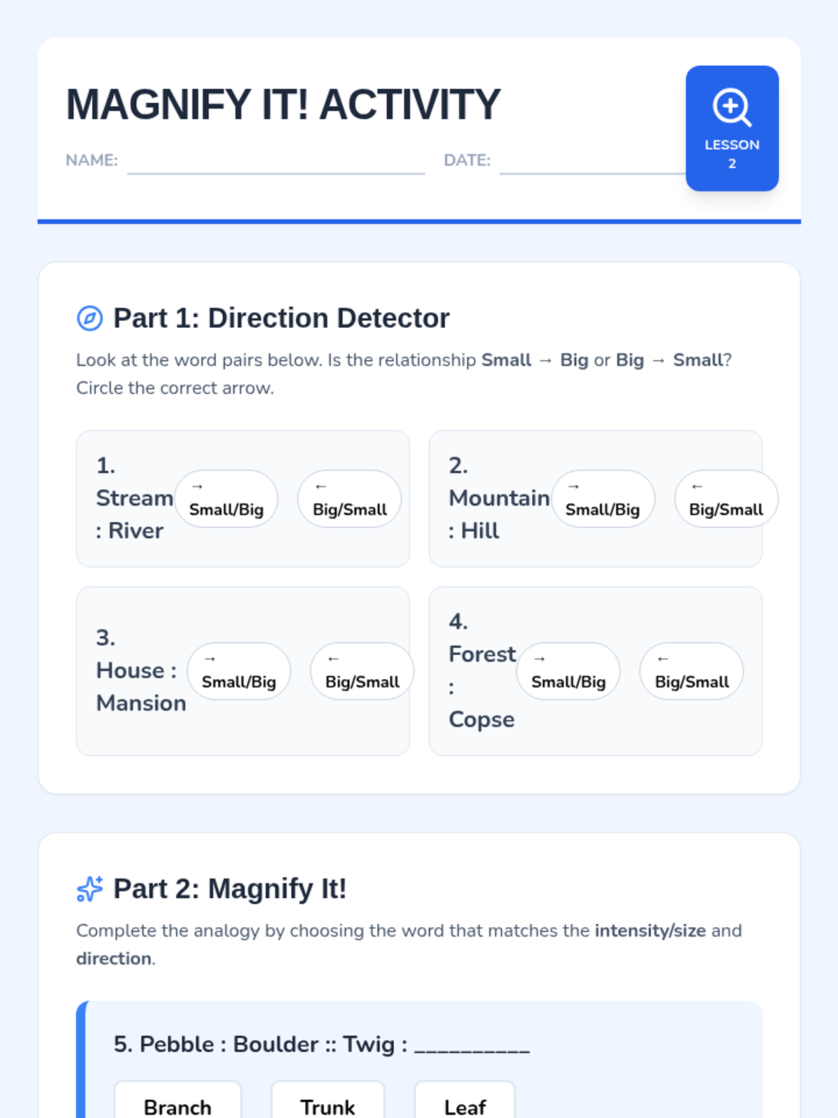This sequence guides 4th-grade students through the nuanced world of degree analogies. Students will learn to distinguish between words based on intensity, size, speed, and strength, moving beyond simple synonyms to understand how shades of meaning create logical relationships.