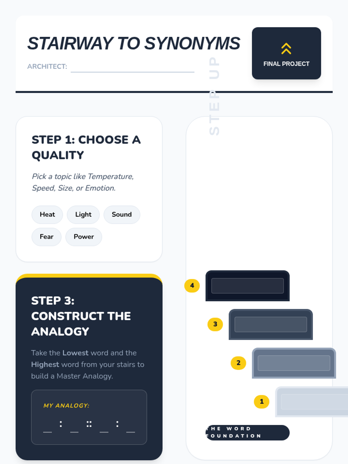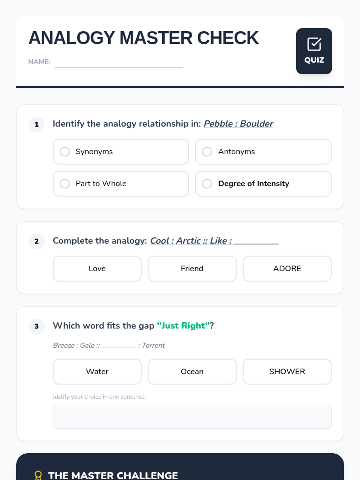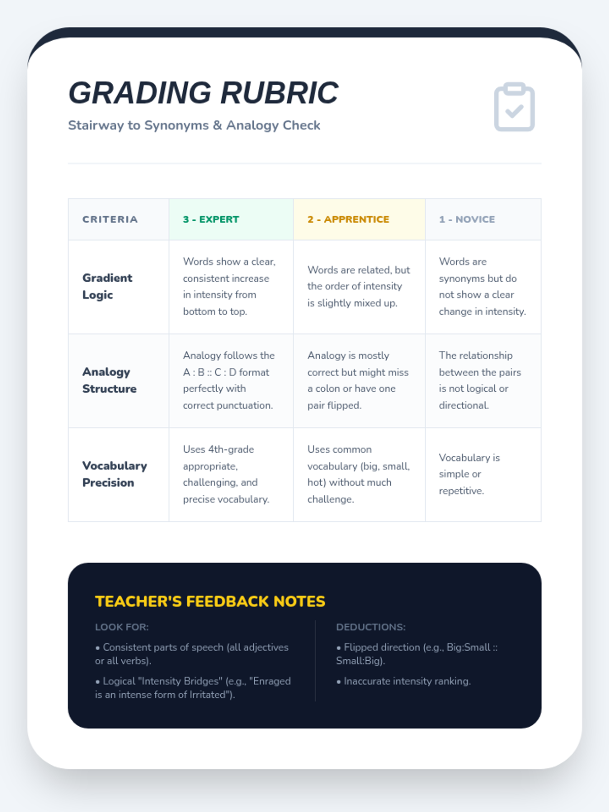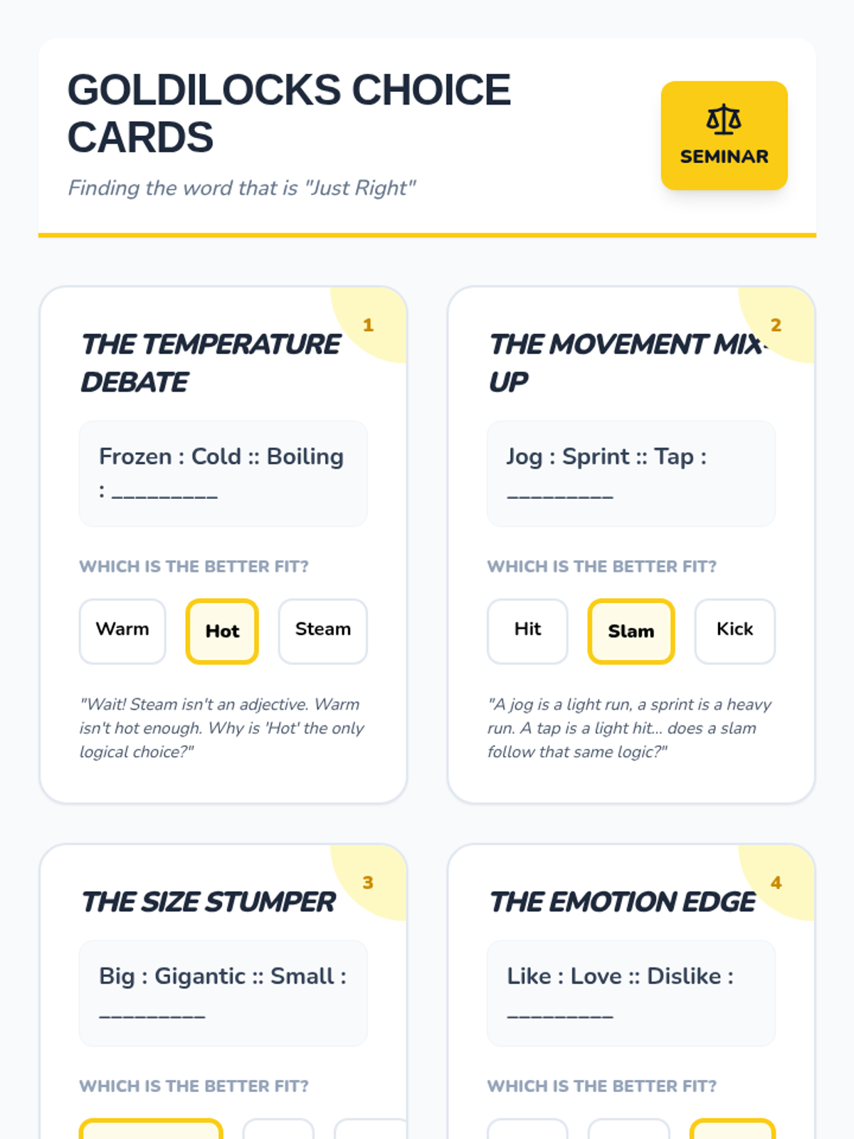 This sequence guides 4th-grade students through the nuanced world of degree analogies. Students will learn to distinguish between words based on intensity, size, speed, and strength, moving beyond simple synonyms to understand how shades of meaning create logical relationships.