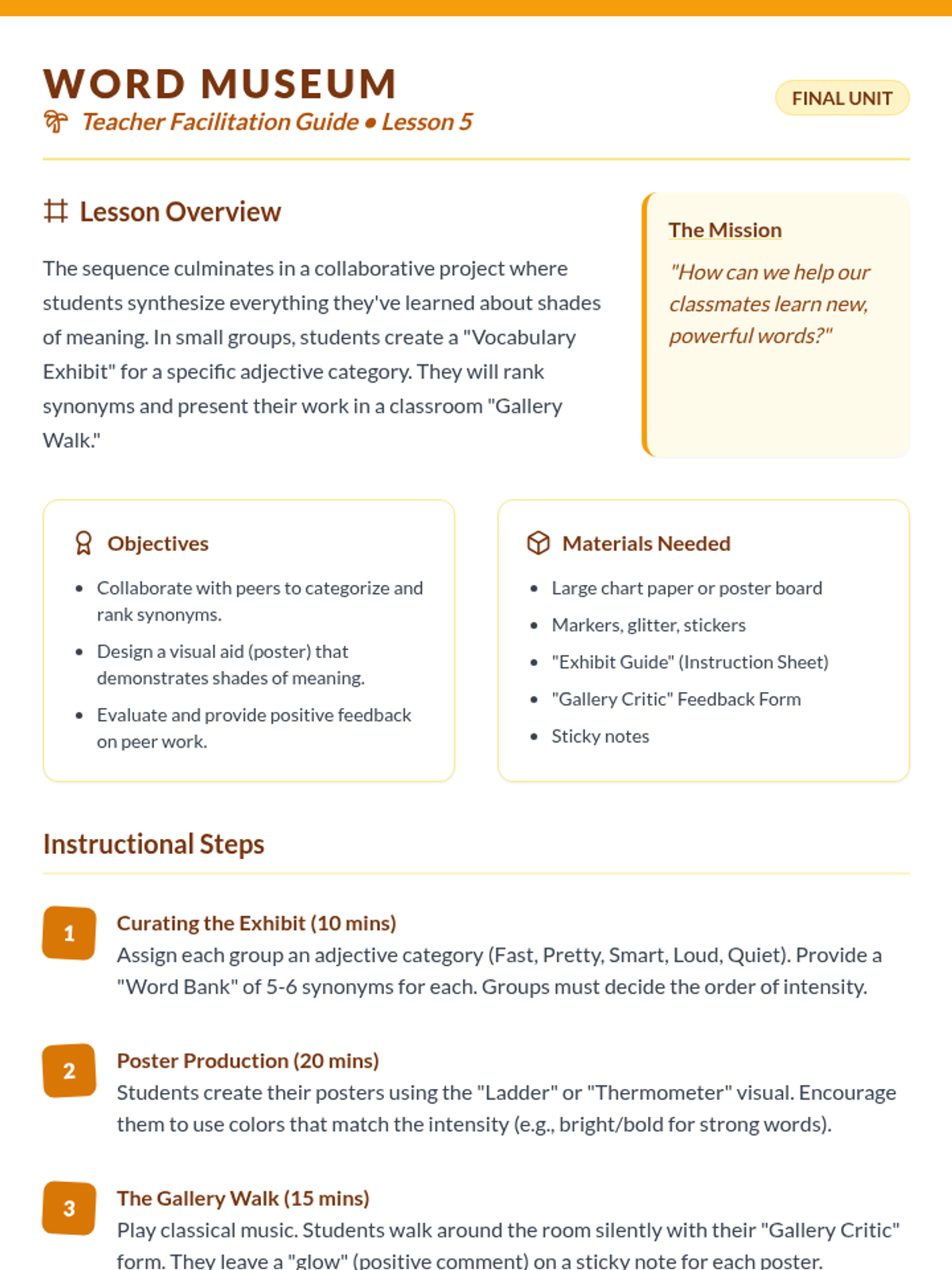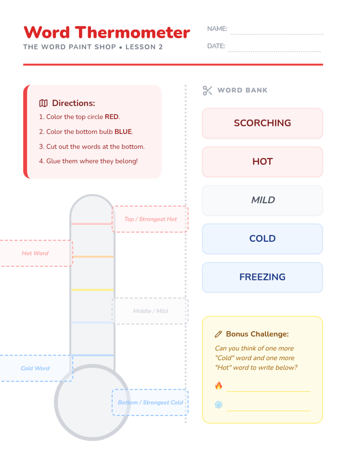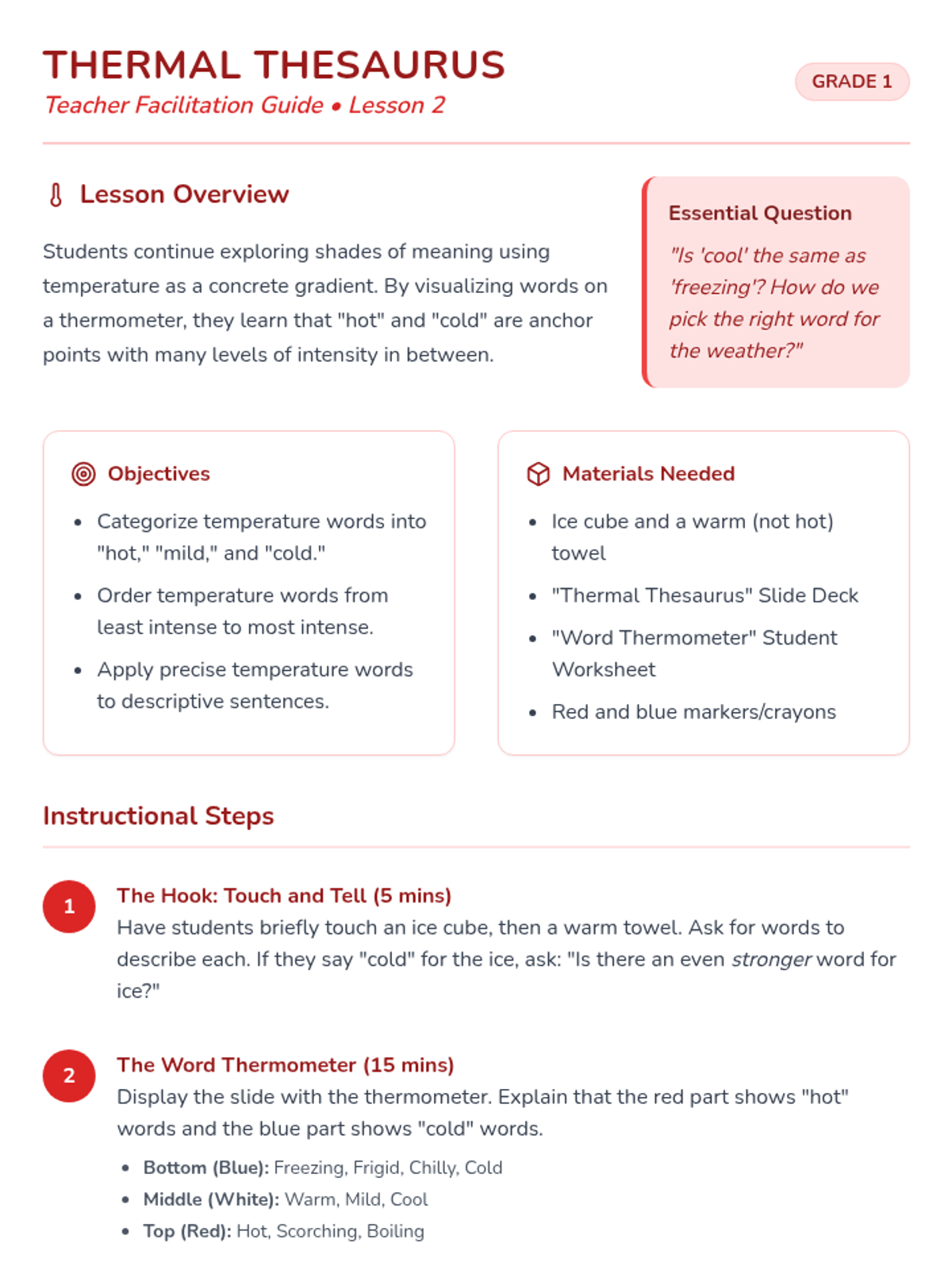 This sequence introduces 1st-grade students to shades of meaning in adjectives. Students learn to rank words by intensity using visual models like ladders and thermometers, eventually applying these skills to revise sentences and create collaborative vocabulary posters.