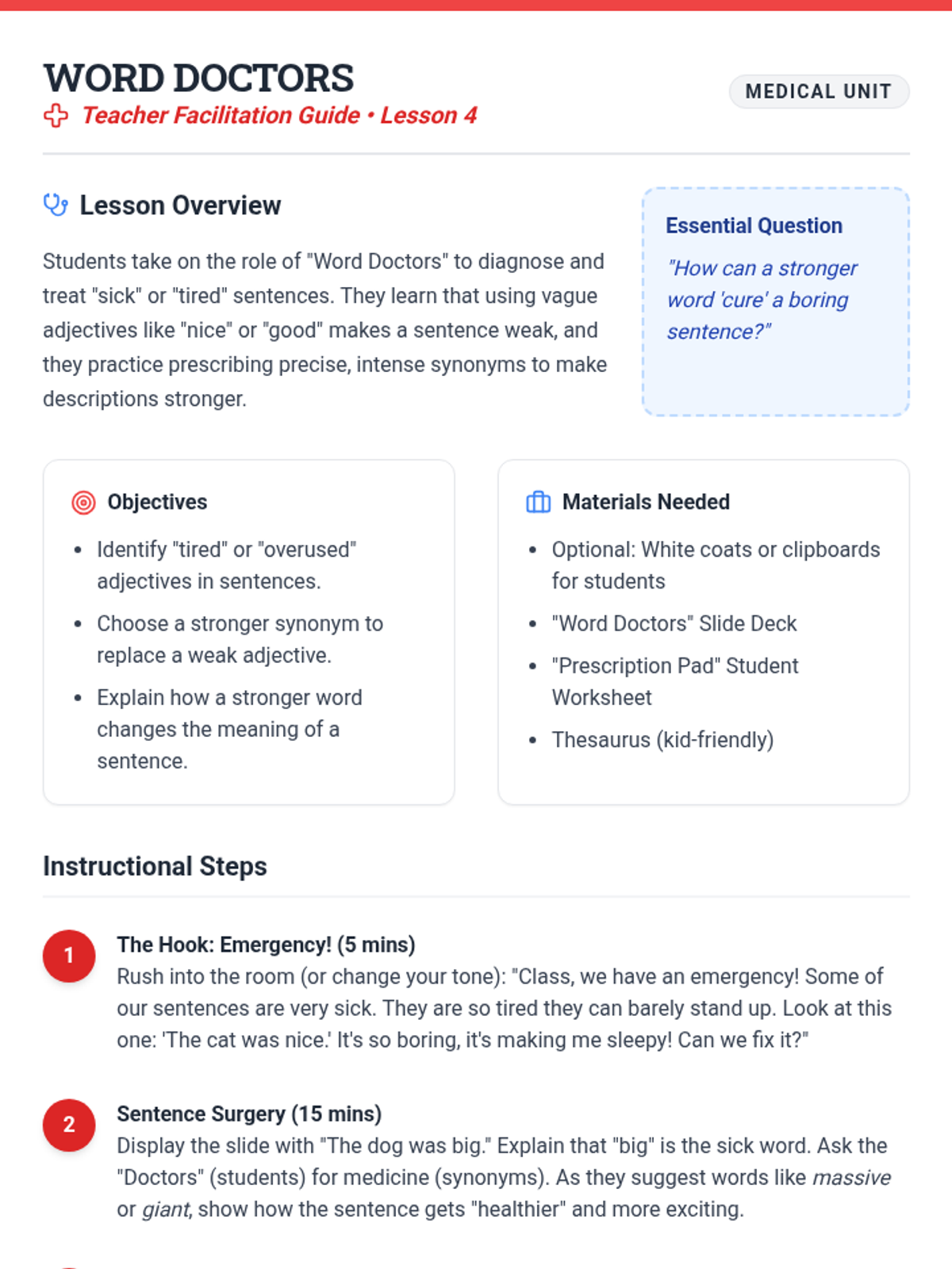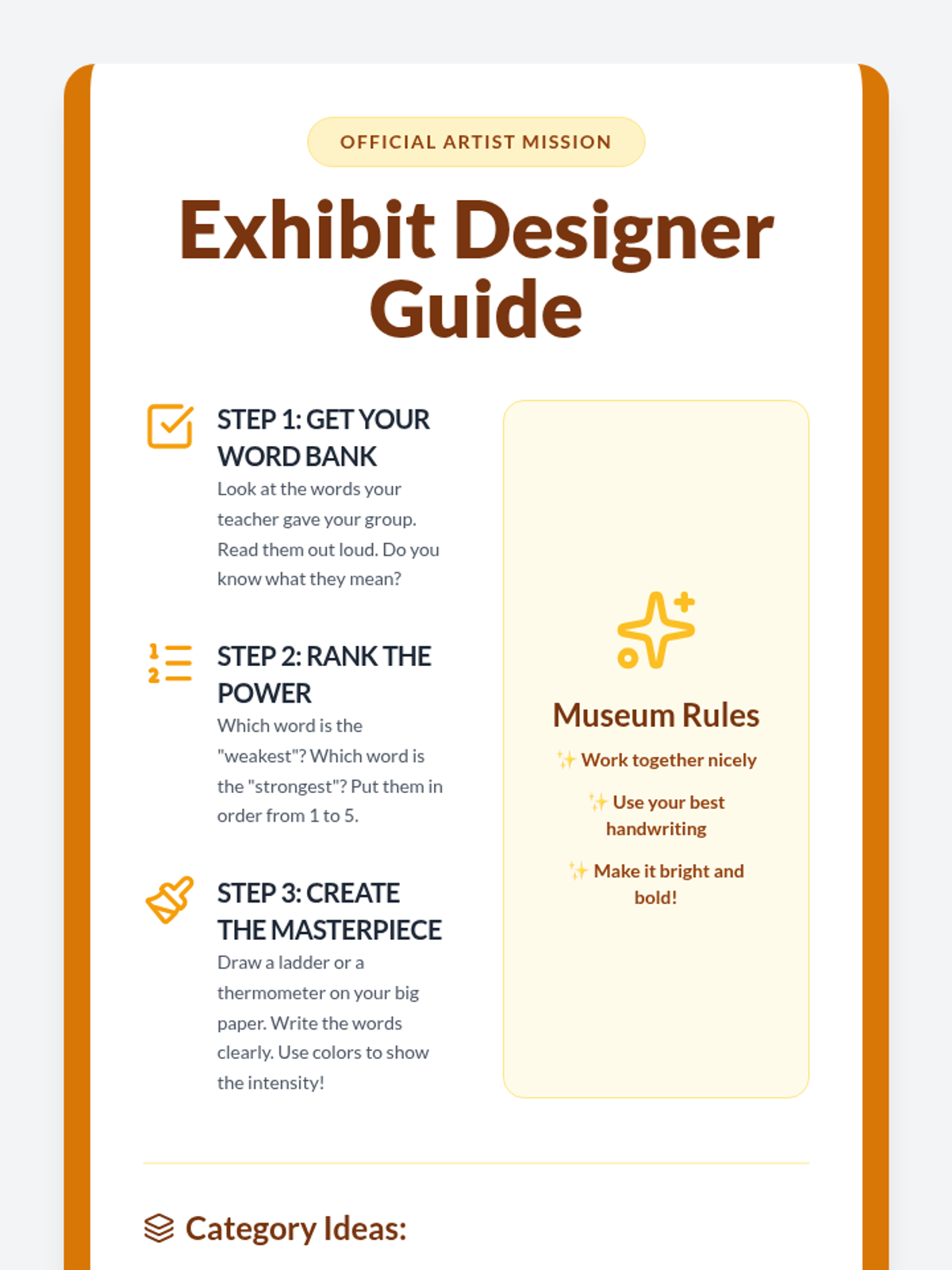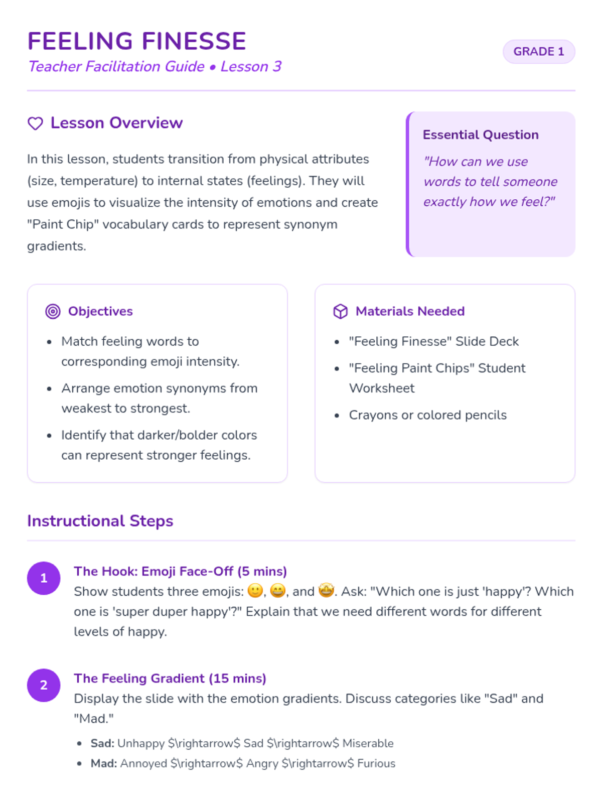 This sequence introduces 1st-grade students to shades of meaning in adjectives. Students learn to rank words by intensity using visual models like ladders and thermometers, eventually applying these skills to revise sentences and create collaborative vocabulary posters.