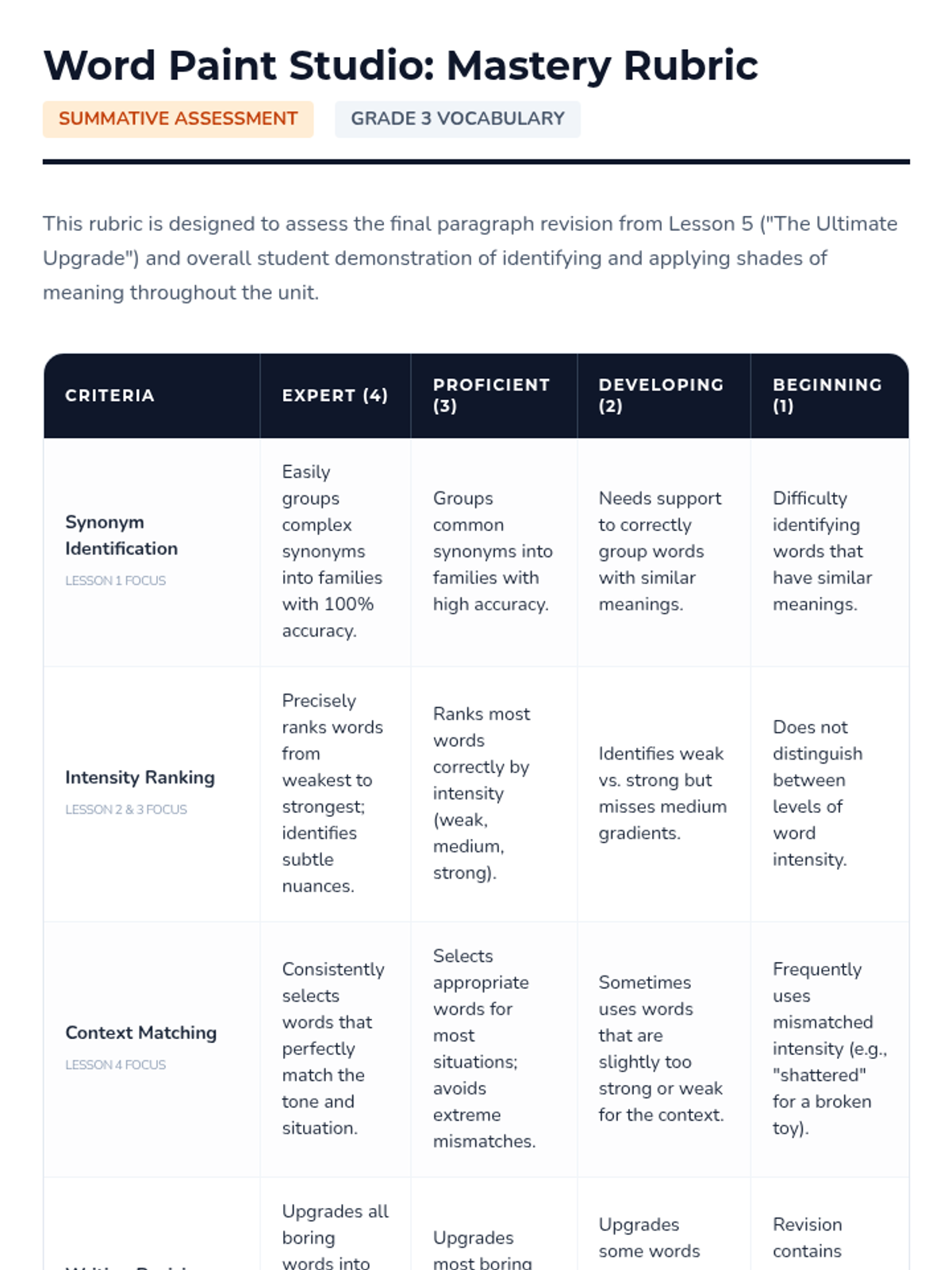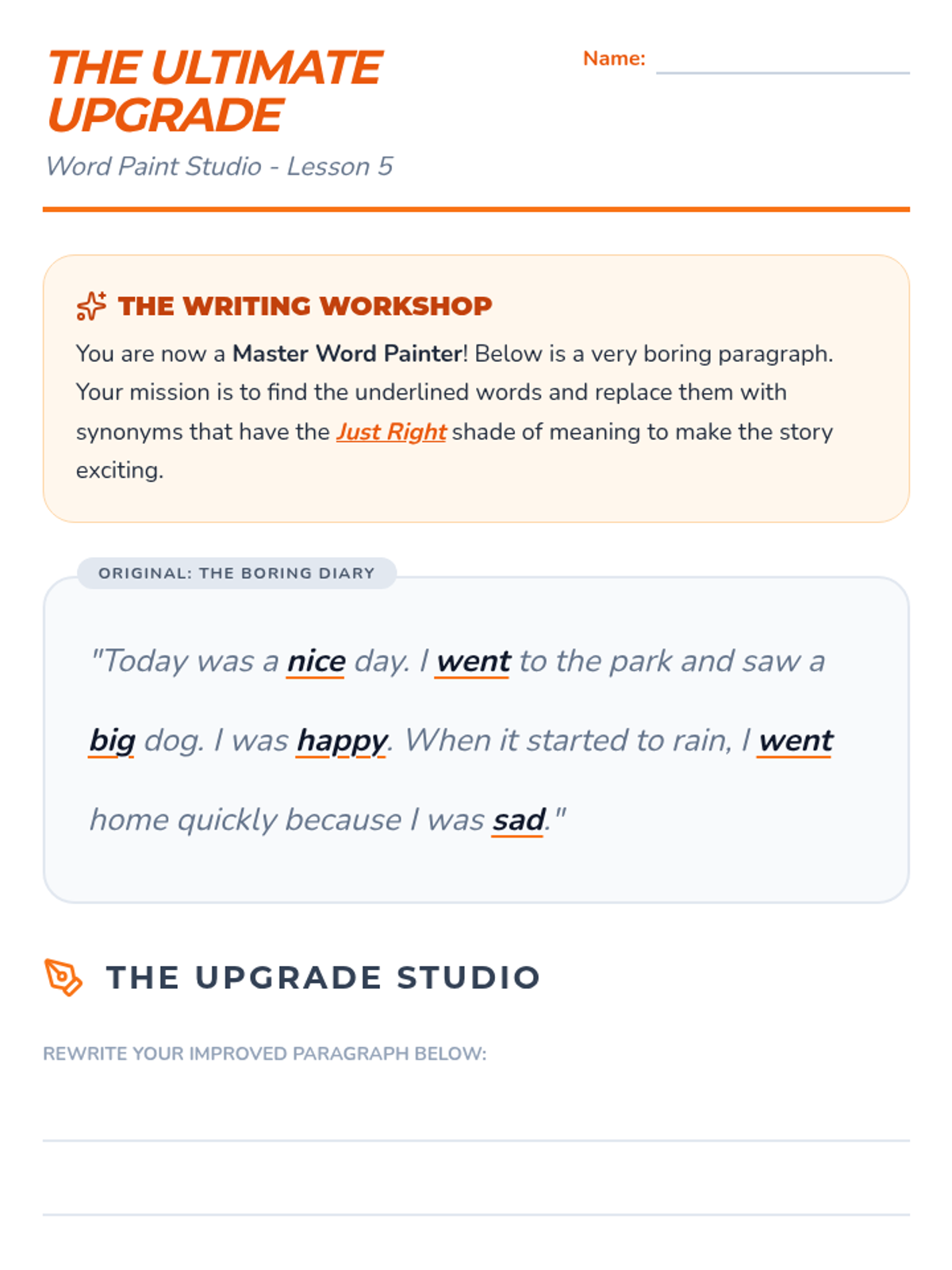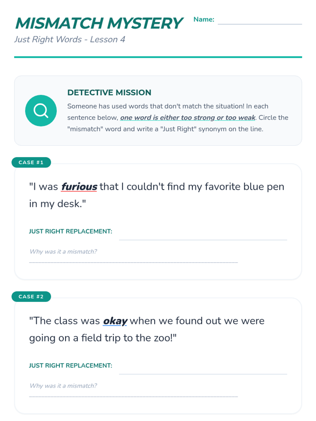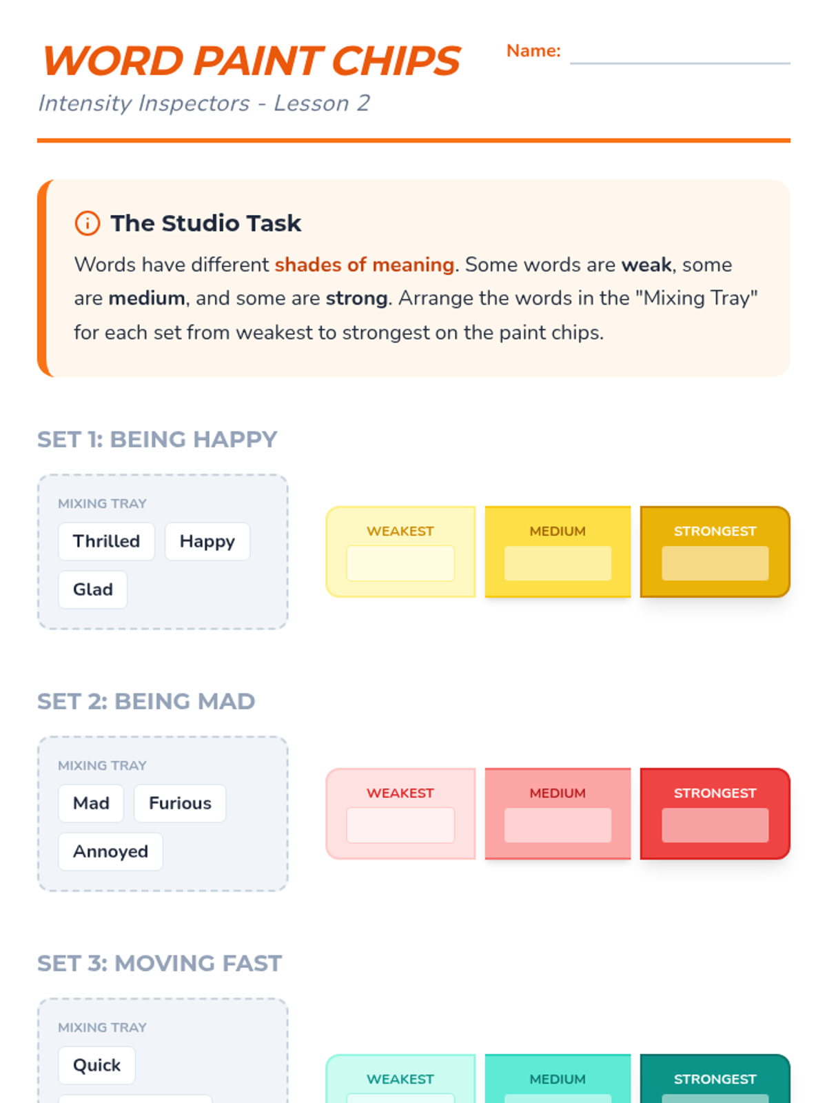 Students explore the subtleties of language by examining how related words carry different levels of intensity and emotion. They progress from grouping synonyms to ranking them on 'word thermometers' and revising text for precise, vivid communication.