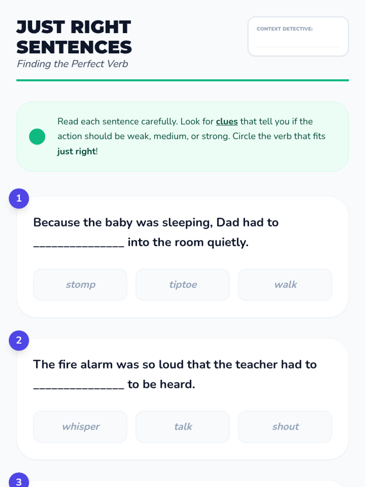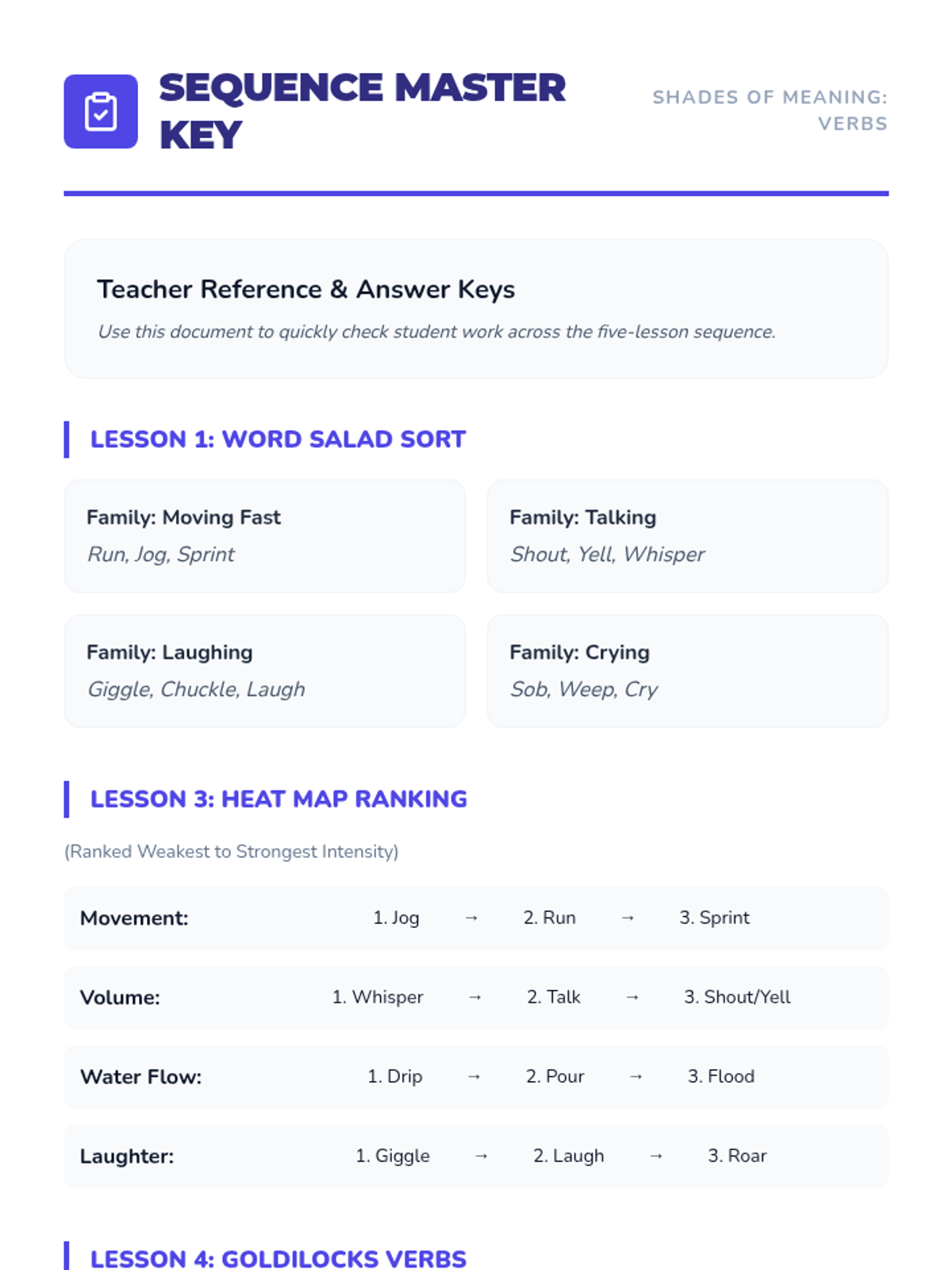 This sequence guides 2nd-grade students through the exploration of verbs that share similar meanings but differ in intensity. Learners practice ranking synonyms from weakest to strongest and selecting precise verbs to convey exact meanings in their own storytelling.