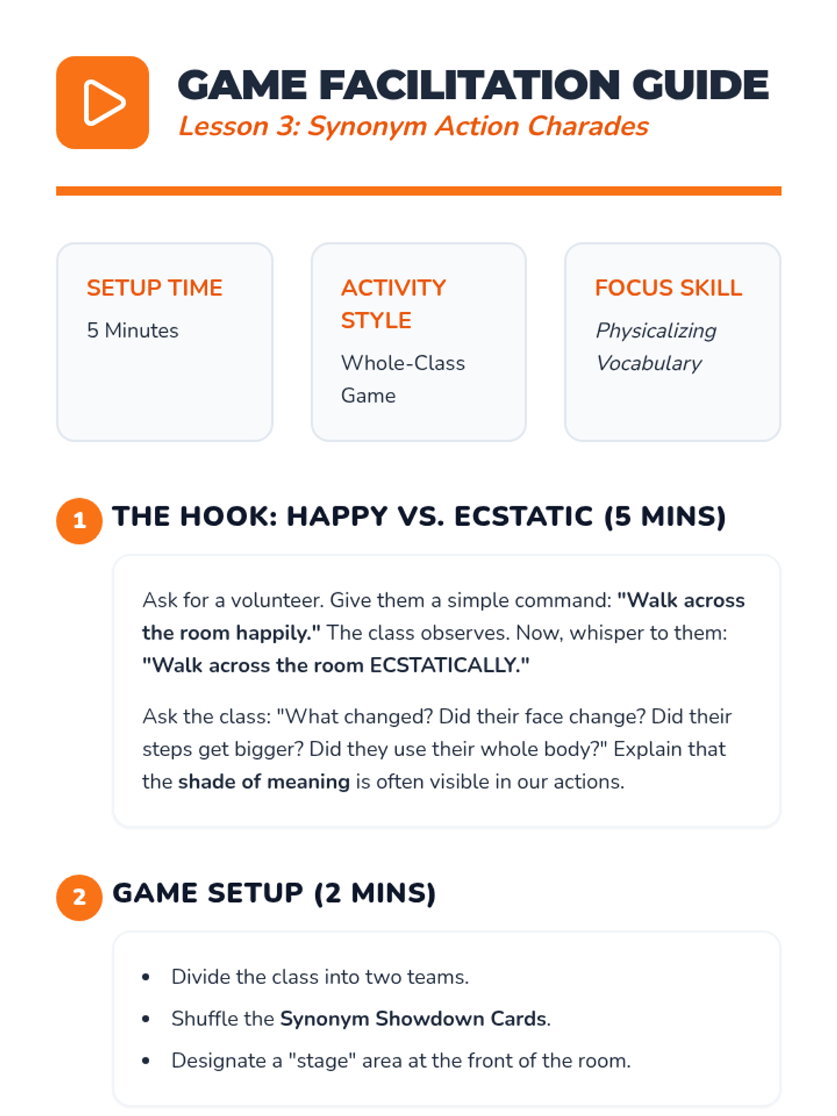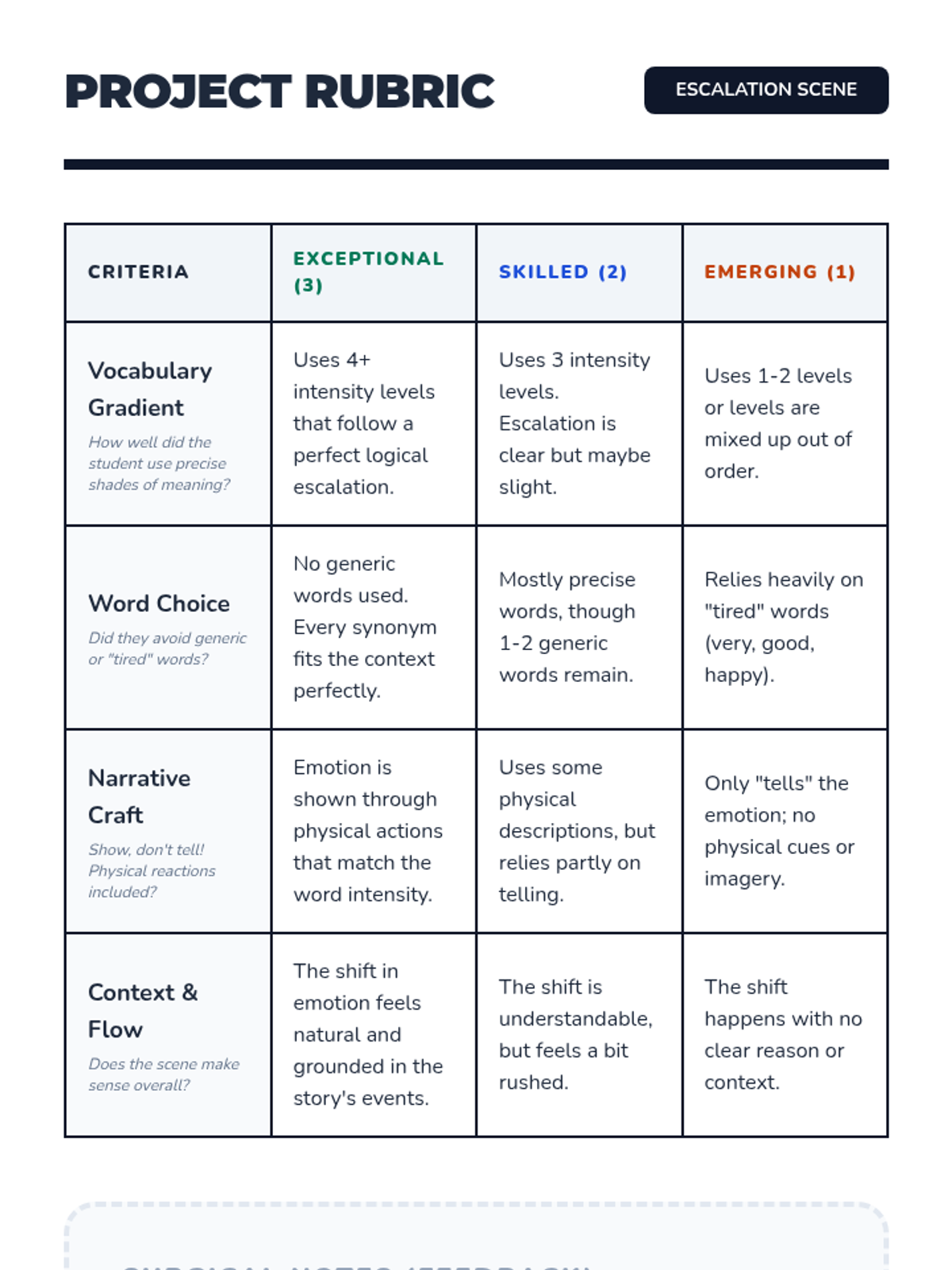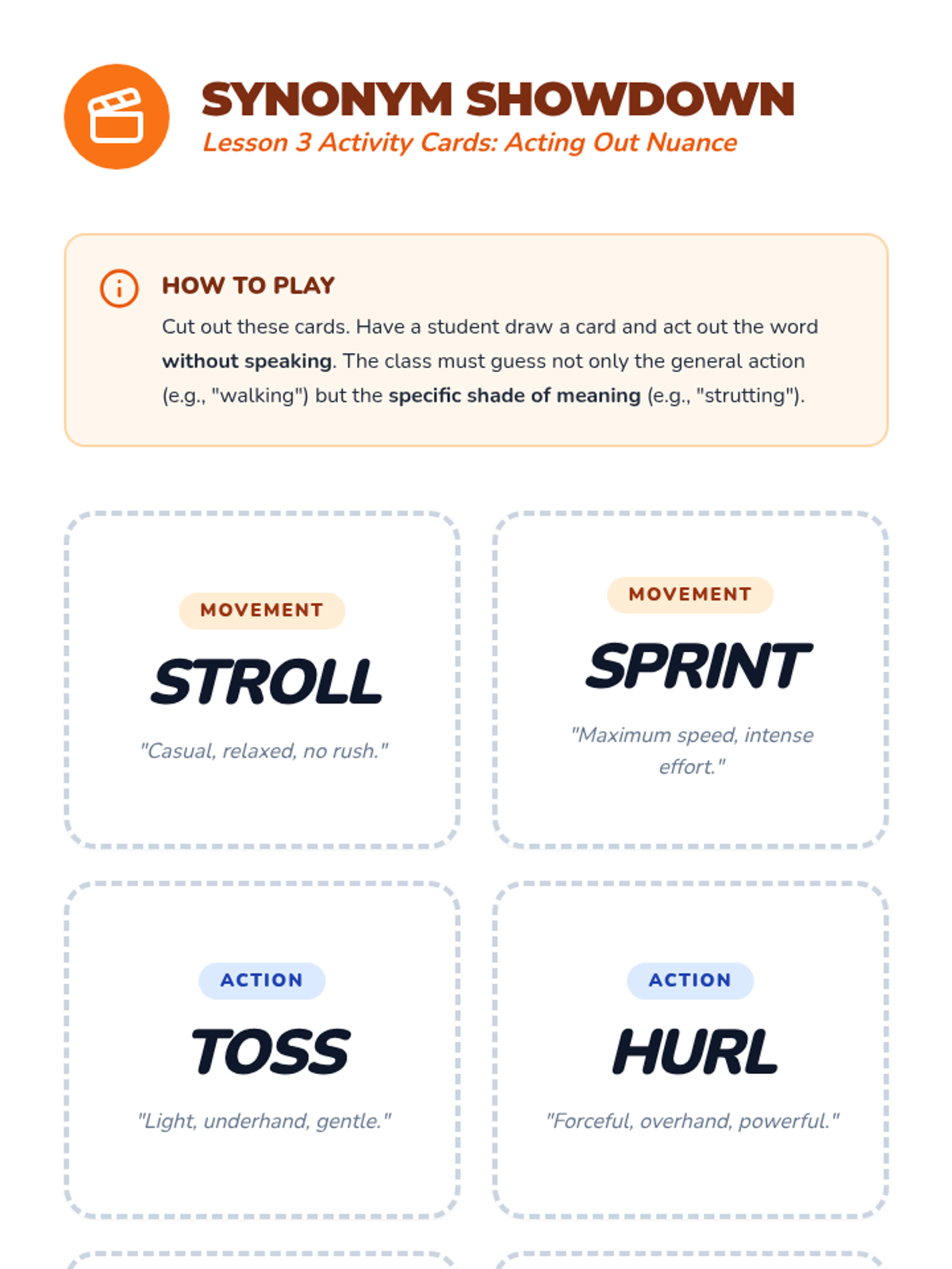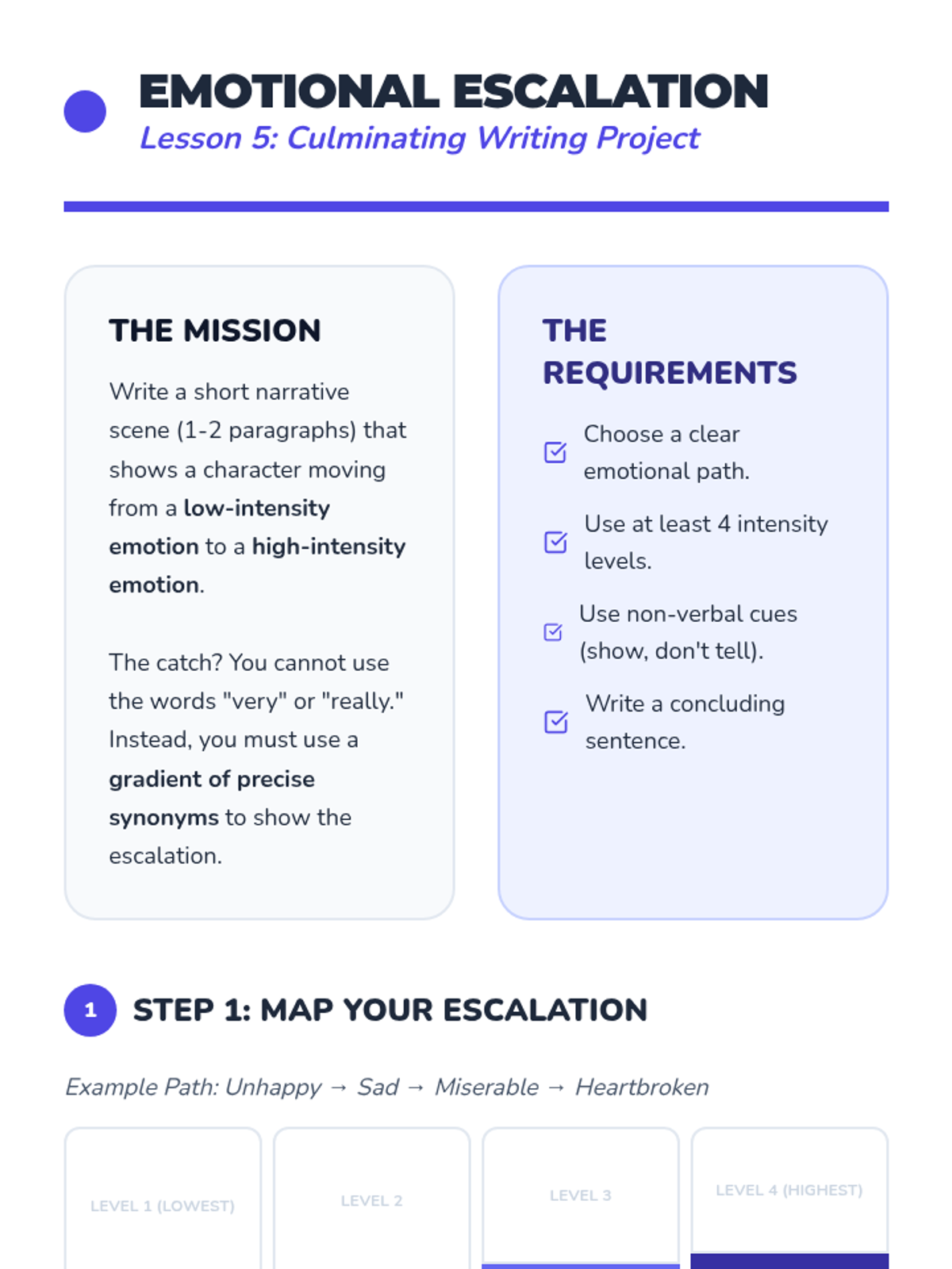 This 5-lesson sequence explores the nuances of vocabulary through intensity gradients and emotional connotations. Students transition from ranking synonyms by strength to applying precise word choices in narrative writing, mastering how specific language shapes tone and impact.