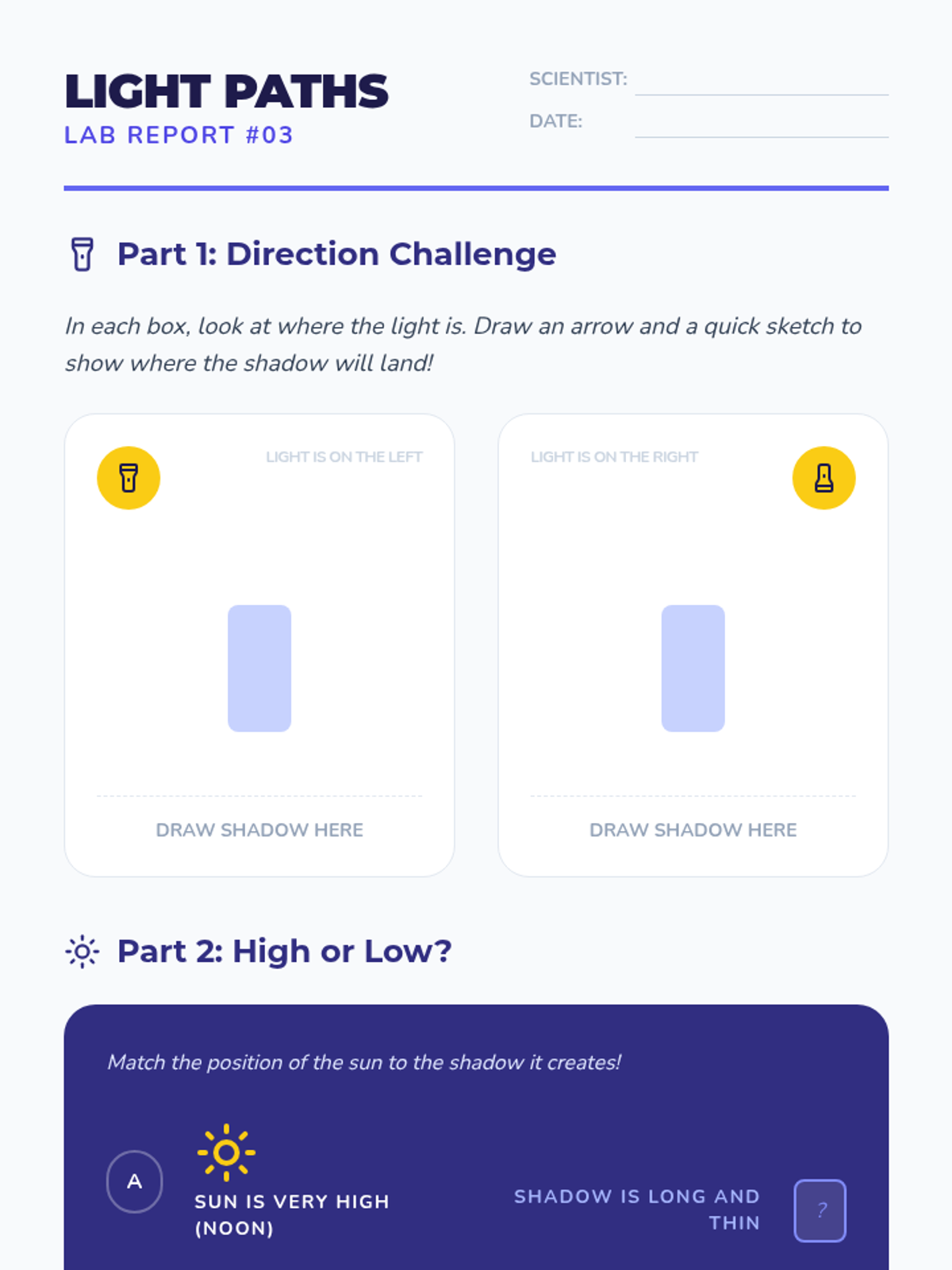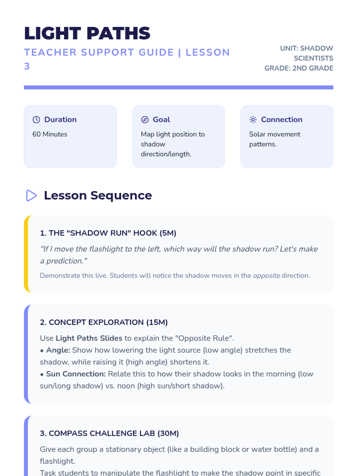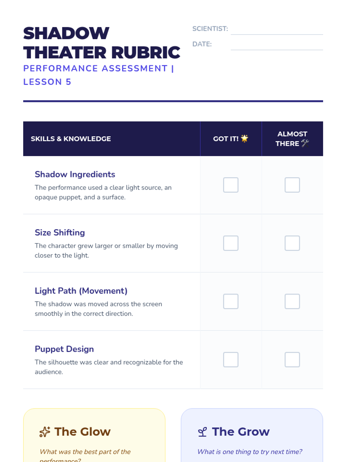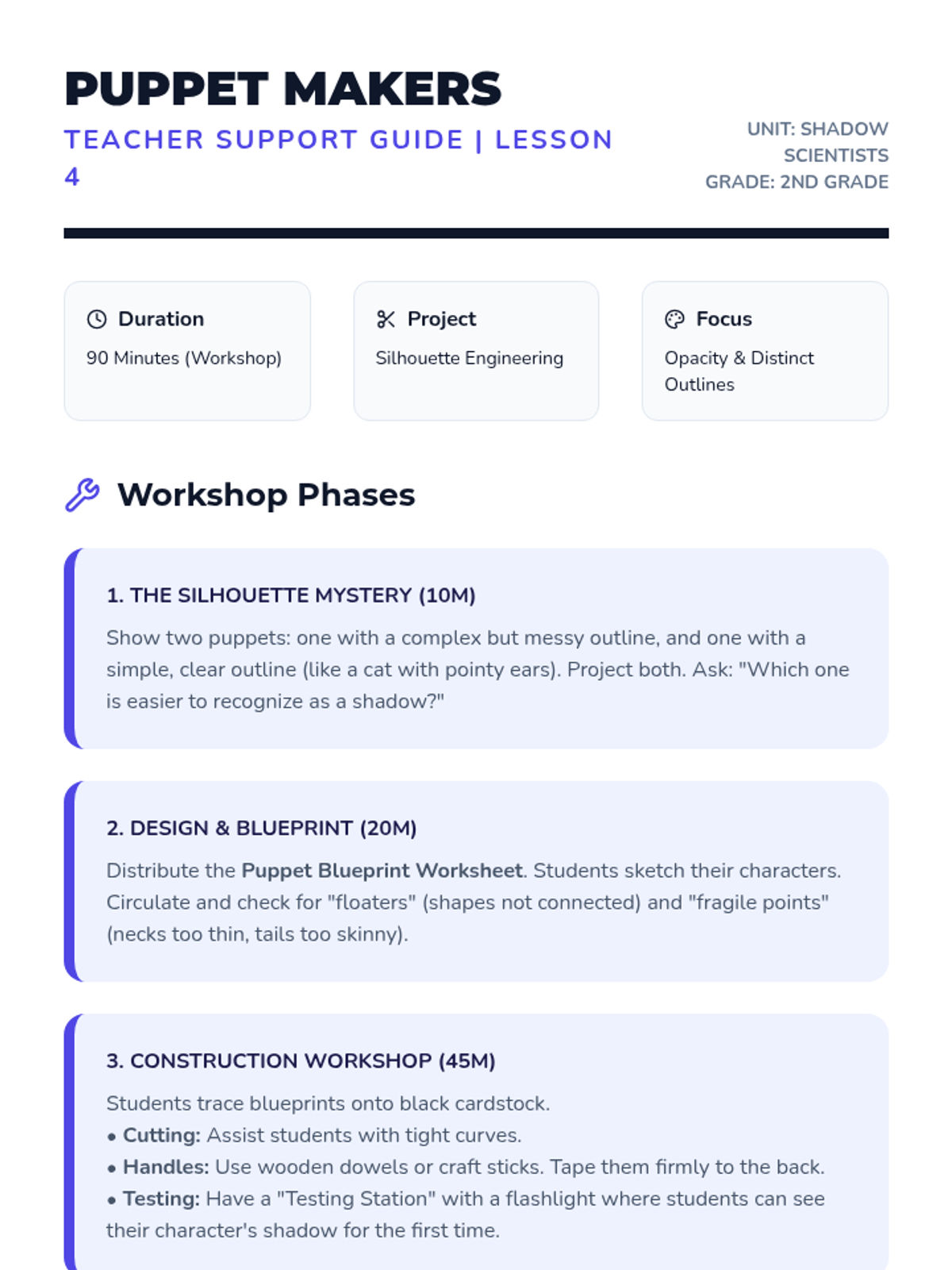 Students explore the physics of light through hands-on shadow experimentation, culminating in a shadow puppet performance that demonstrates their understanding of light sources, objects, and spatial relationships.