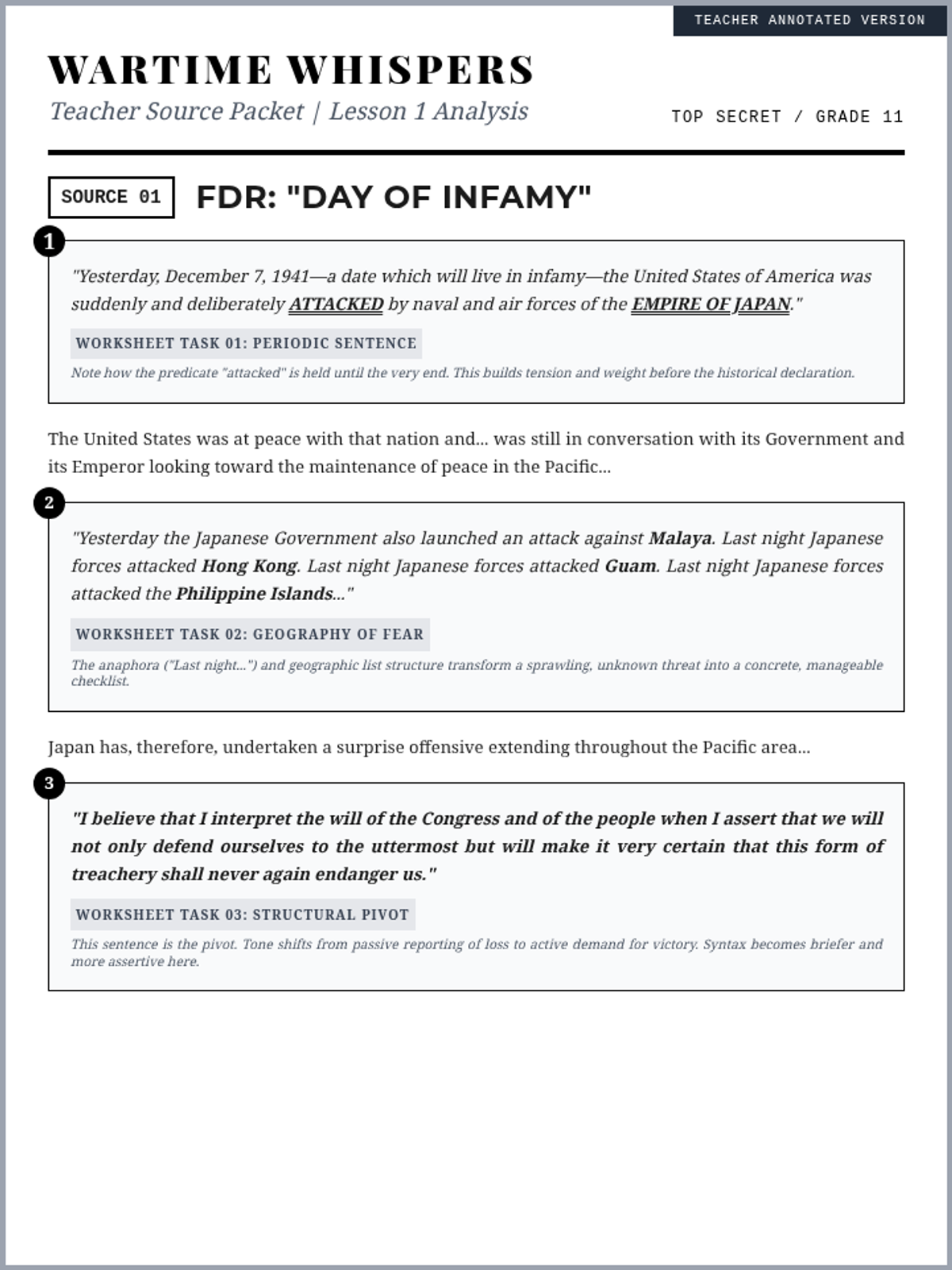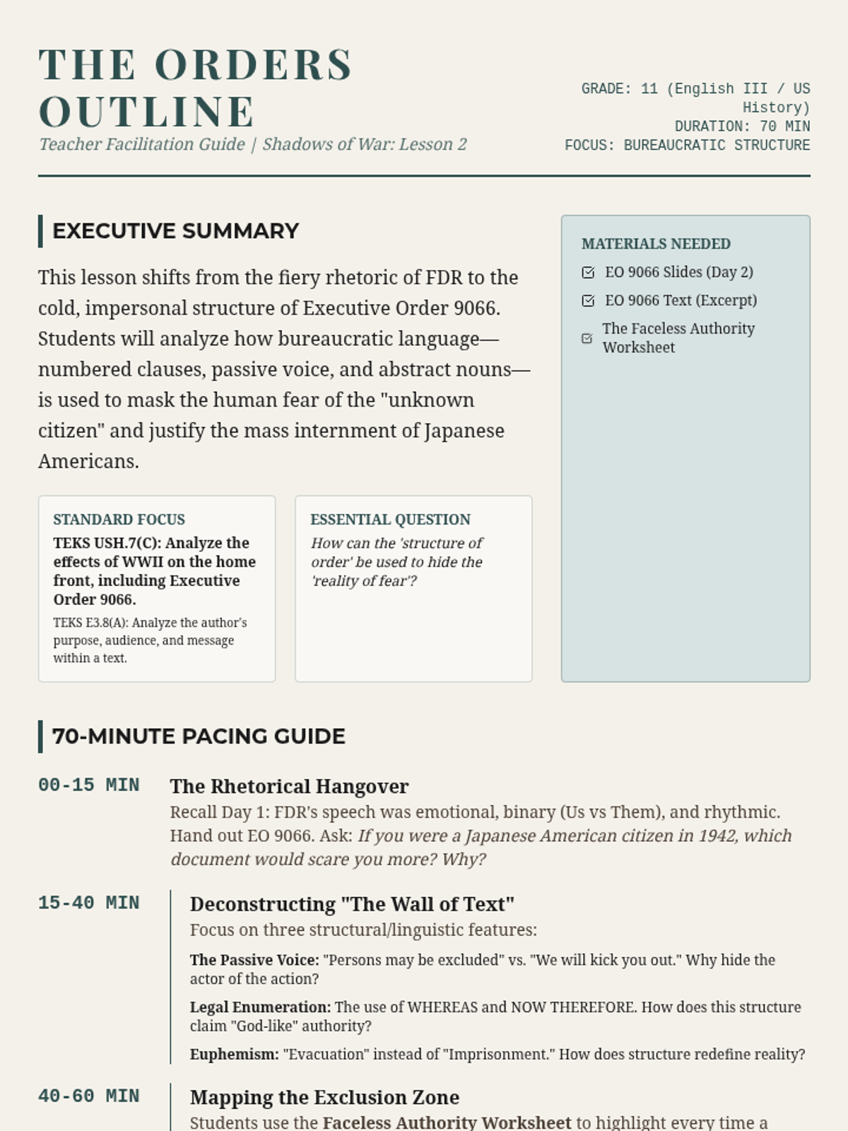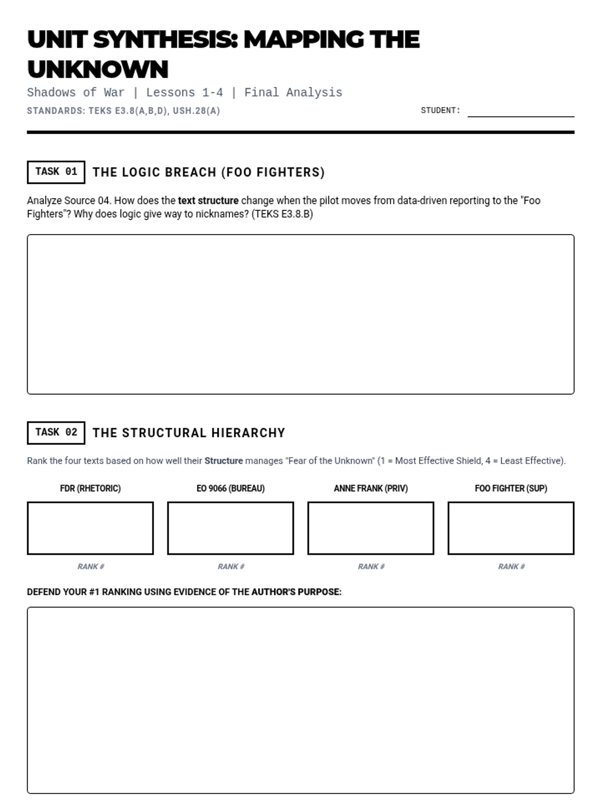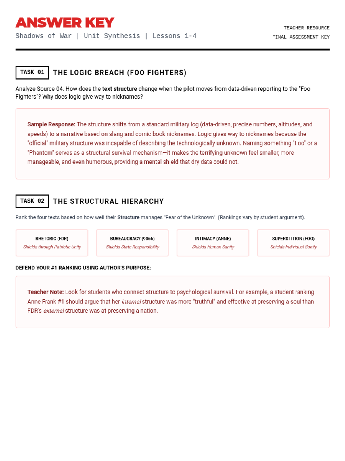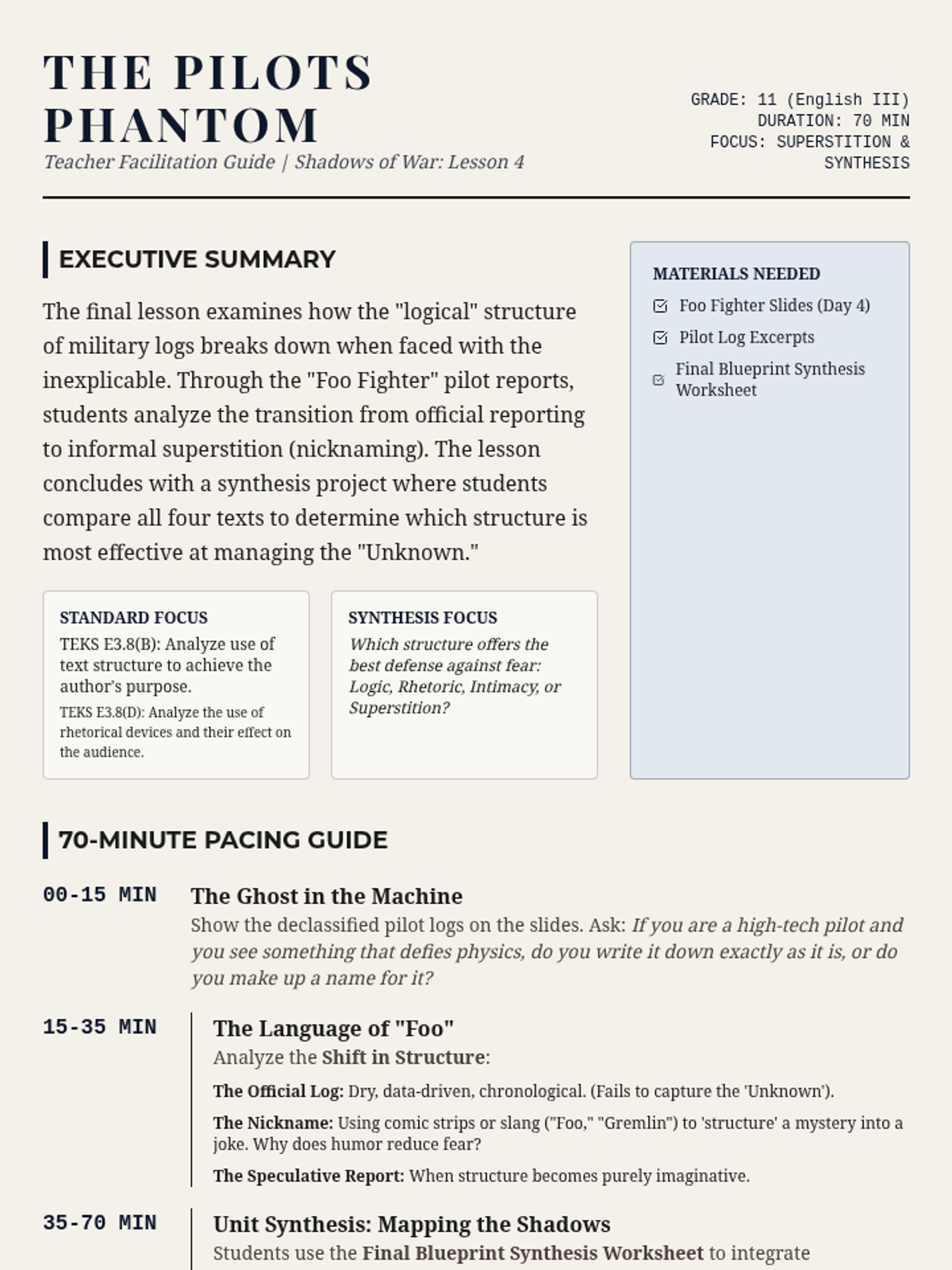 A 4-part unit for 11th-grade English/History analyzing text structure and author's purpose through the lens of fear and the unknown during WWII, examining political rhetoric, legal orders, personal diaries, and wartime superstition.
